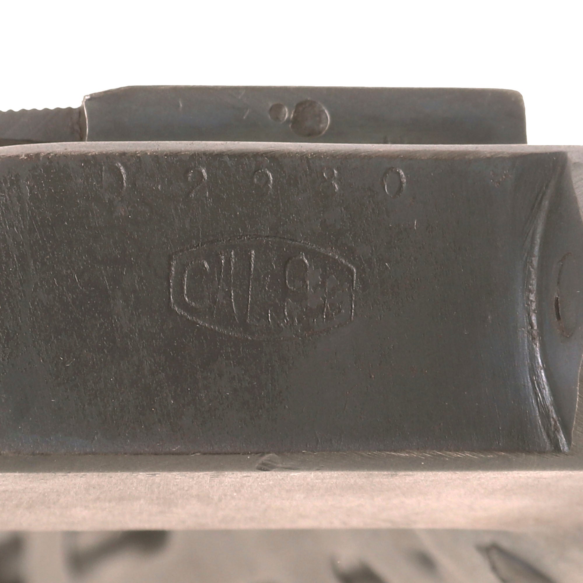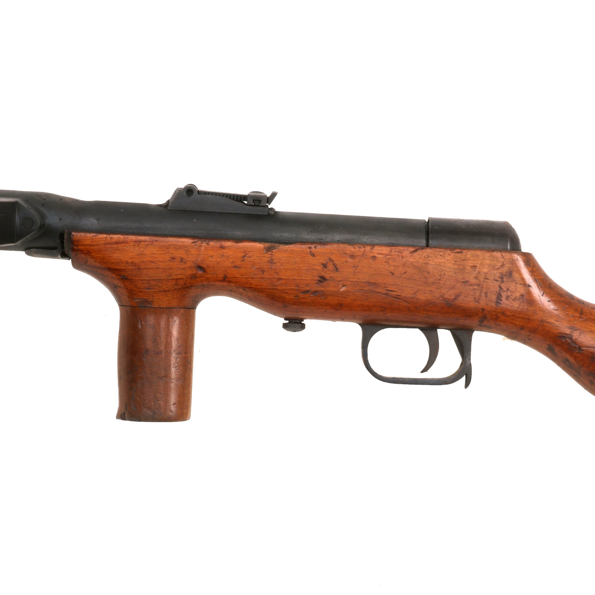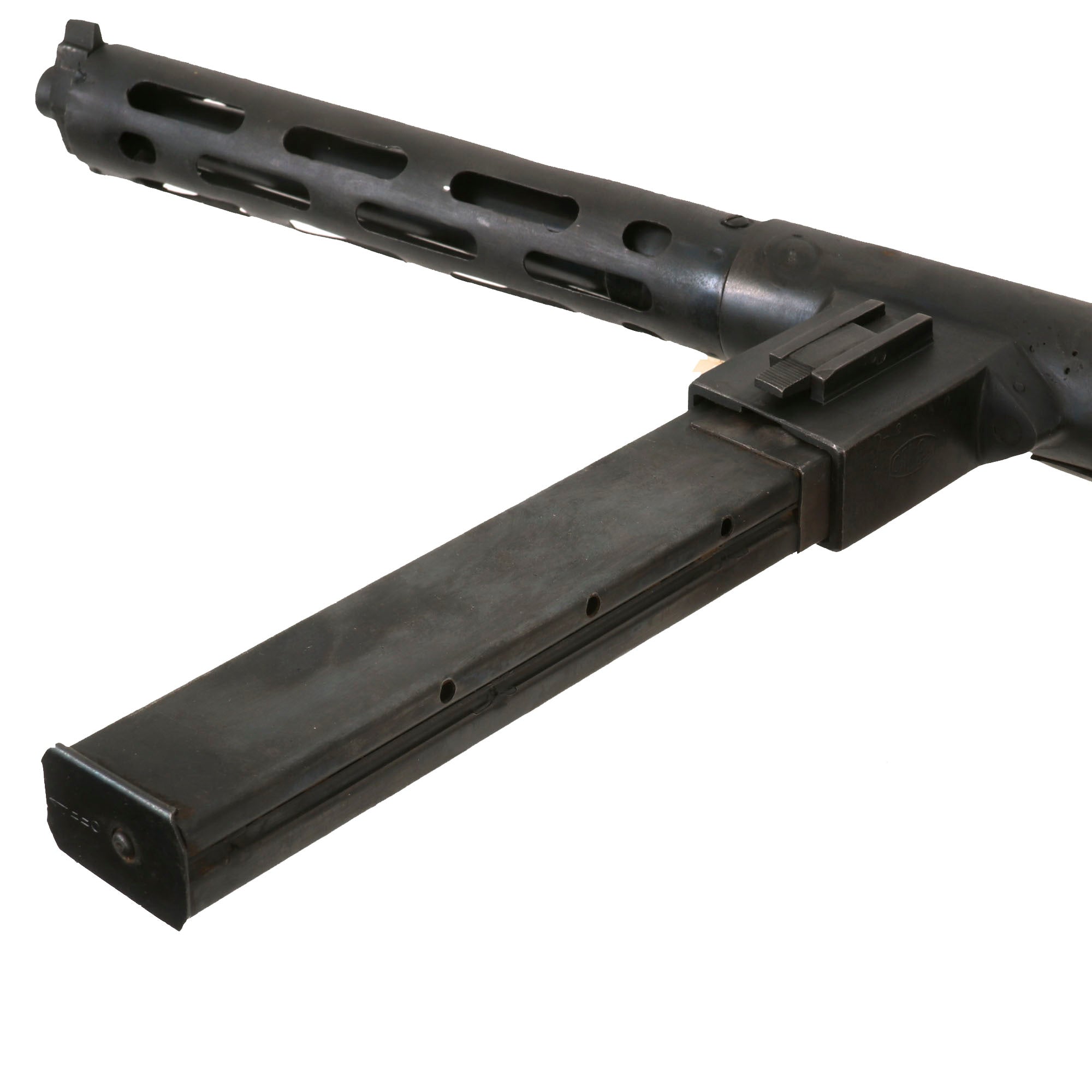 This is a very nice example of the ERMA EMP (Erma Maschinenenpistole) designed and manufactured by Erfurter Maschinenfabrik (Erfurt Machine Factory or ERMA), usually simply called ERMA Werke. The magazine well is marked with serial number D - 2980, over a CAL.9.L. marking, indicating chambering in 9mm Largo, the standard round used for guns supplied to Spain. It also is marked on the rear receiver cup with a Crossed Sword and Fasces, the insignia of the Spanish Guardia Civil (Civil Guard). We do not know when these markings were added, but we assume during the Francoist era, when the Civil Guard was utilized extensively.