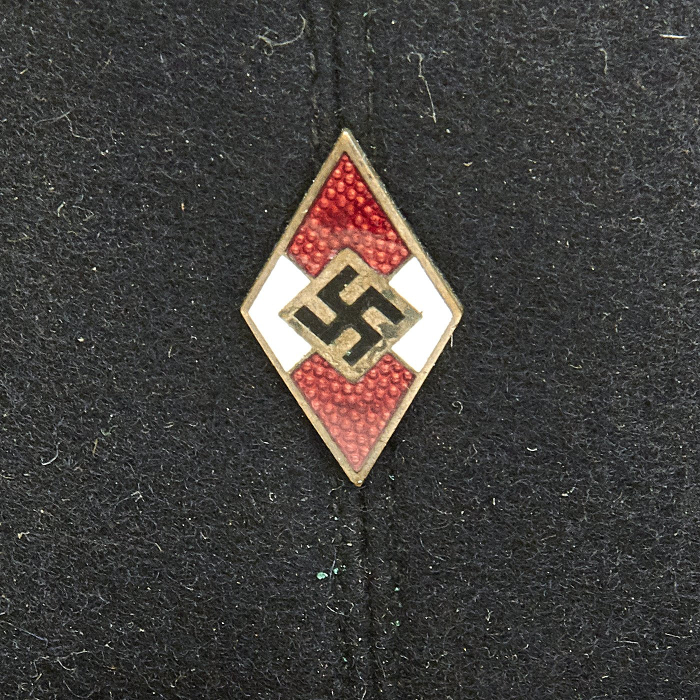 In the front of the cap is an enameled metal rhomboid diamond shaped HJ emblem, which consists of a black mobile was inside a white square diamond which is surrounded by alternating white and red quadrants. The emblem is in great shape, with just the usual age related oxidation, and is held on by the standard bent pins on the rear.
