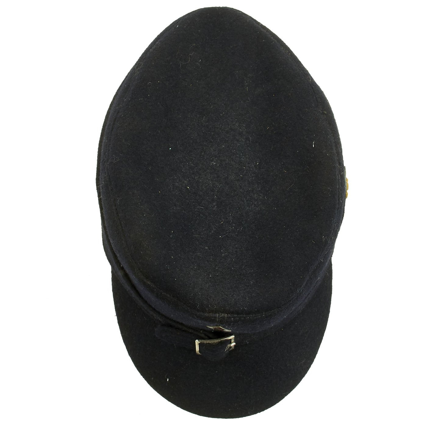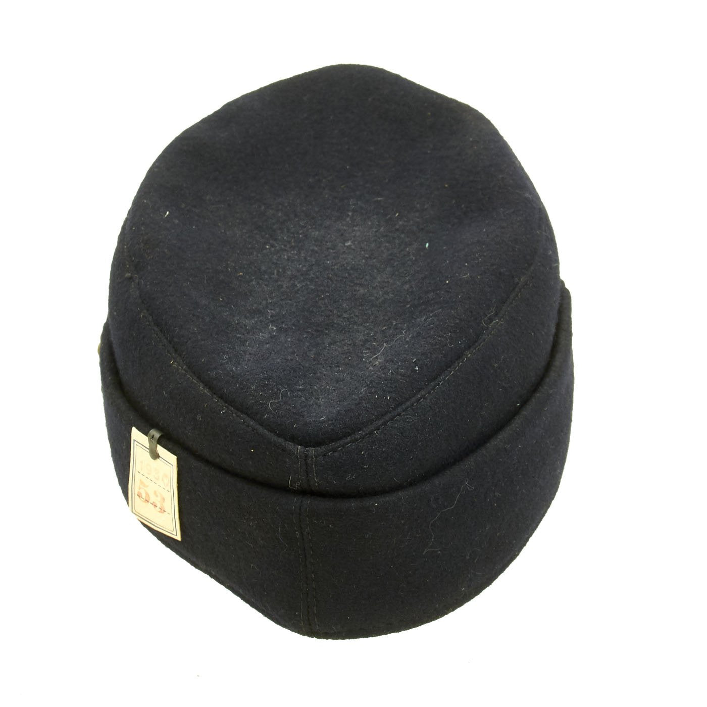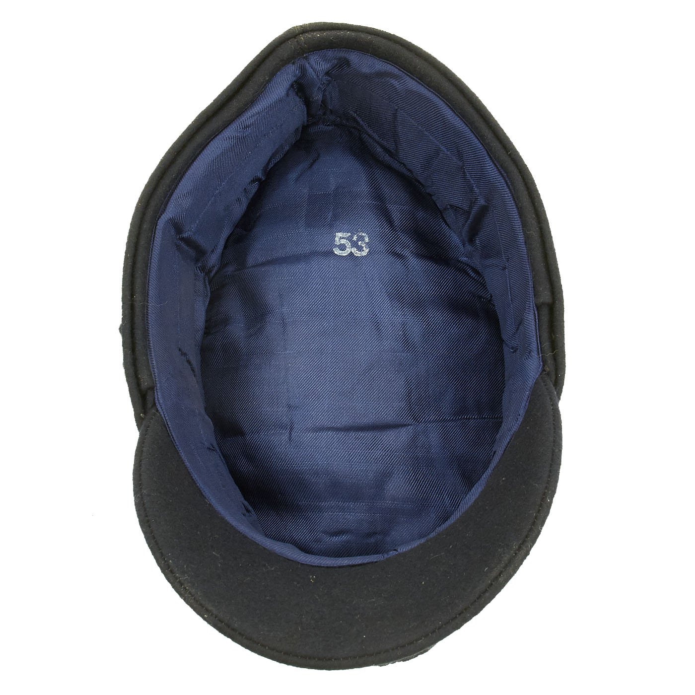 The interior of the cap is lined with navy blue rayon, with a 53 stamped on the top. There is no wear of any kind. The visor is still quite well-shaped, with a lovely curve, and no cracks, bends, or other issues.