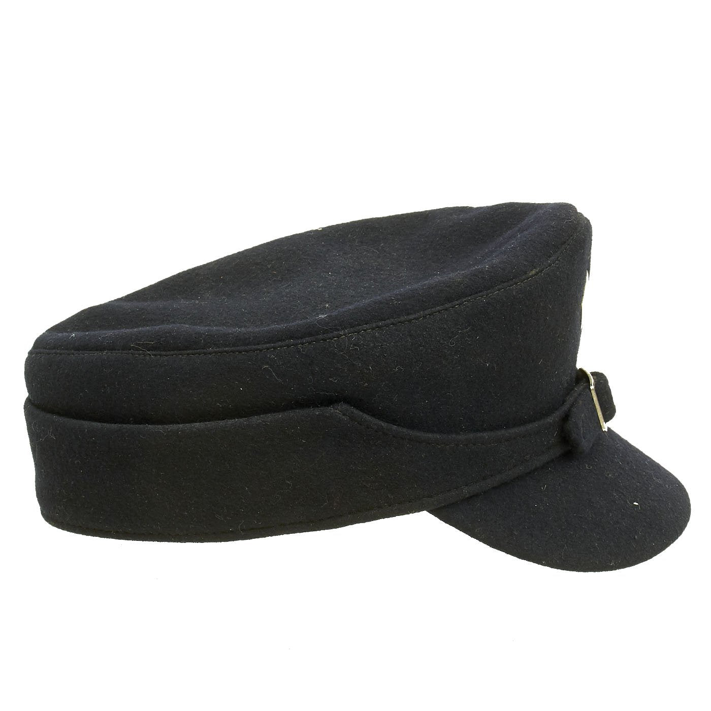This fine cap is constructed of black worsted wool gabardine cloth, with fold-down panels with rounded scallops to the front and forward sides, covering the entire neck on the sides and rear when in use. When not in use, the panels are raised with their ends resting upon the visor, being joined together by a single pebbled aluminum button. The visor is reinforced with cardboard, and covered in matching gabardine cloth.