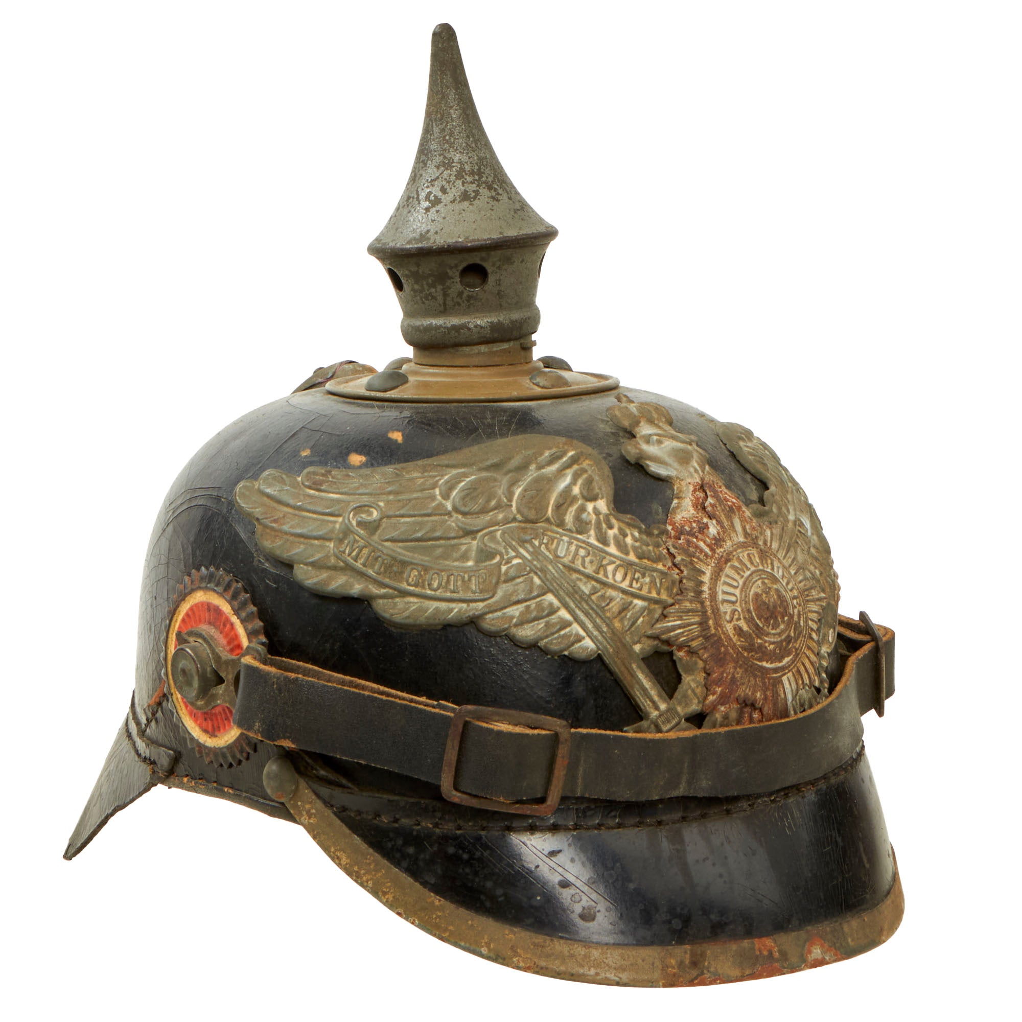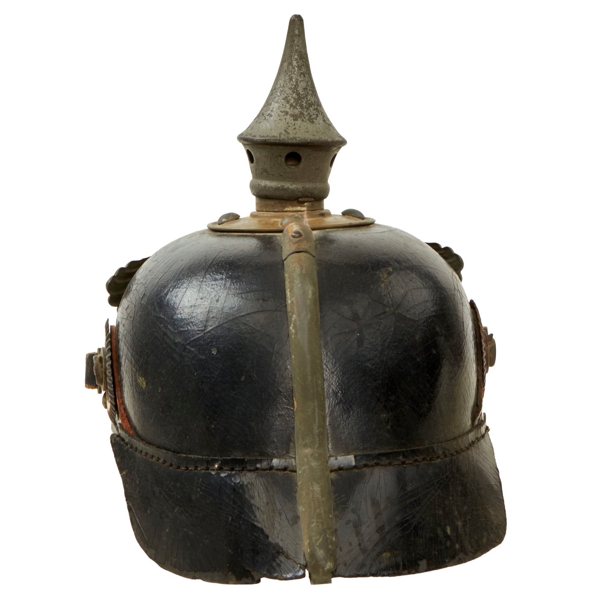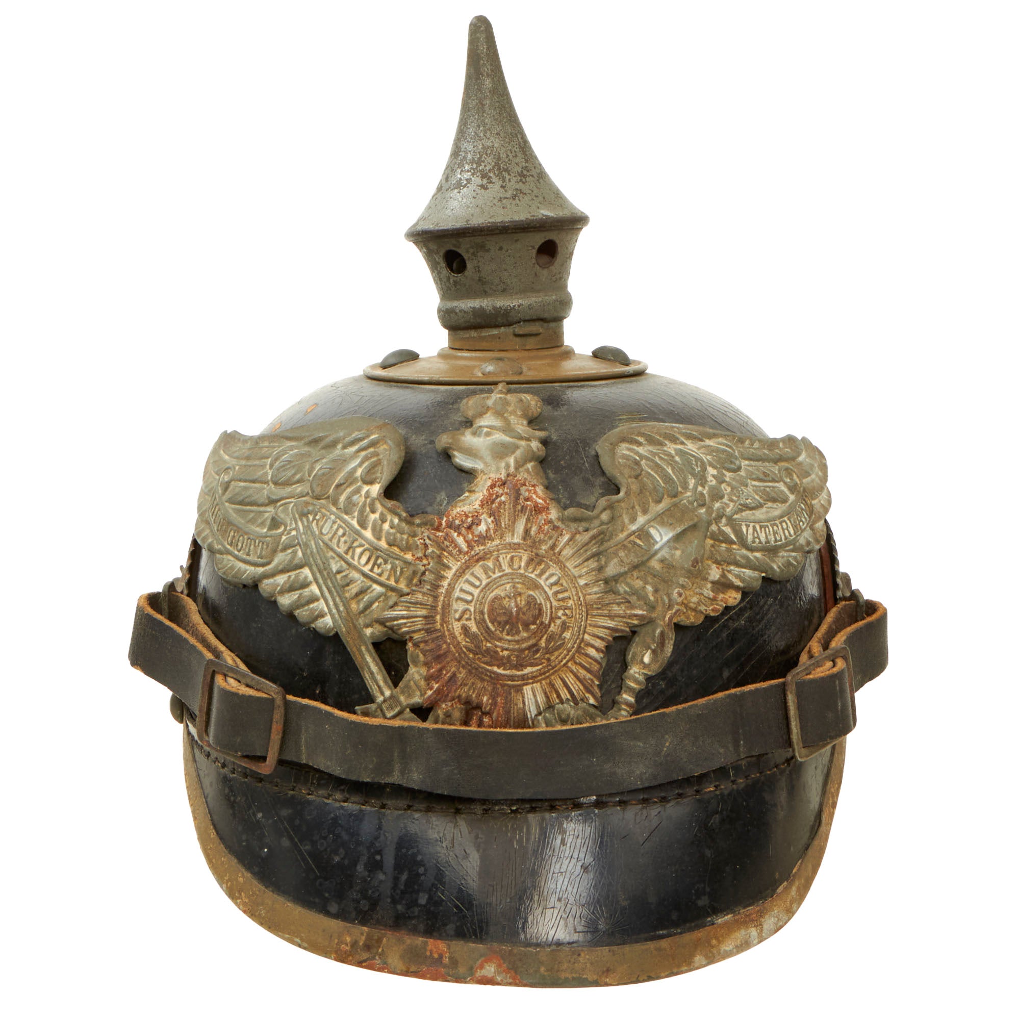 Original Item: Only One Available. This is a very good condition Imperial German line Infantry enlisted man's Mannschaften (other ranks) pickelhaube, with Grand Duchy of Baden (Großherzogtum Baden) Wappen and Cockades. The M1915 was the last model of Pickelhaube issued prior to the move to all steel helmets. In accordance with the 1915 regulations these helmets would no longer would use brass, silver, or Tombak as the M1895 did. All issued Pickelhaube would now use grey oxidized steel fittings for all Regiments.