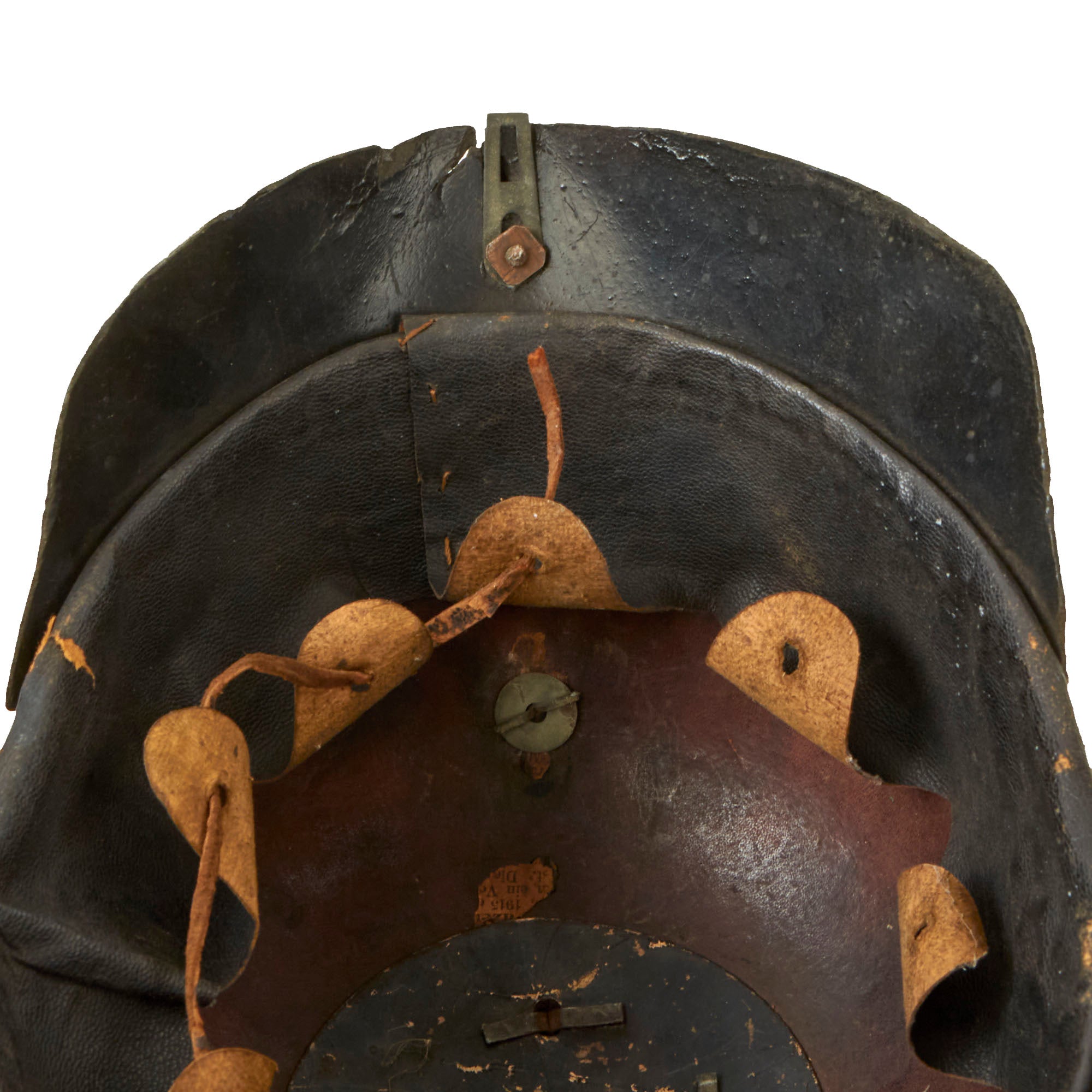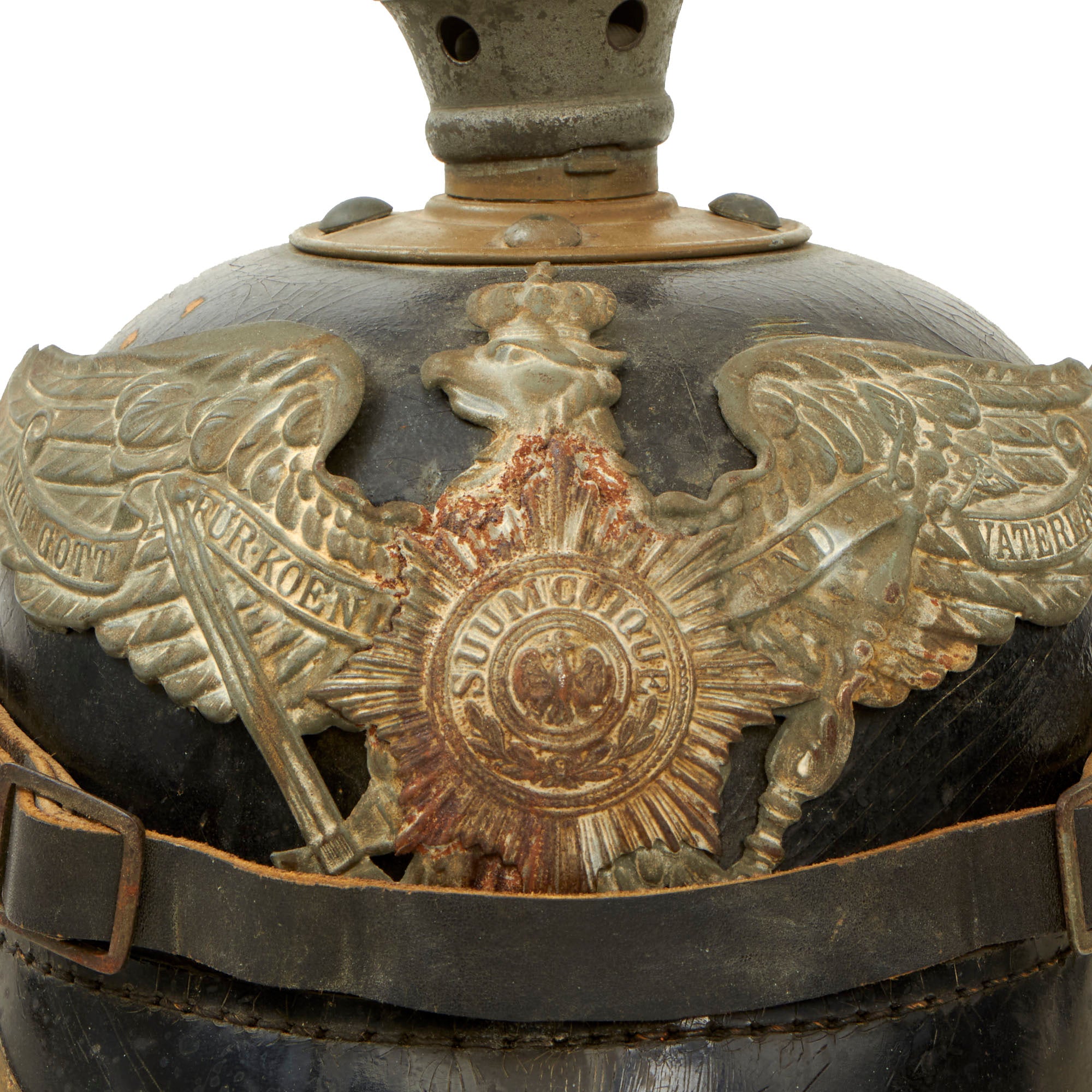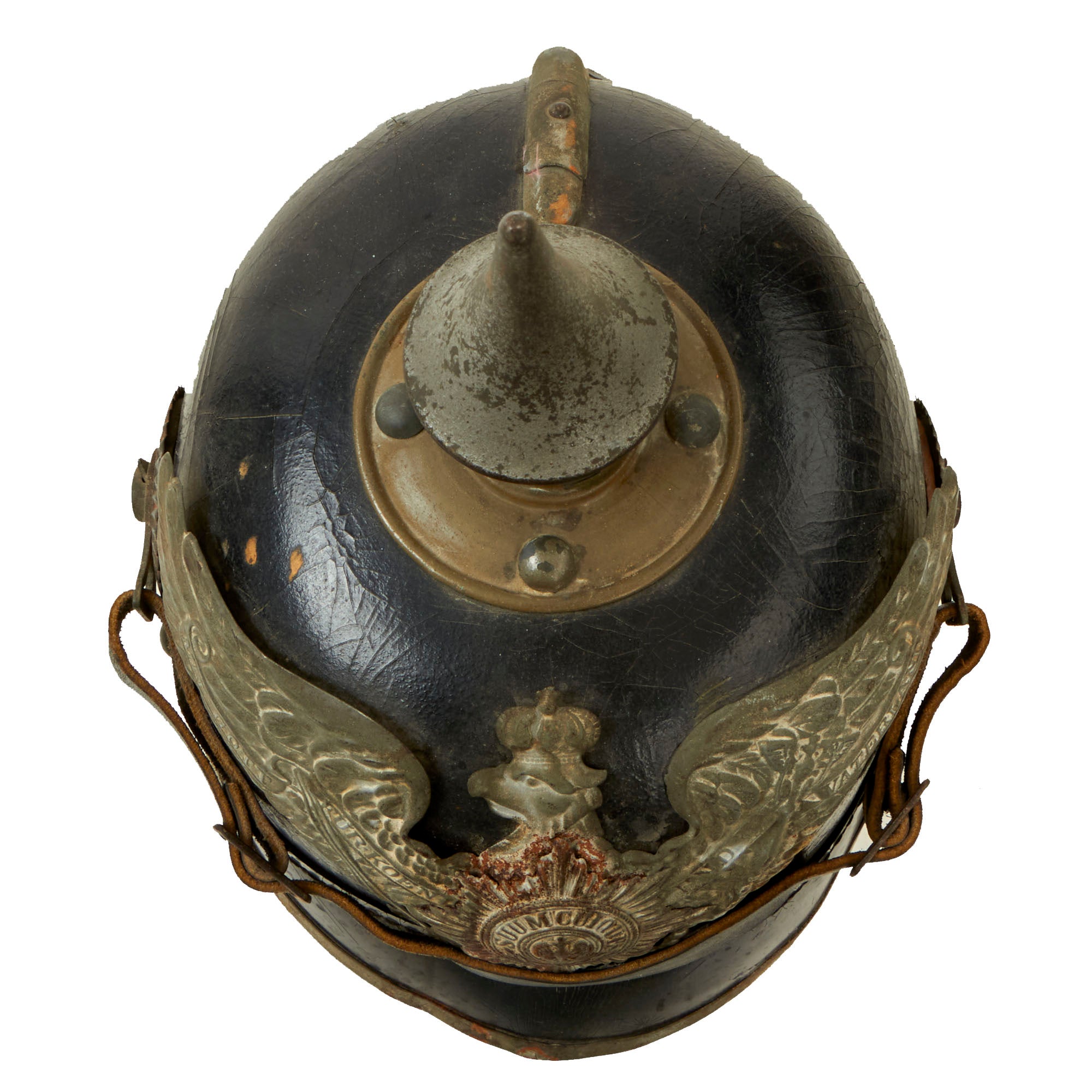Original Item: Only One Available. This is a very good condition Imperial German line Infantry enlisted man's Mannschaften (other ranks) pickelhaube, with Grand Duchy of Baden (Großherzogtum Baden) Wappen and Cockades. The M1915 was the last model of Pickelhaube issued prior to the move to all steel helmets. In accordance with the 1915 regulations these helmets would no longer would use brass, silver, or Tombak as the M1895 did. All issued Pickelhaube would now use grey oxidized steel fittings for all Regiments.
