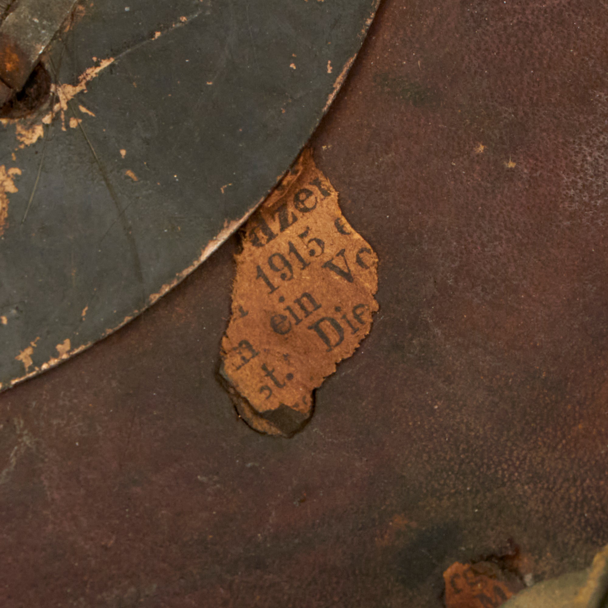 It also has the correct "vent" on the rear support spine of the helmet. It is complete with the Baden (Yellow and Red) and German National Colors (red white and black) cockades around the chin strap lugs. In 1897 the new Reichs-Kokarde in Red-White-Black was introduced for all ranks to commemorate the 100th anniversary of the birth of Kaiser Wilhelm 1st. The Reichs-Kokarde was to be worn on the right side of the helmet, and the state Kokarde was moved to the left, as on this helmet.