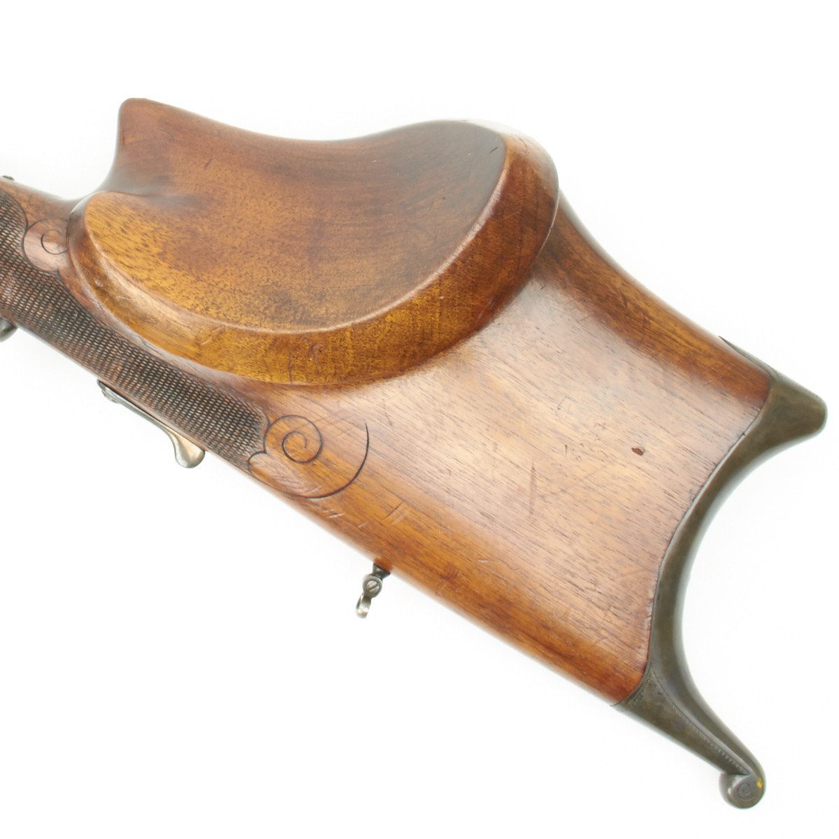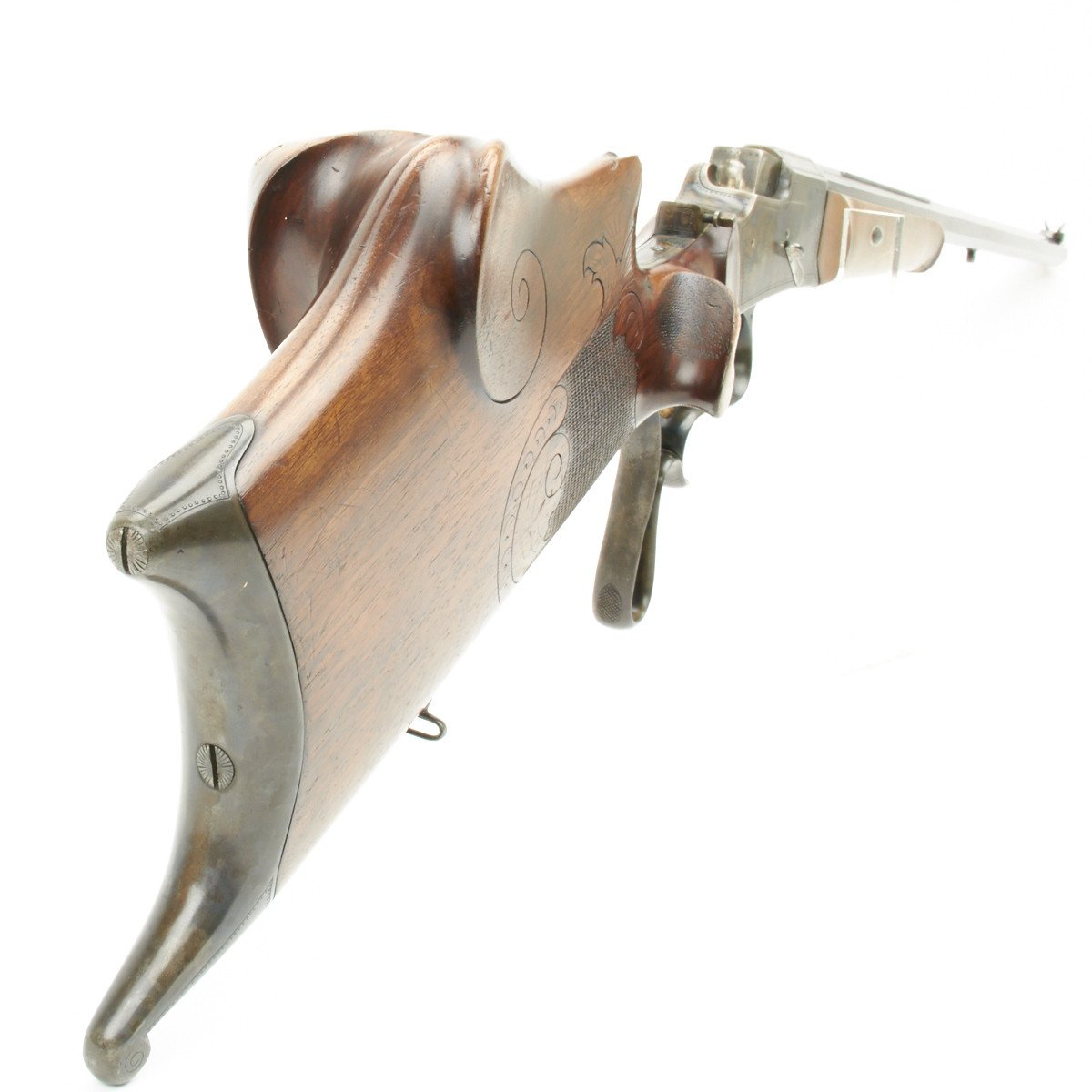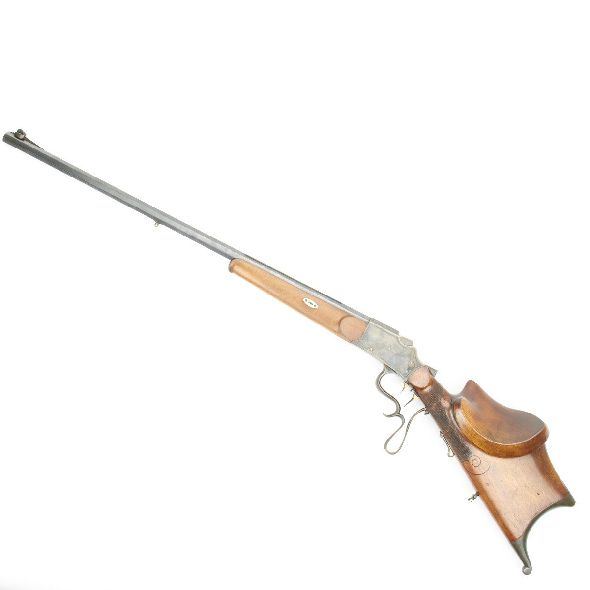Known as Schuetzen rifles, these were named after the German military term of the time basically referring to "snipers". These rifles were most often based on the falling block Martini system and, as can be seen with this example, great lengths were taken to achieve extreme accuracy. Note the extremely profiled stock and set trigger system employed on this piece. The overall finish was always of the highest quality and in this example the case hardening on the action is remarkable.