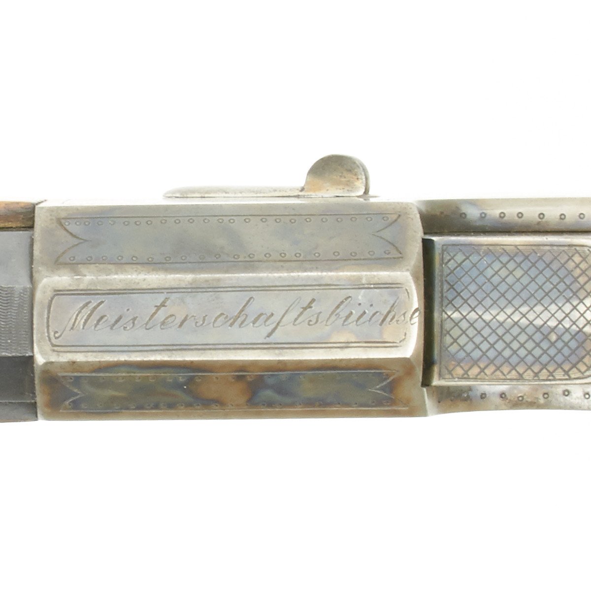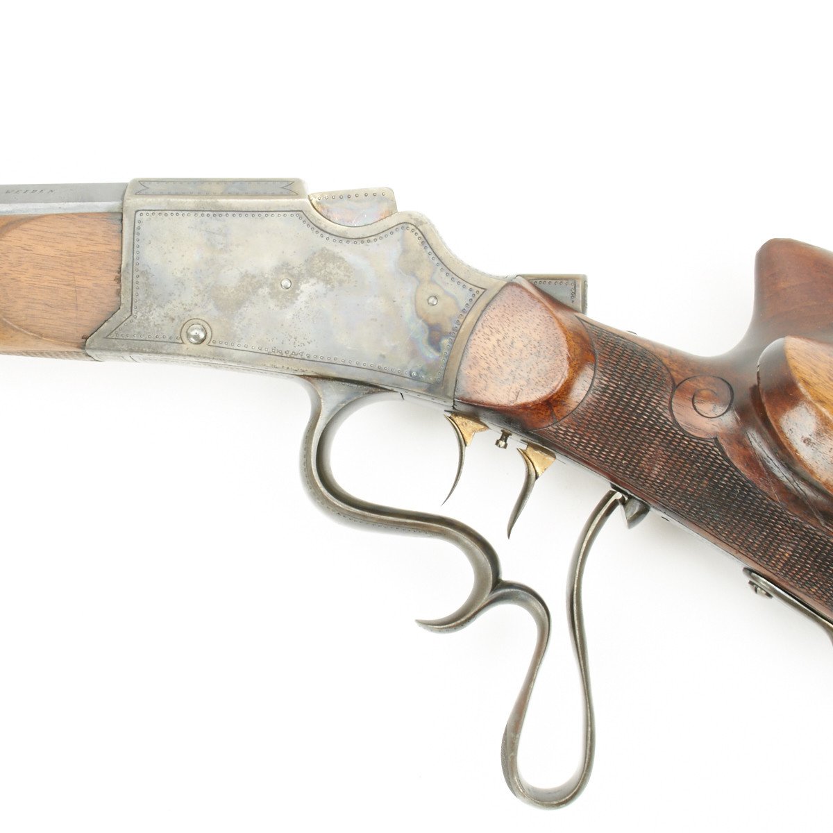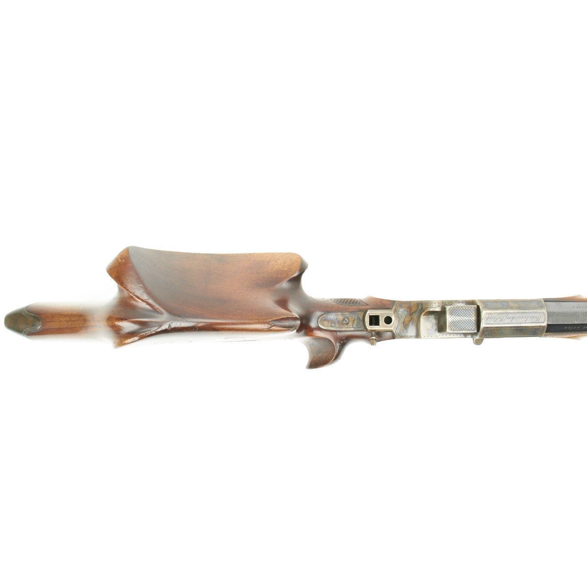 Known as Schuetzen rifles, these were named after the German military term of the time basically referring to "snipers". These rifles were most often based on the falling block Martini system and, as can be seen with this example, great lengths were taken to achieve extreme accuracy. Note the extremely profiled stock and set trigger system employed on this piece. The overall finish was always of the highest quality and in this example the case hardening on the action is remarkable.