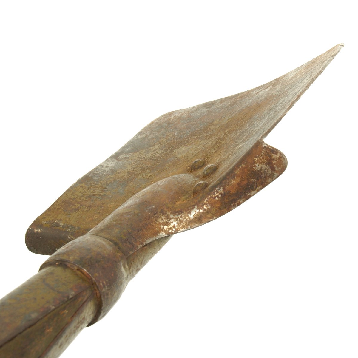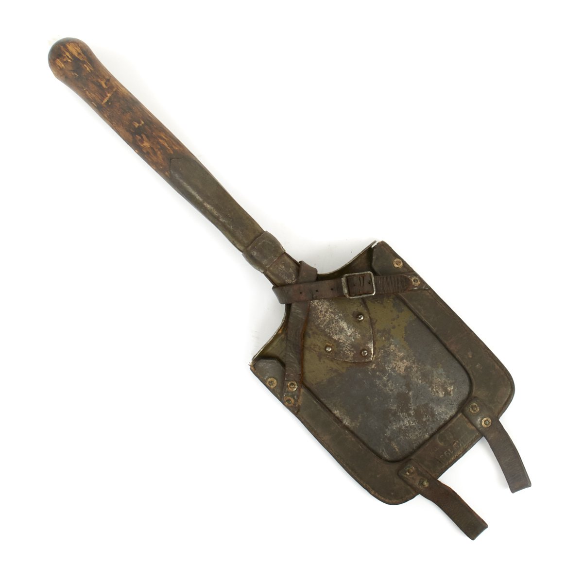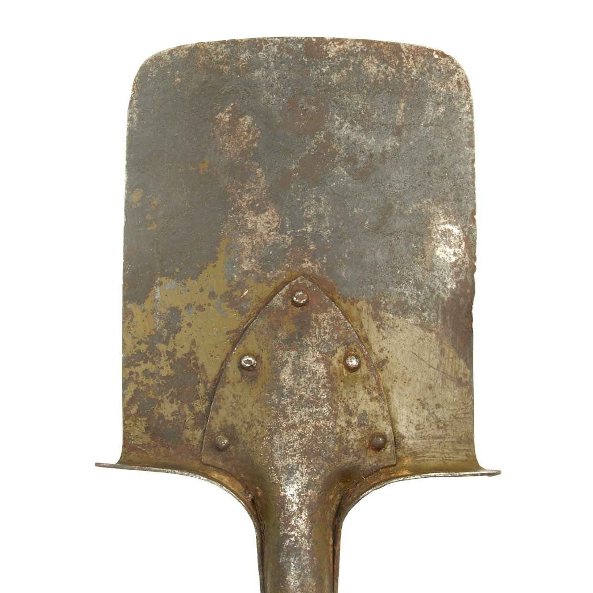 Original Item: Only One Available. This is a very nice 1915 dated World War One trench shovel which is also marked K.W. along with a another circle marking that is too worn to be legible. This shovel was reissued in WWII and painted in Deutsches Afrikakorps, DAK green, traces of which still remain.