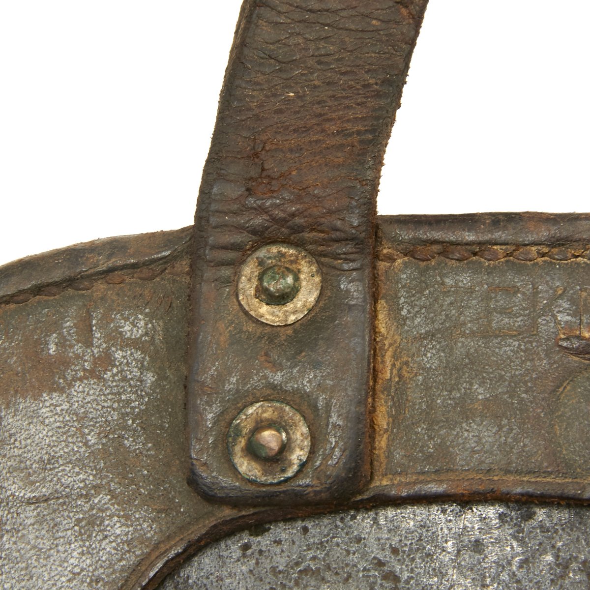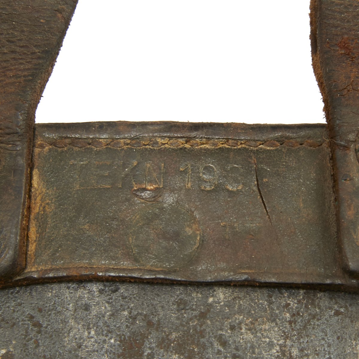 For use in WW2 it was paired with a brown leather shovel carrier that was designed to attach to the belt. This carrier is in very good condition and it marked TEKN 1938.