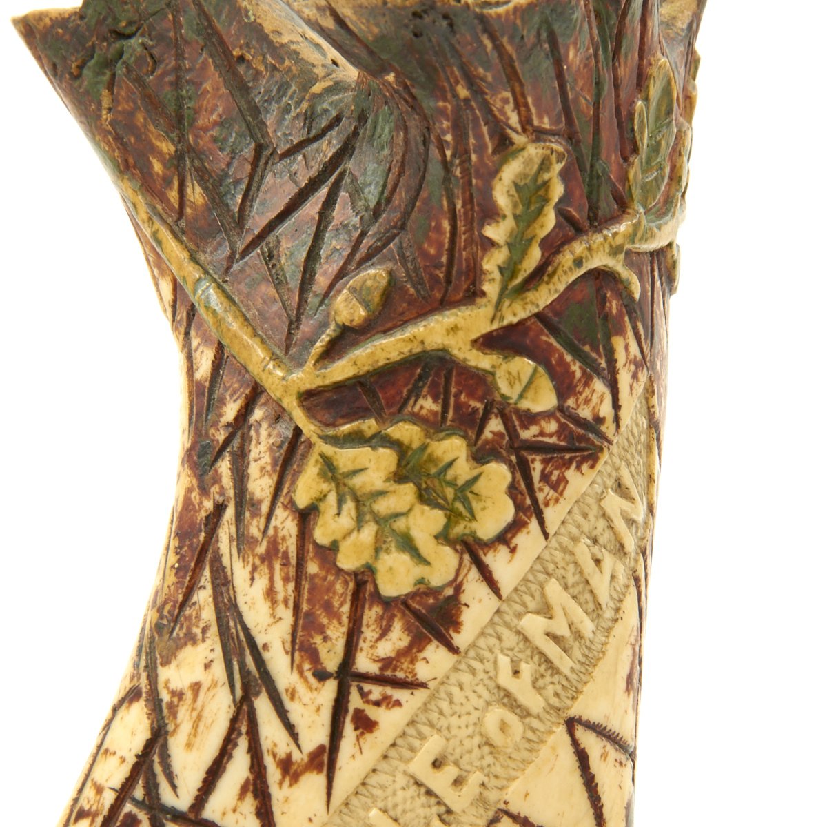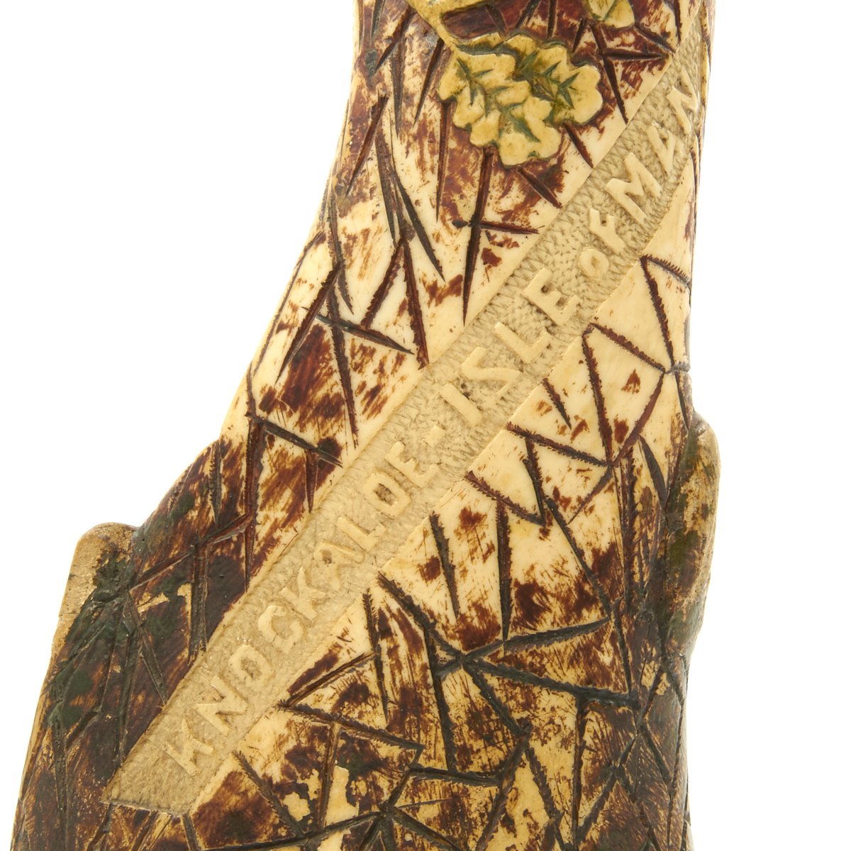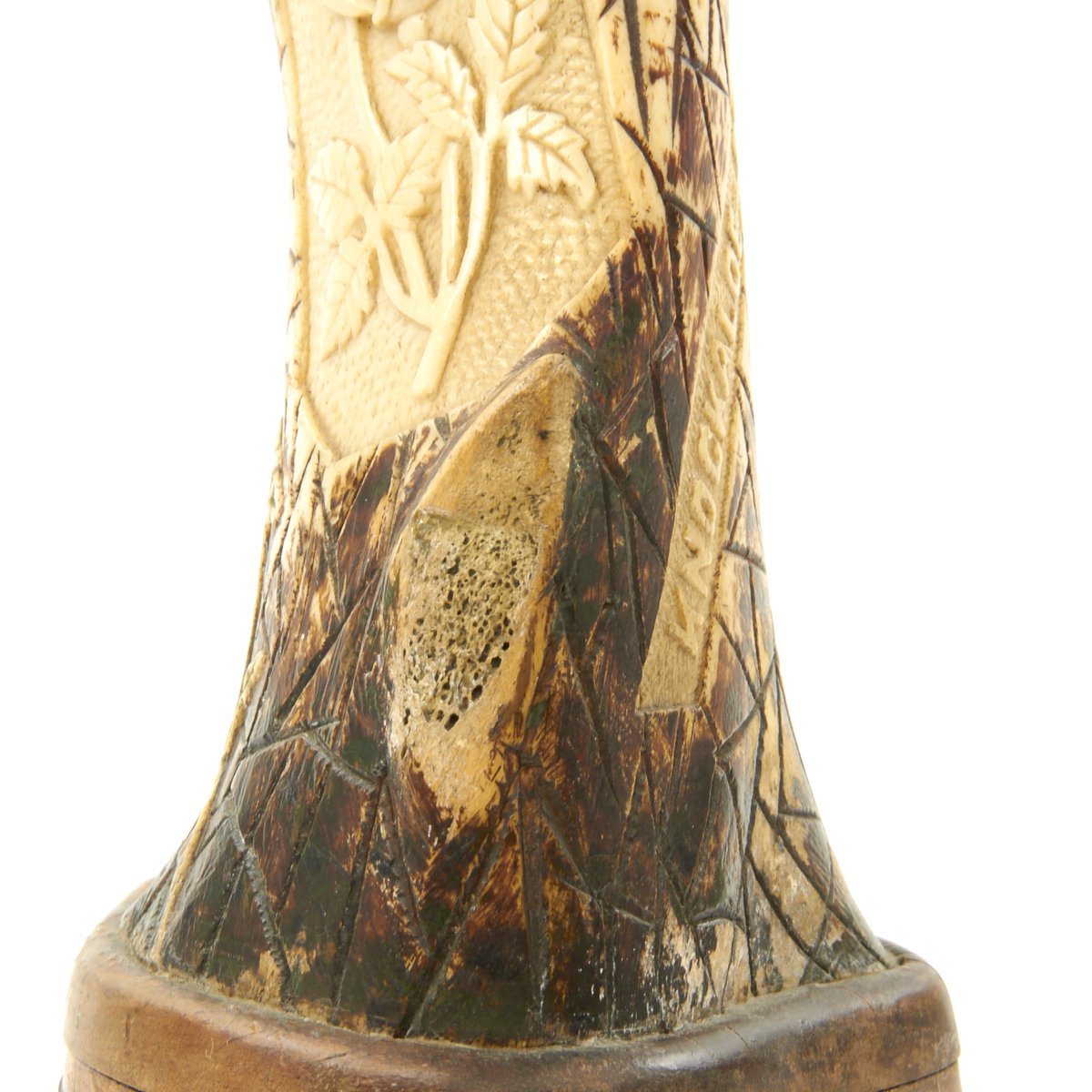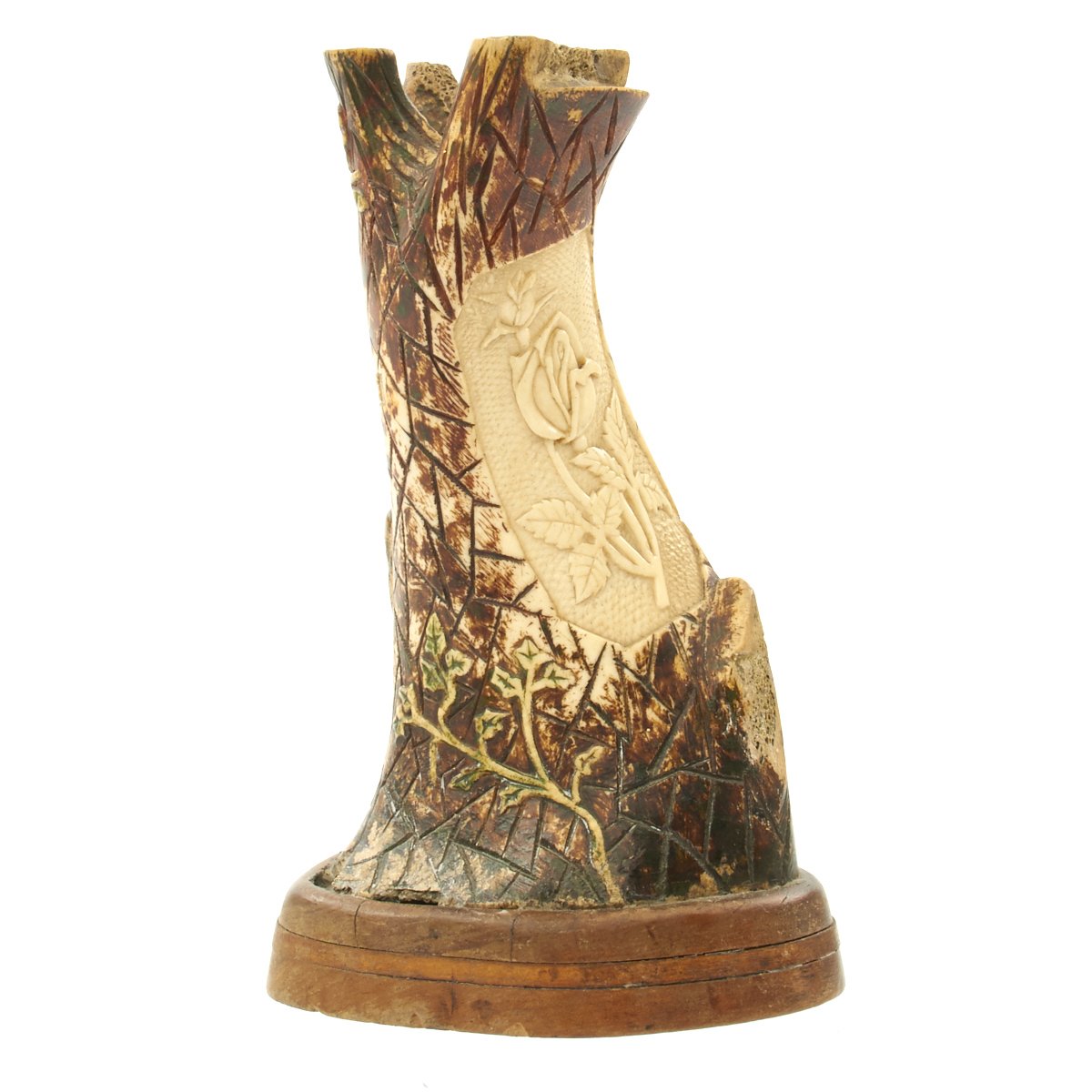 This is an incredibly detailed high quality carved bone from what appears to the hip of a deer that has an intricate floral design. It is carved and painted to resemble the trunk of a tree with bark and wines. Across the front it reads Knockaloe - Isle of Man 1915. The sculpture is mounted on a wood base and stands 8 inches in overall height and is 5 inches wide at the base.