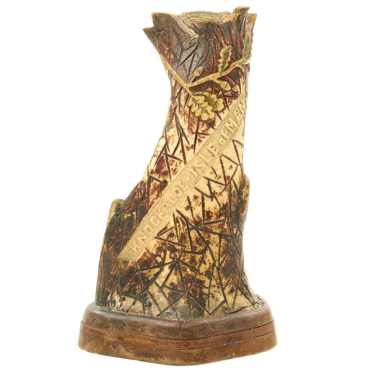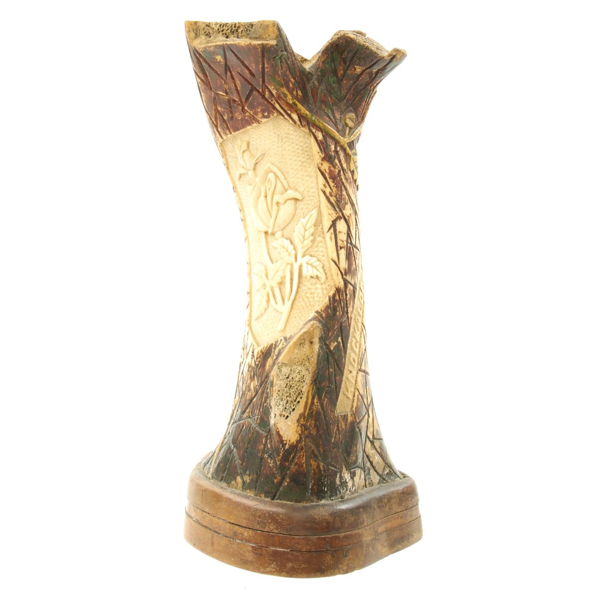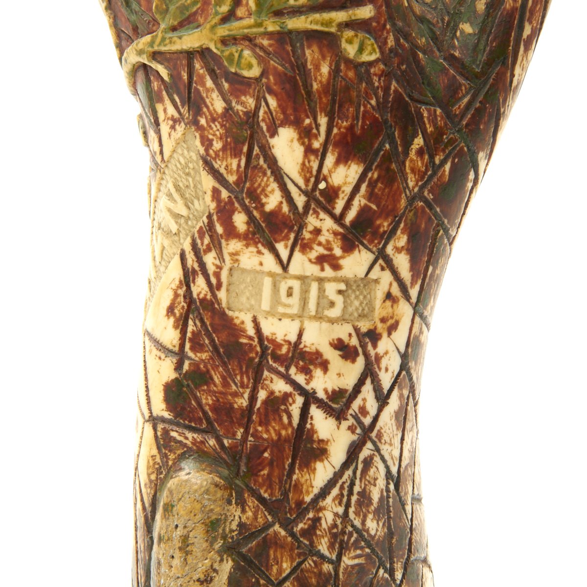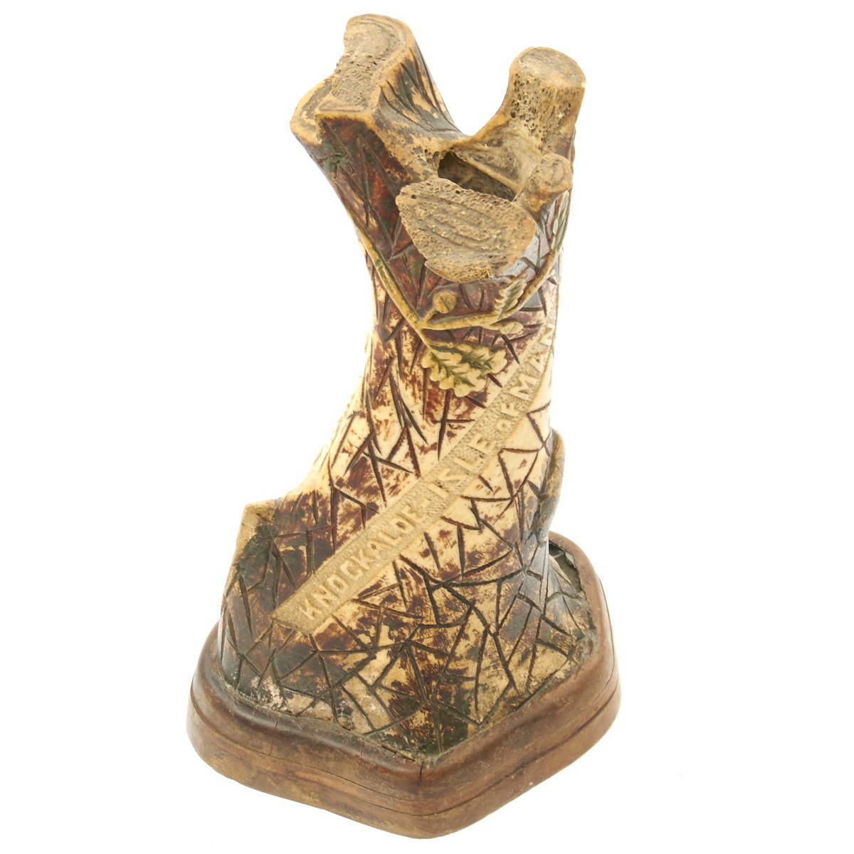 This is an incredibly detailed high quality carved bone from what appears to the hip of a deer that has an intricate floral design. It is carved and painted to resemble the trunk of a tree with bark and wines. Across the front it reads Knockaloe - Isle of Man 1915. The sculpture is mounted on a wood base and stands 8 inches in overall height and is 5 inches wide at the base.