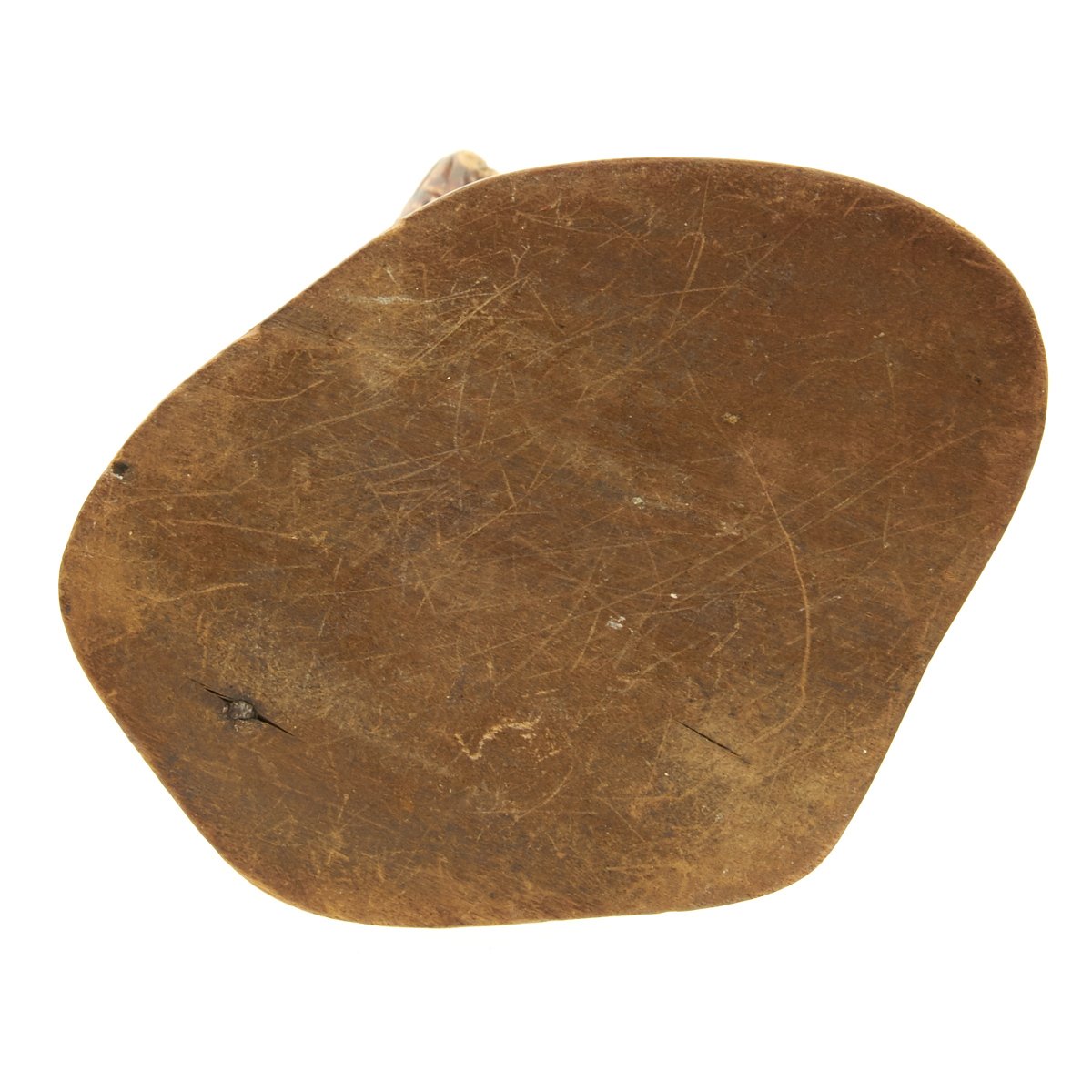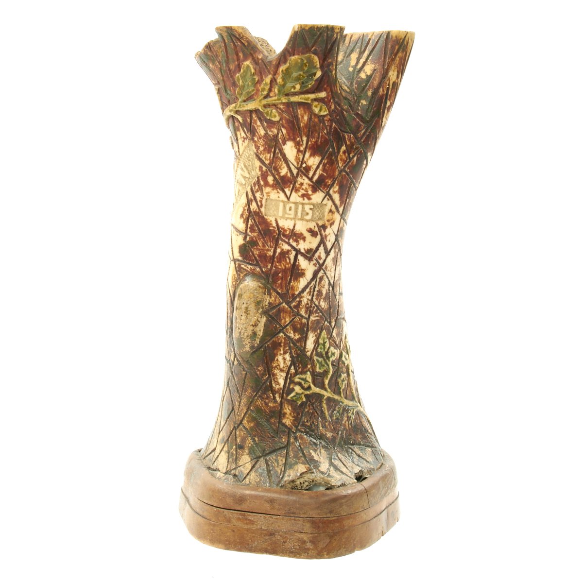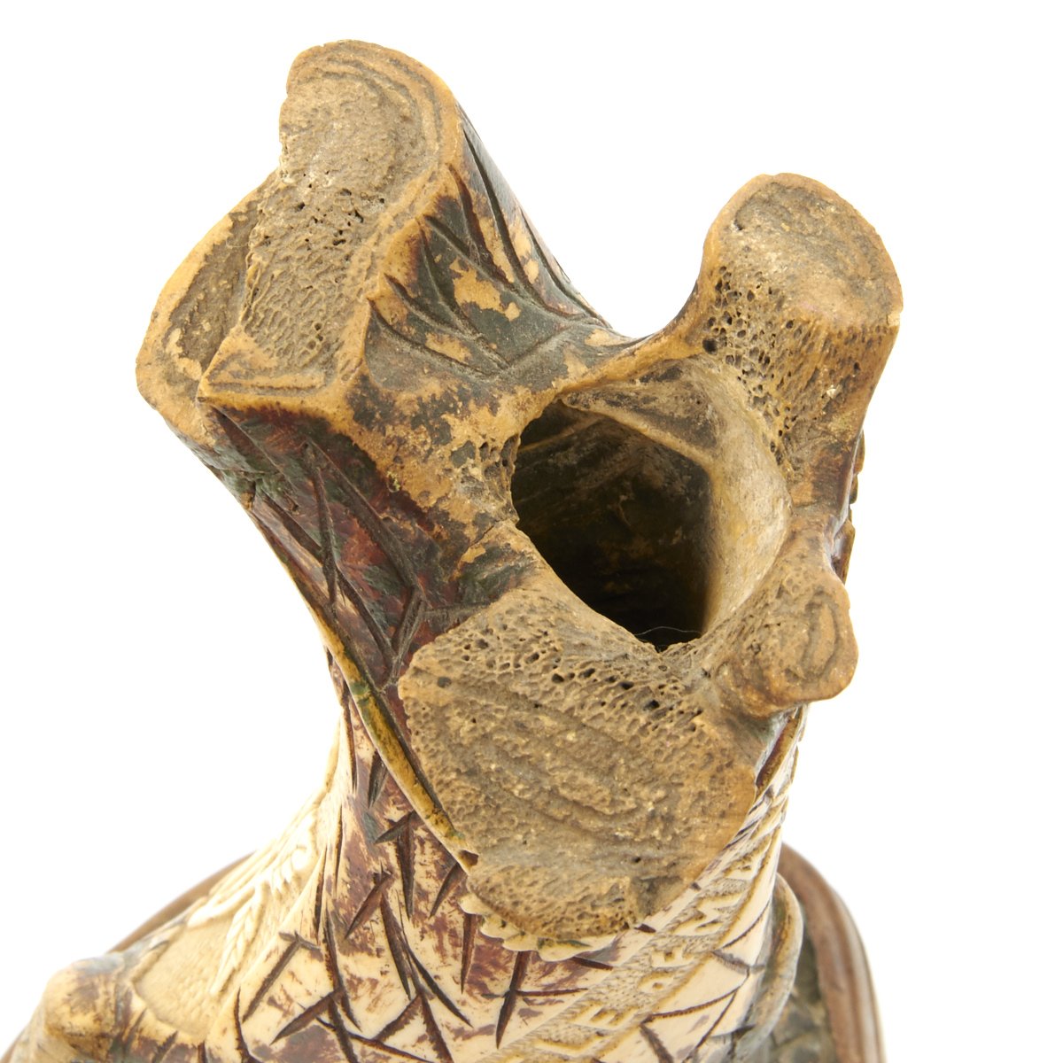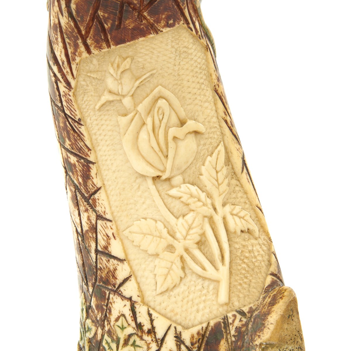 This is an incredibly detailed high quality carved bone from what appears to the hip of a deer that has an intricate floral design. It is carved and painted to resemble the trunk of a tree with bark and wines. Across the front it reads Knockaloe - Isle of Man 1915. The sculpture is mounted on a wood base and stands 8 inches in overall height and is 5 inches wide at the base.