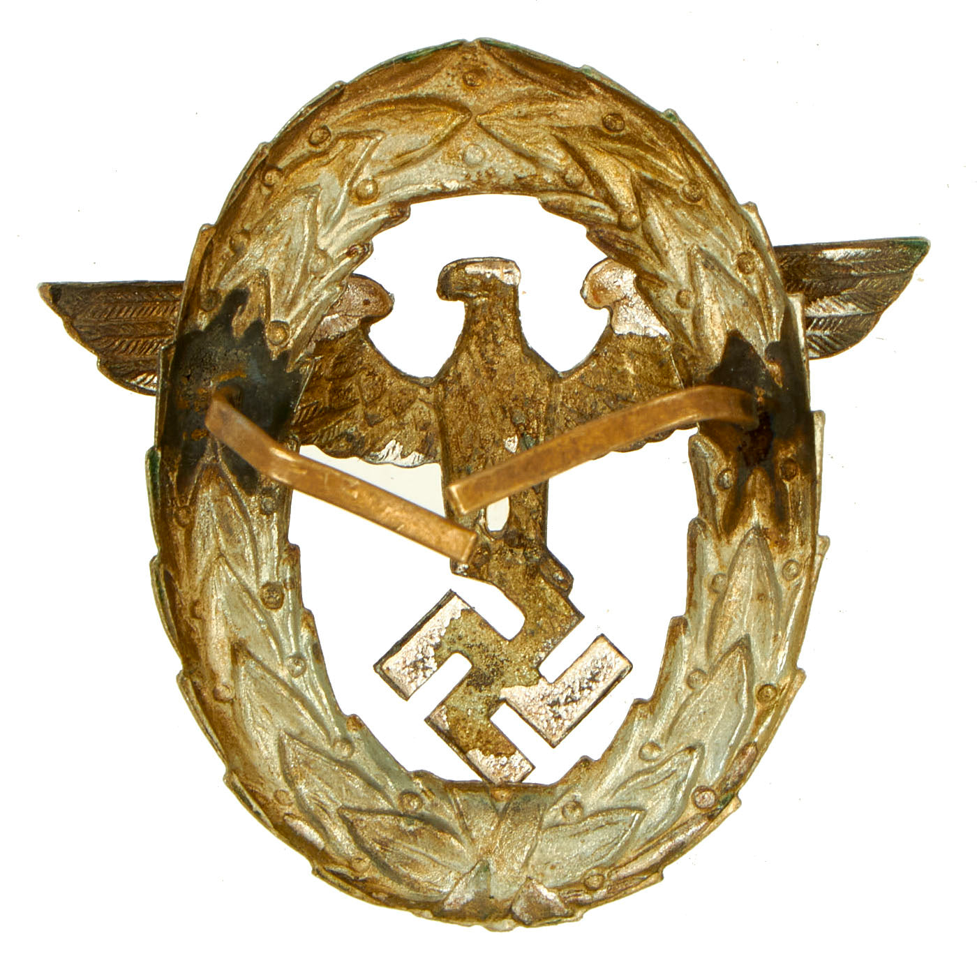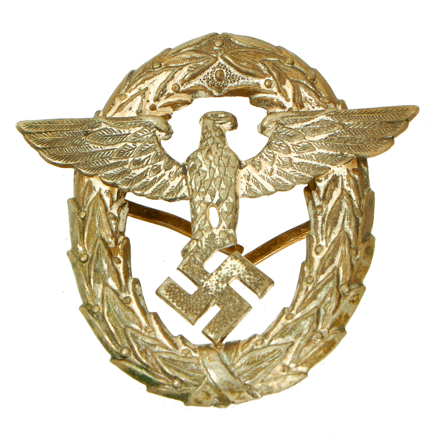 - Police Visor Cap Eagle: First pattern, (Circa April 1934-June 1936), two piece, die stamped alloy construction, police visor cap eagle with a frosted washed finish. The nicely detailed, left facing eagle features extended, tapered, pointed tip, wings and is clutching a canted swas in its talons. The reverse of the insignia is a mirror image of the obverse and both soldered attachment prongs are intact.