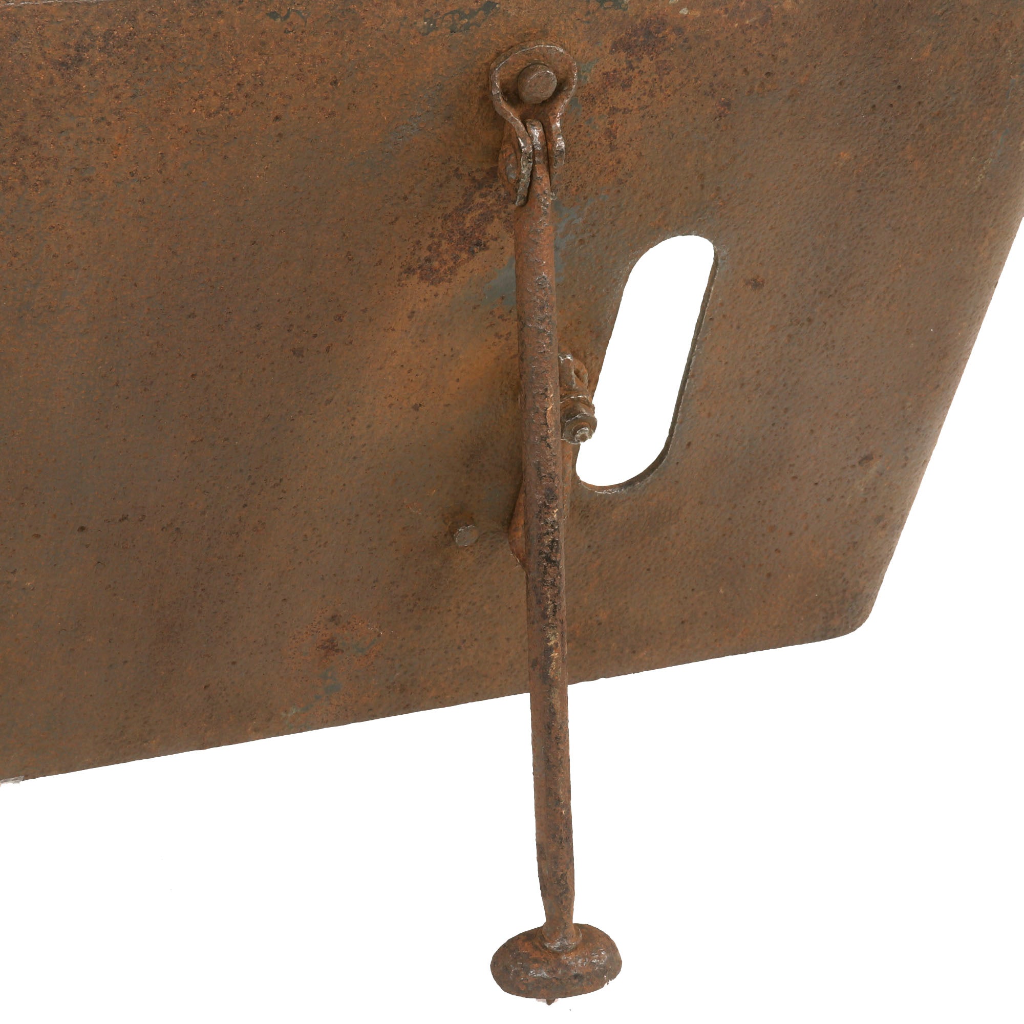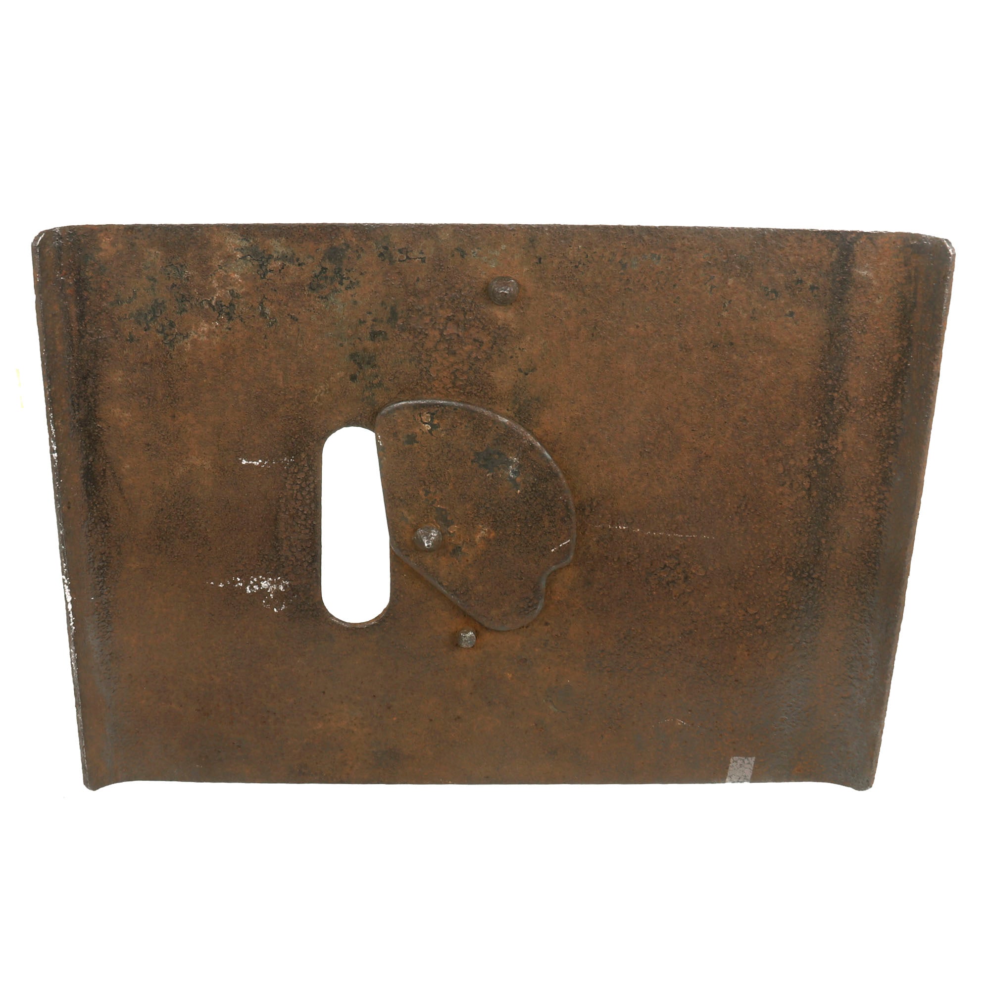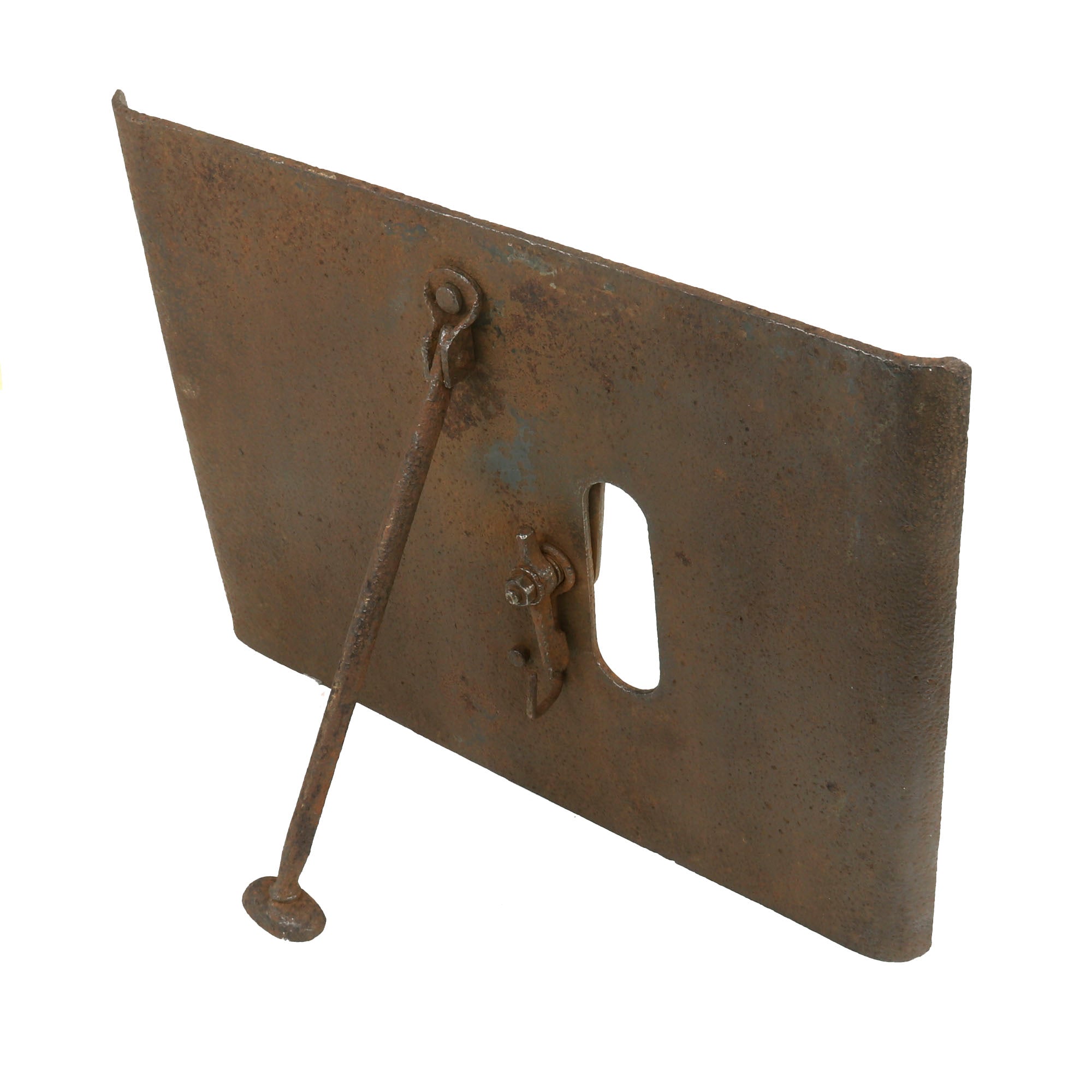 This German version weighs 30 pounds, the firing loophole is 2 inches by 6 inches and has a still-intact sliding door which at present does not appear functional, but with some proper TLC, it could likely be made working again. The shield itself was made from a silicon nickel steel and is .23 inches thick and could stop machine gun fire at 100 yards. However, with the advent of armor piercing shells, this armor became less effective. Therefore, heavier and thicker shields were developed in 1916 and 1917, where the weight increased to 50 pounds and had a thickness of .4 inches.