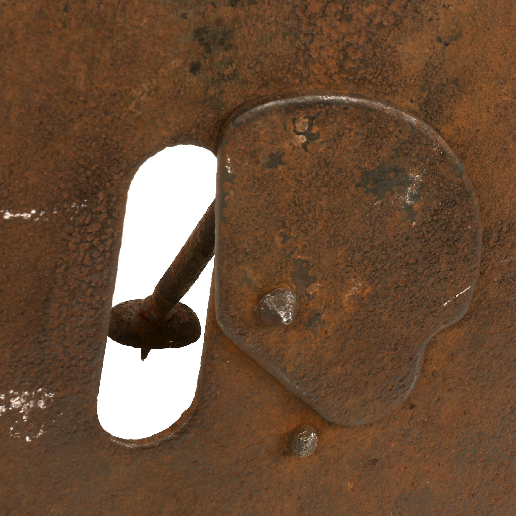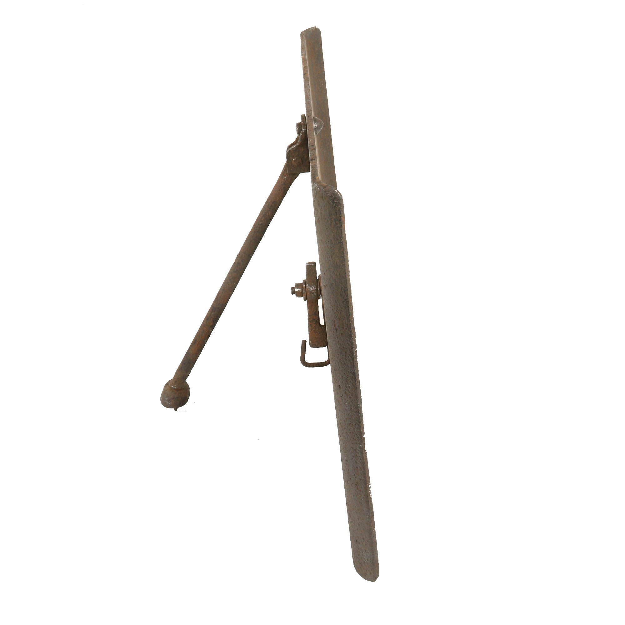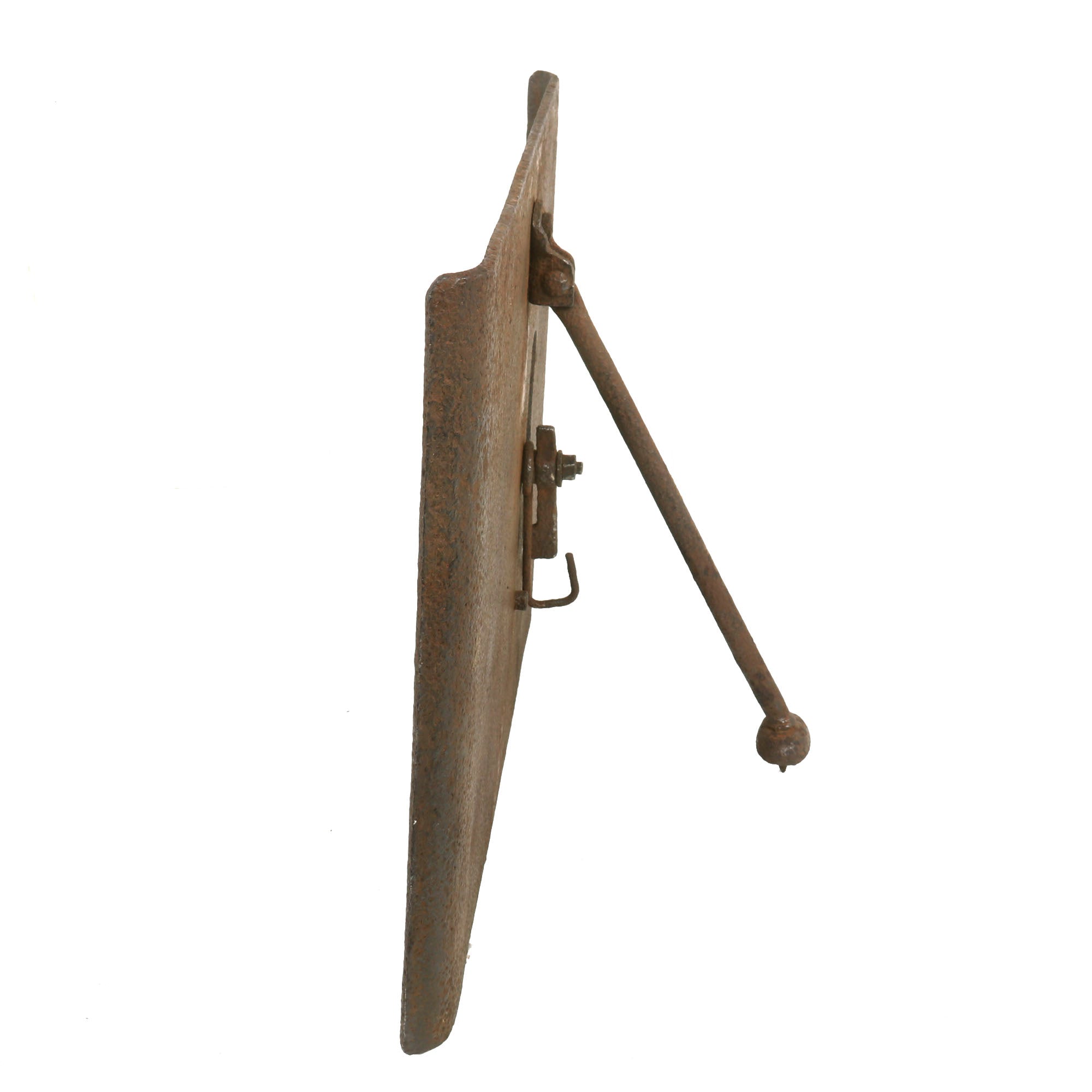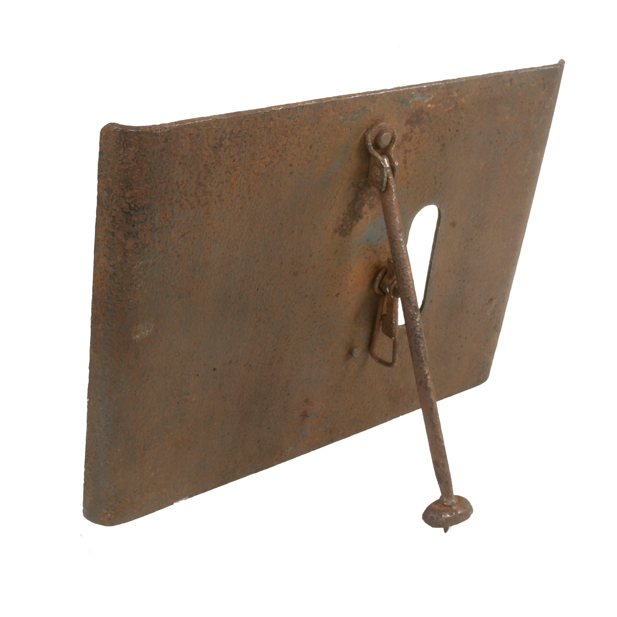 This German version weighs 30 pounds, the firing loophole is 2 inches by 6 inches and has a still-intact sliding door which at present does not appear functional, but with some proper TLC, it could likely be made working again. The shield itself was made from a silicon nickel steel and is .23 inches thick and could stop machine gun fire at 100 yards. However, with the advent of armor piercing shells, this armor became less effective. Therefore, heavier and thicker shields were developed in 1916 and 1917, where the weight increased to 50 pounds and had a thickness of .4 inches.