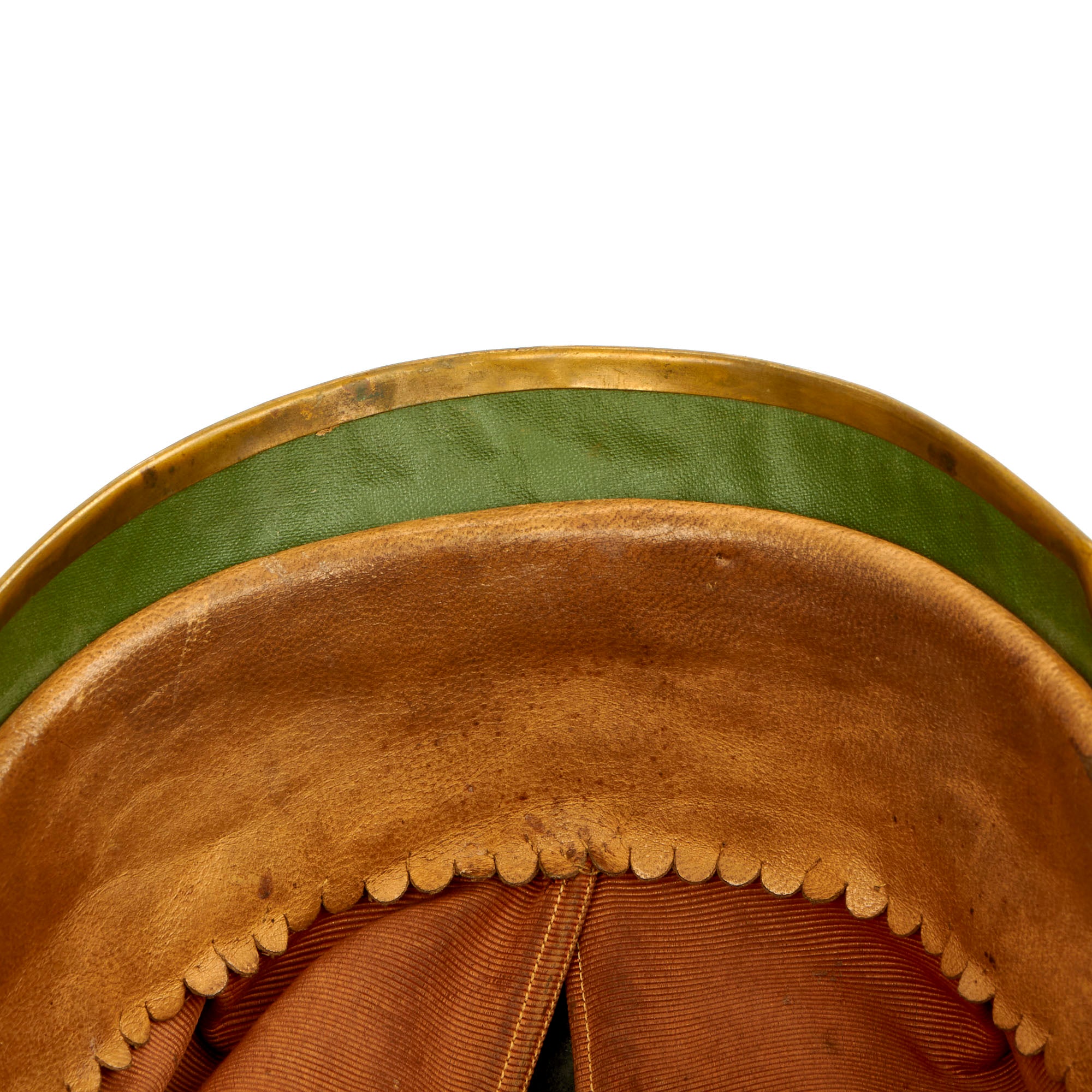 The black leather shell shows expected, but not egregious, crazing and wear. The lacquer finished leather is in nice condition with no serious issues. There is also a level of leather shrinkage due to age, the reason some of the brass fittings are somewhat loose. The very top of the helmet is a bit sunken in, very common if they are unsupported on the interior.