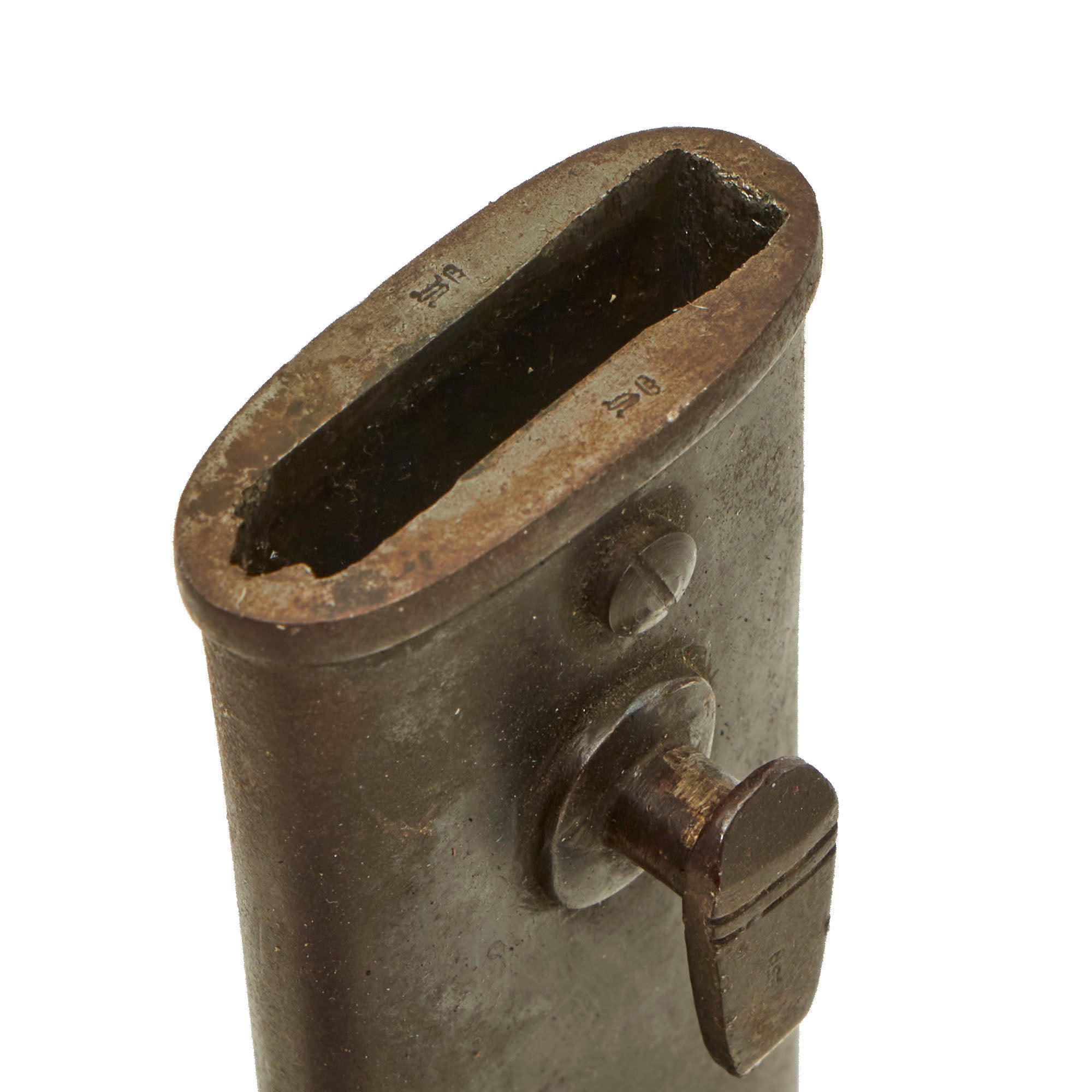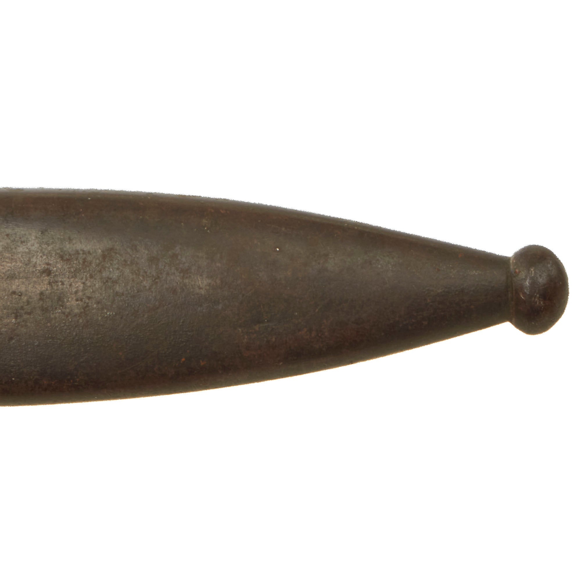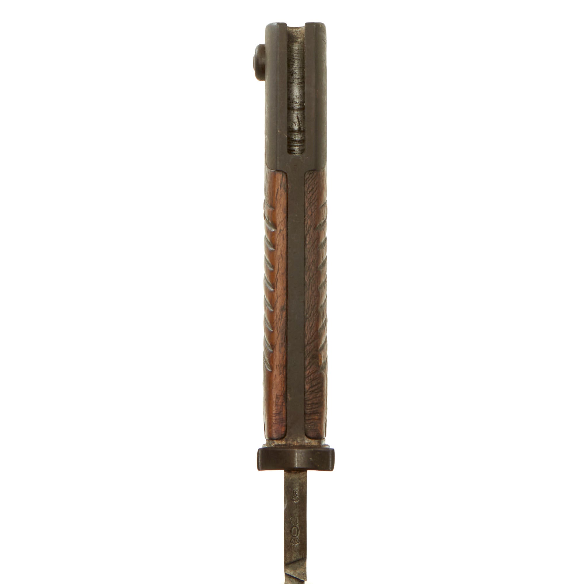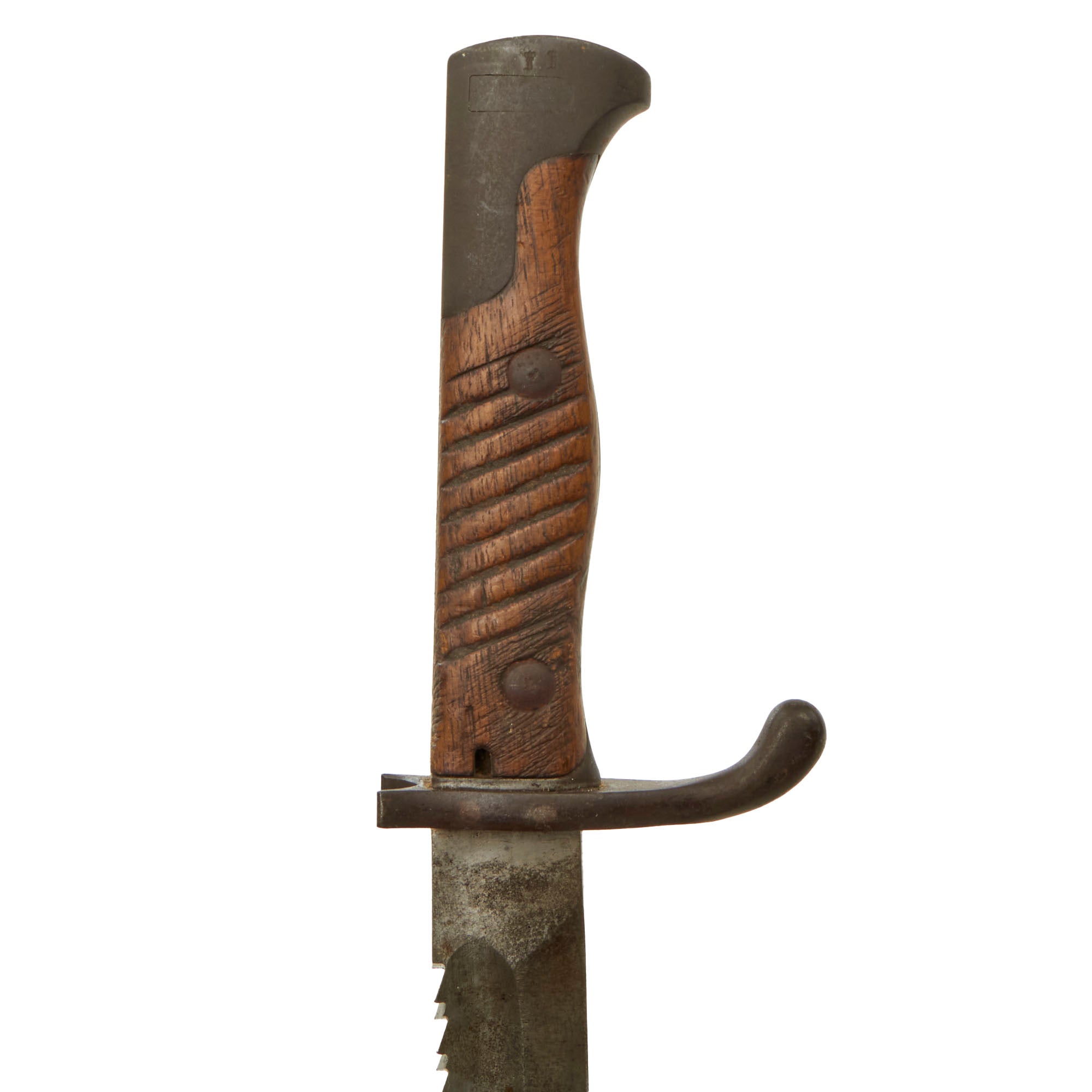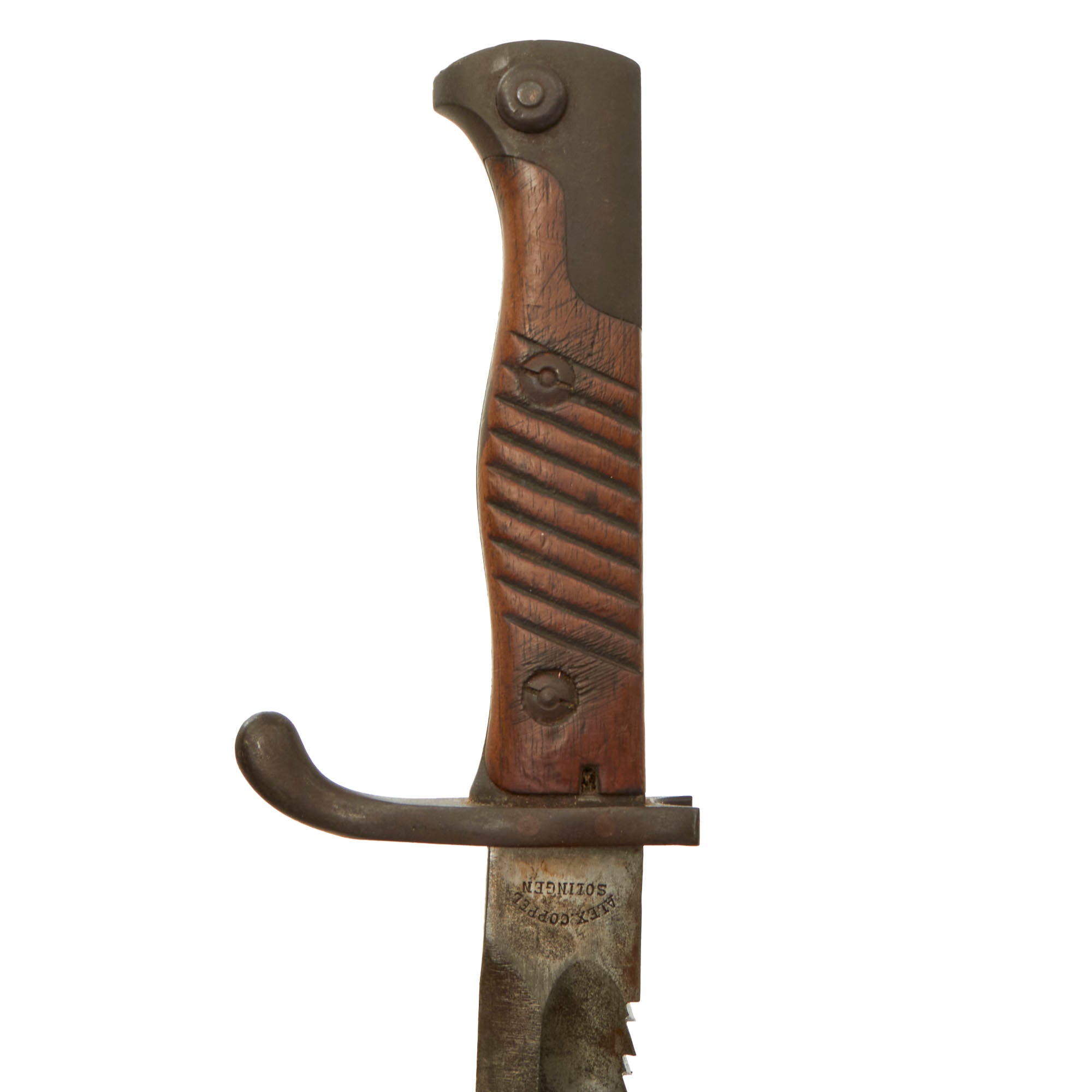 Original Item: Only One Available. This is a very nice example of the M-1898/05 Bayonet (Seitengewehr), which was the most common German Bayonet of the First World War. It was intended for use on the standard issue service rifle of Imperial Germany: the Mauser-designed Gewehr 98 (GEW 98). It features a heavy 14.5-inch steel blade with distinct bulge toward the point, giving extra weight and power to the business end, known as a "butcher blade". This version is known as a/A (alter Art = old model). These early pattern bayonets were made with a vestigial muzzle ring, known as "high horns", and did not have a flashguard on the back of the grip. Almost all examples of the a/A would later have the "horns" ground away, so it is very rare to find an intact example such as this!
