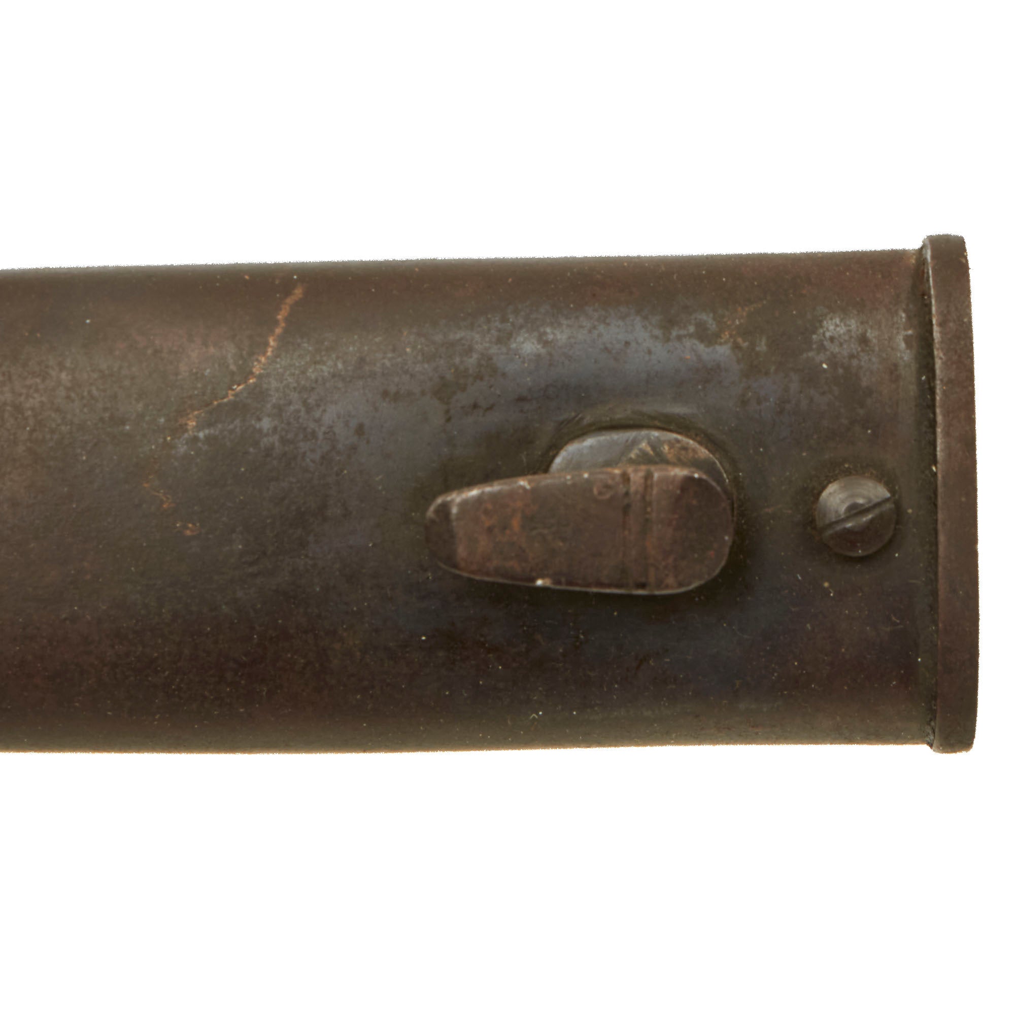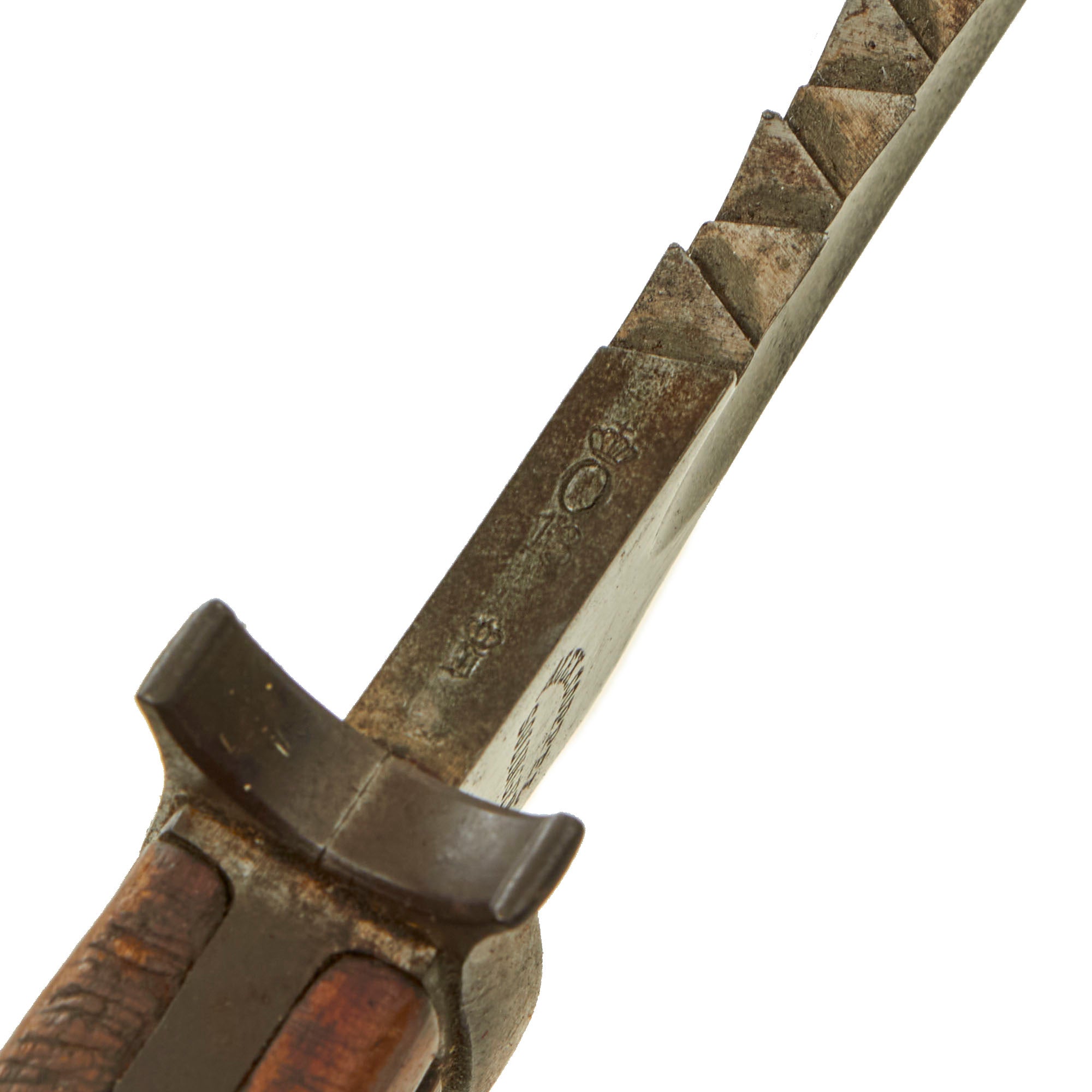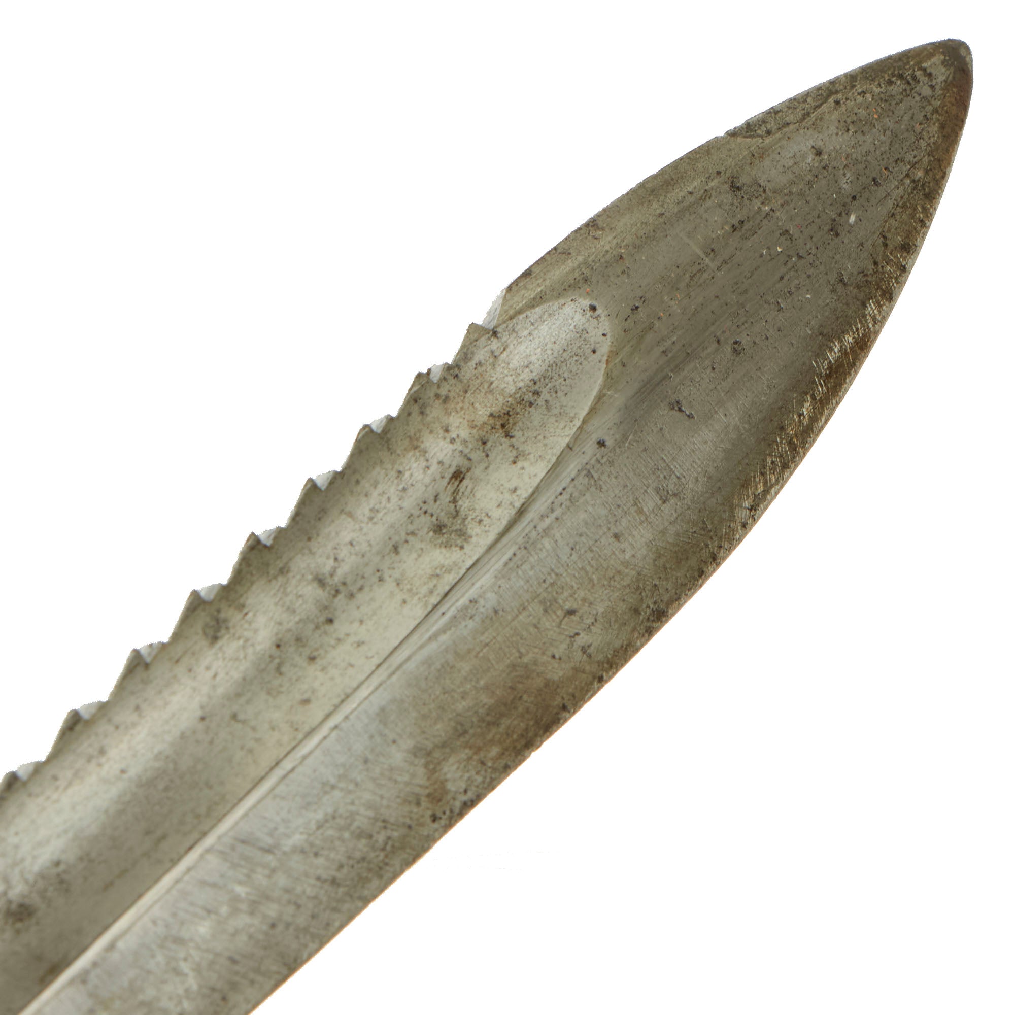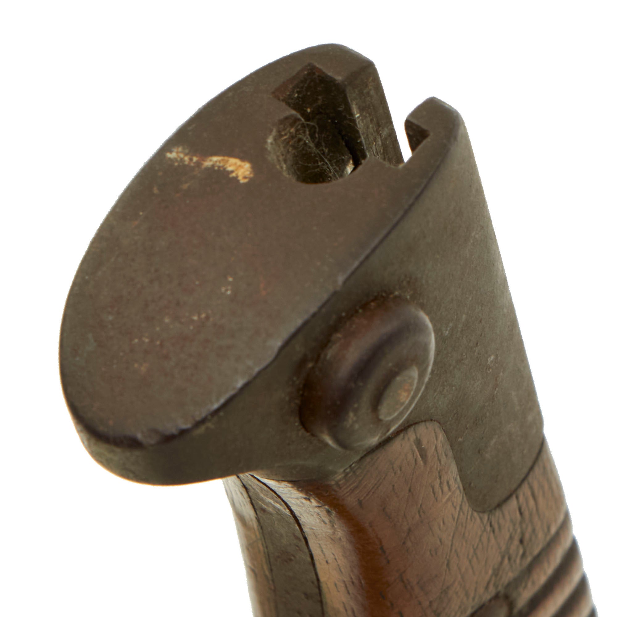 This example has a very desirable "sawback" blade, which was intended for use by pioneers to saw through brush and obstacles. Unfortunately a rumor got out that it was intended to inflict grievous harm on enemies, so a lot of the sawback bayonets had this feature removed, making them hard to find. This example has a blade in very good condition. There is little staining or rust, just overall wear from cleaning. It does not appear to have been sharpened much, and the sawback itself is in excellent condition.