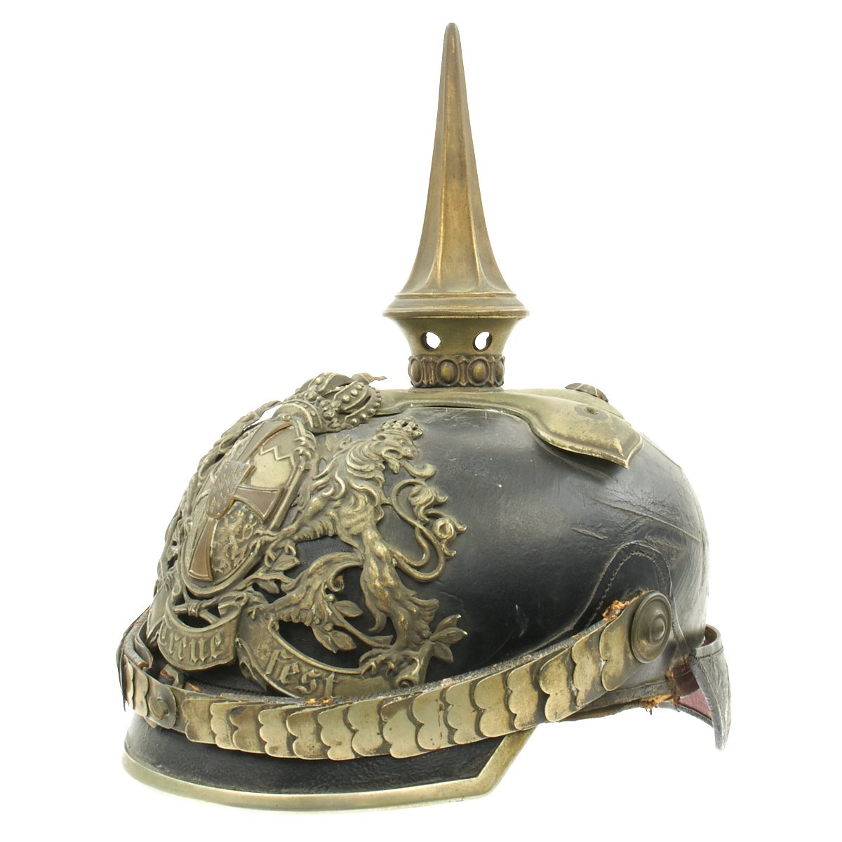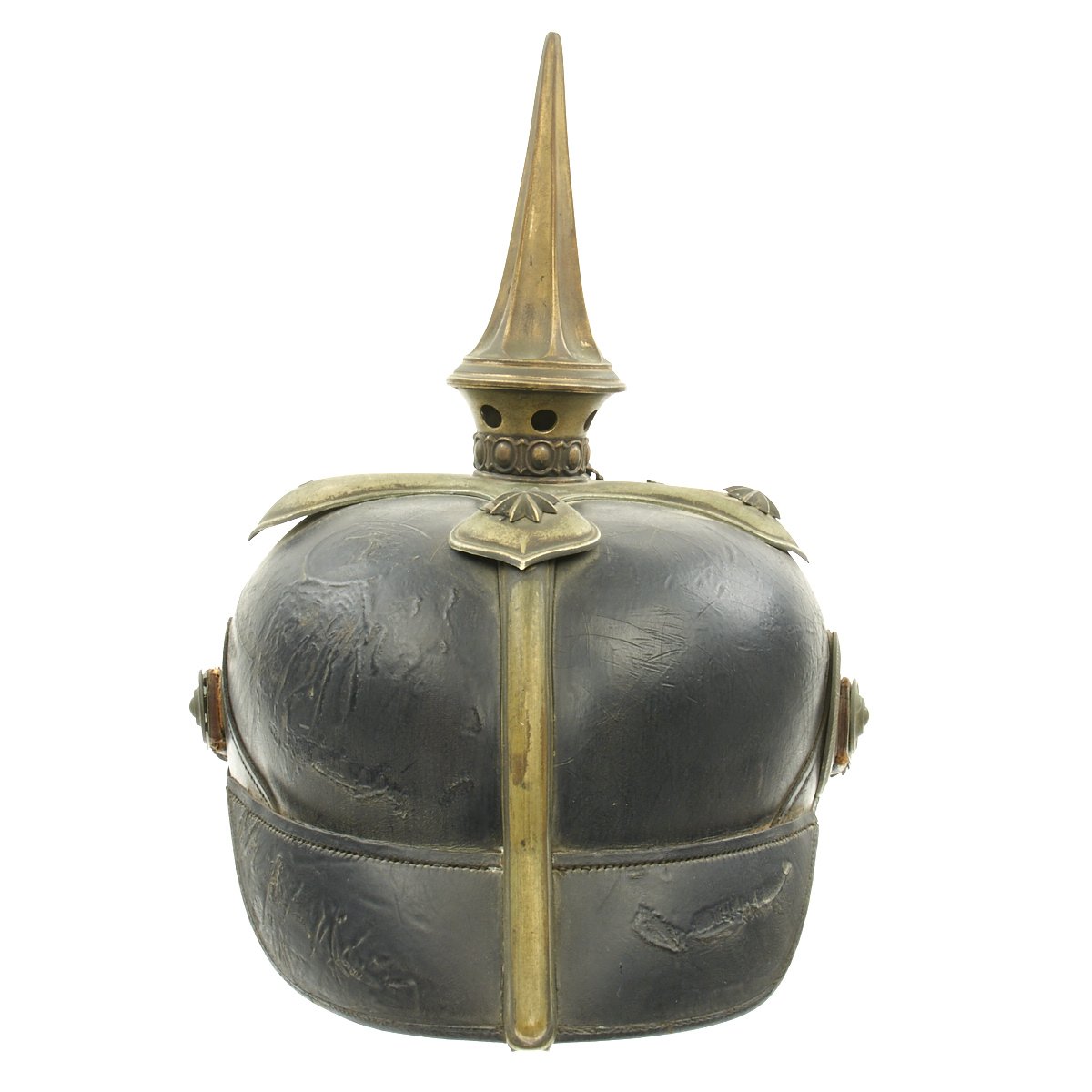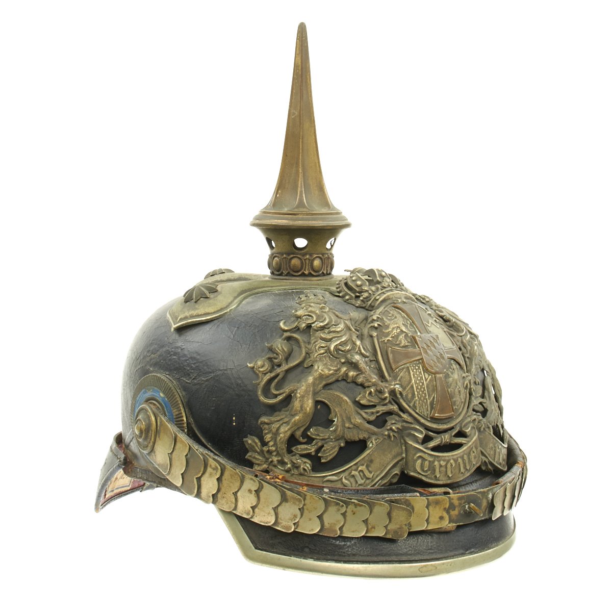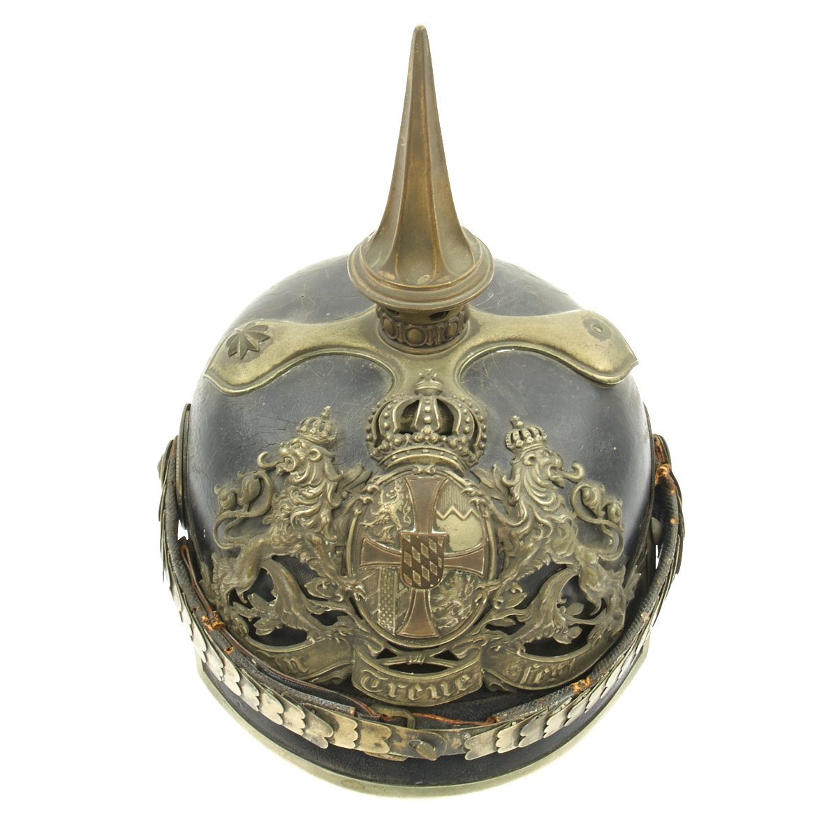 Original Item: Only One Available. The earliest of the Bavarian pickelhauben models this is a genuine model 1886/87 officer’s Pickelhaube from a line-Infantry Regiment. The helmet typical leather body is in overall very fine condition with some crazing, without any major dents, or imperfections; metal fittings (cruciform, chin scales, wappen, spike) are all brass exhibiting minor wear without any major issues and a wonderful patina.