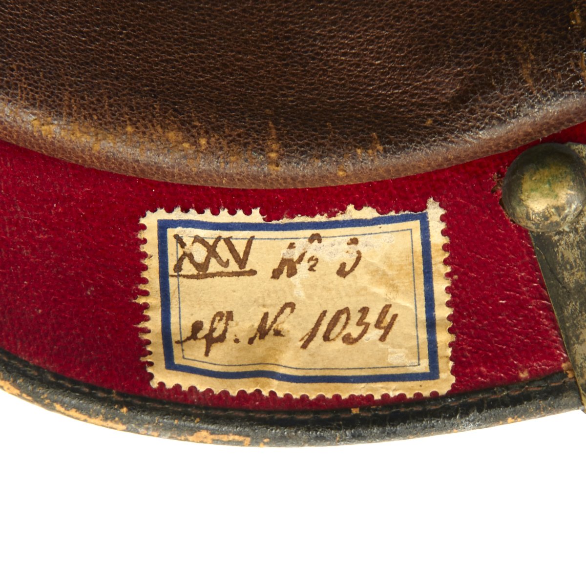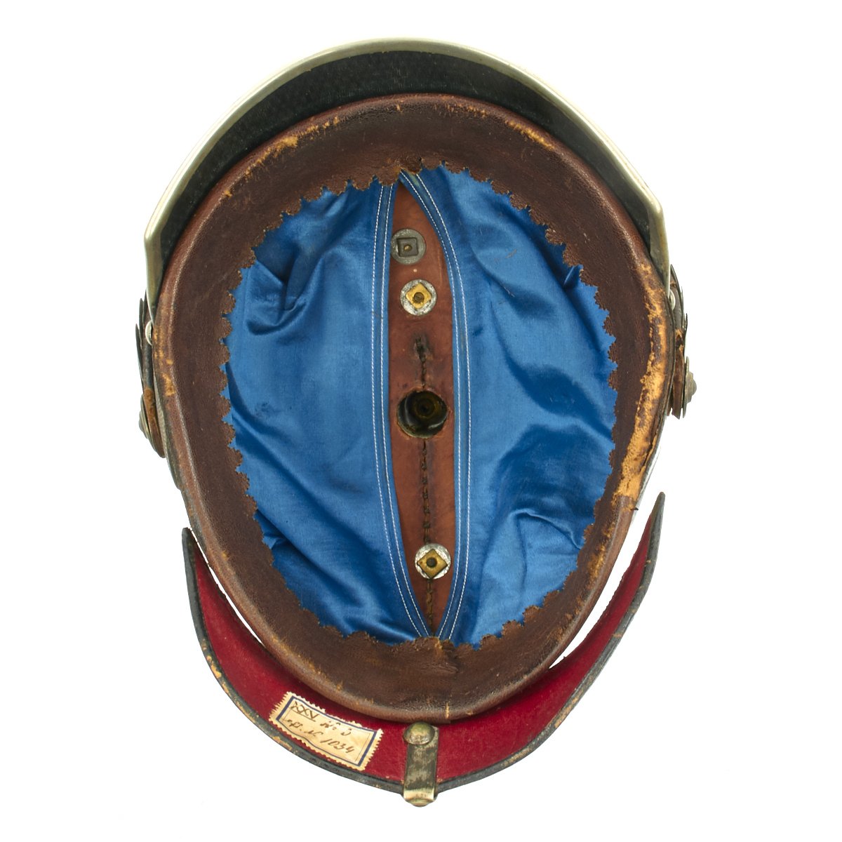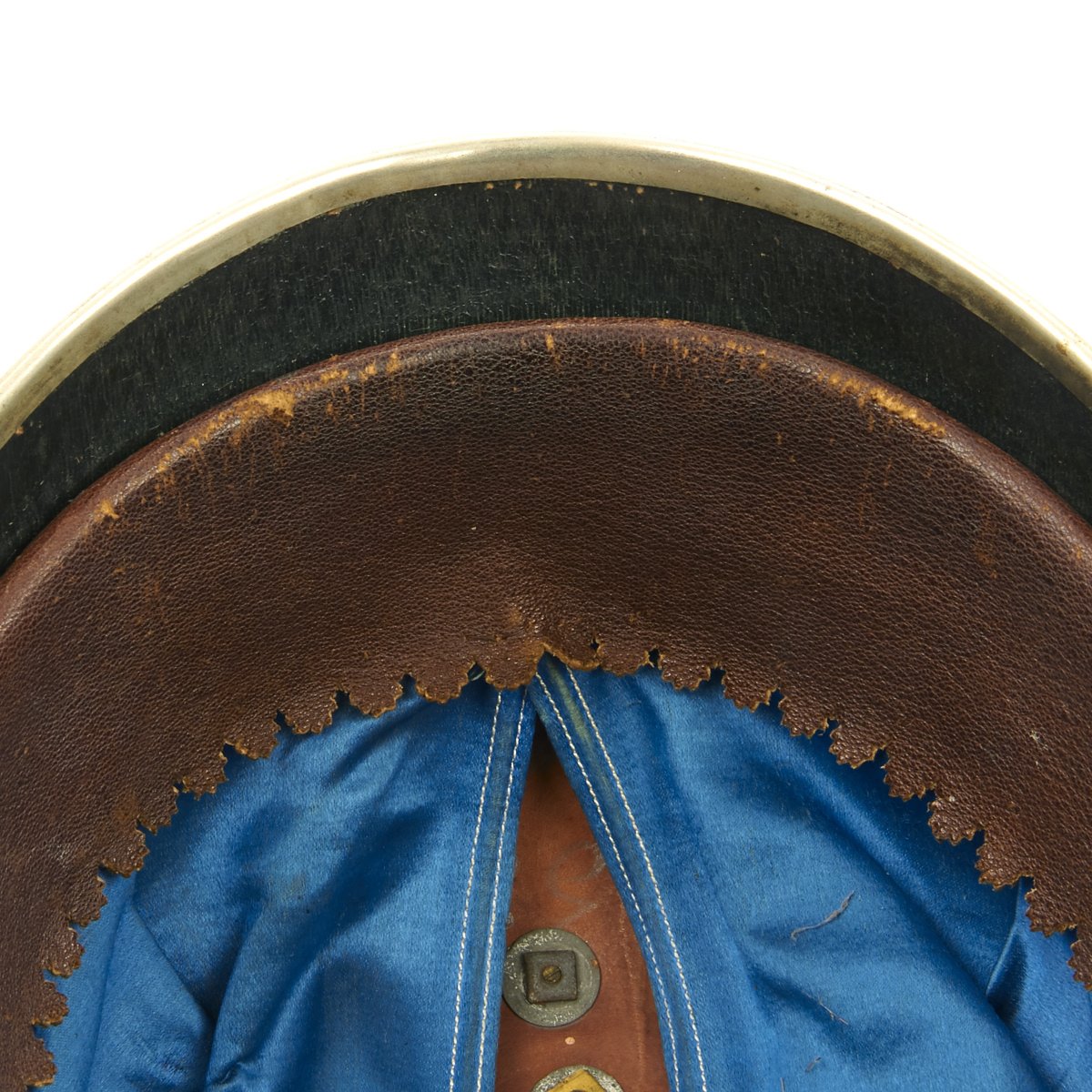 The interior of the Pickelhaube is in excellent condition. It has a correct brown leather sweatband that is entirely intact as well as a fantastic blue silk liner. All the metal hardware securing metal fittings are present and period. There is also a paper tag to the rear neck guard interior that appears to be a regimental denotation.