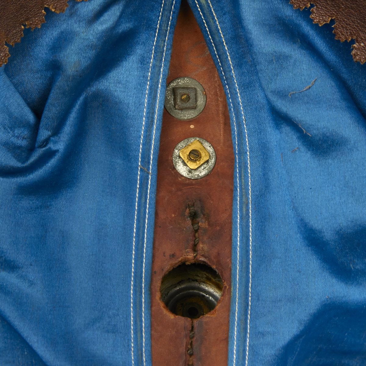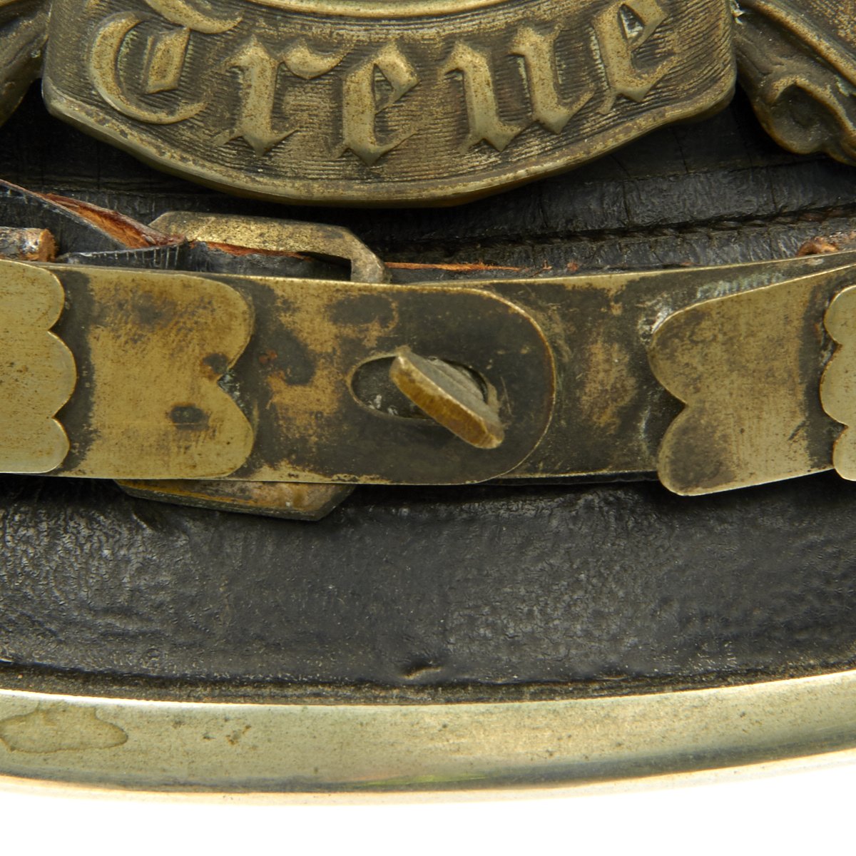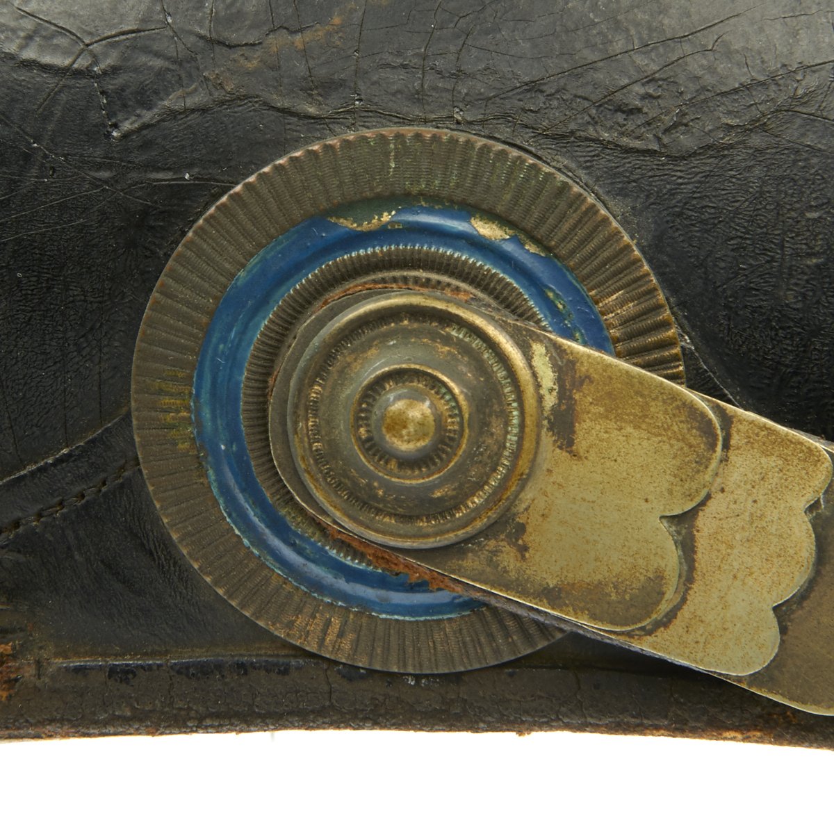The interior of the Pickelhaube is in excellent condition. It has a correct brown leather sweatband that is entirely intact as well as a fantastic blue silk liner. All the metal hardware securing metal fittings are present and period. There is also a paper tag to the rear neck guard interior that appears to be a regimental denotation.