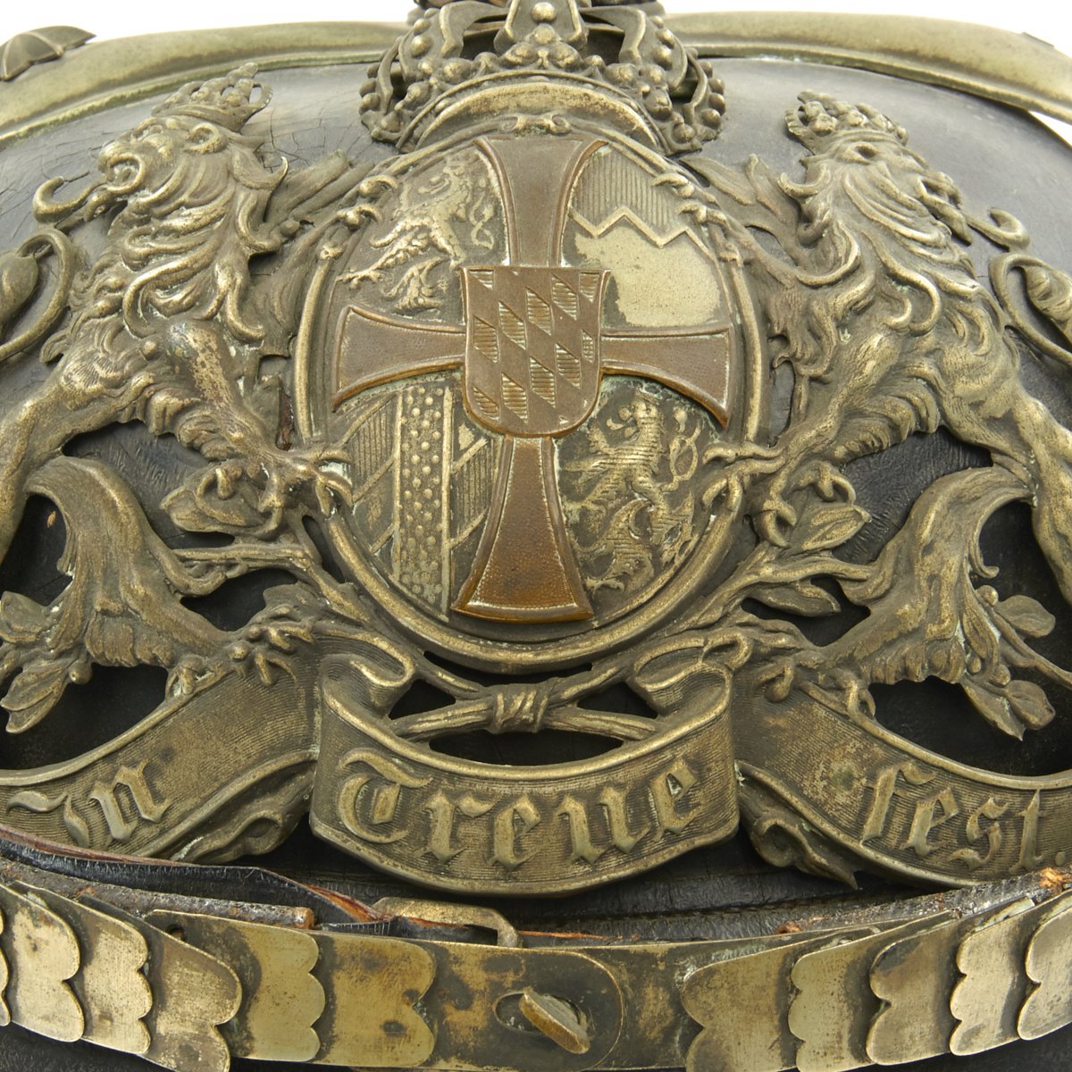 The Bayern Pickelhaube model 1886 was first worn by Bayern officers on 01 April 1887. The Infantry, Jäger, and Artillery Mannschaften (Other Ranks) were gradually equipped with the Pickelhaube from 1887 to 1890. The helmet features a large Bayern Wappen (front plate), the spike is fluted and secured onto the helmet with a cruciform spike base, and the front visor is squared.