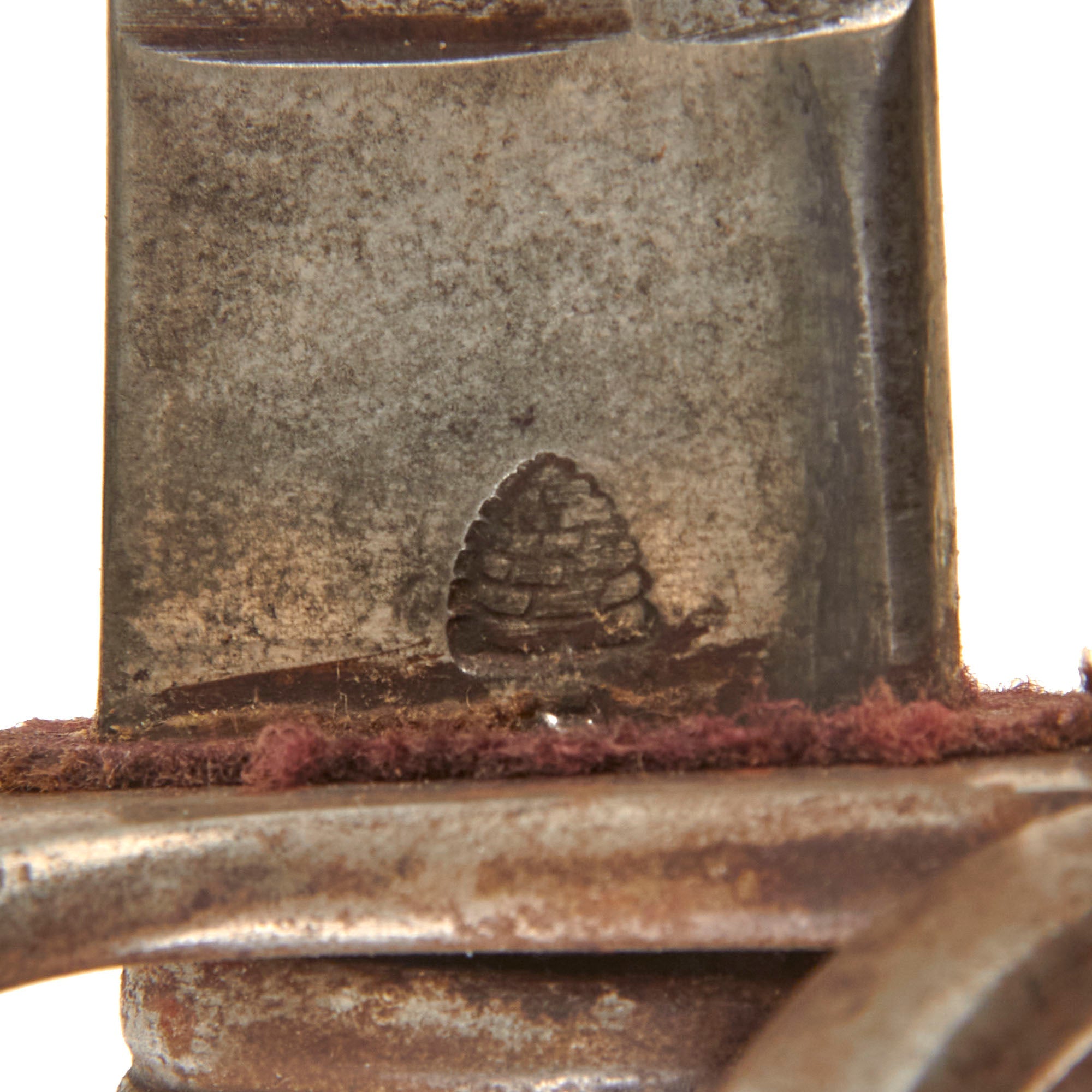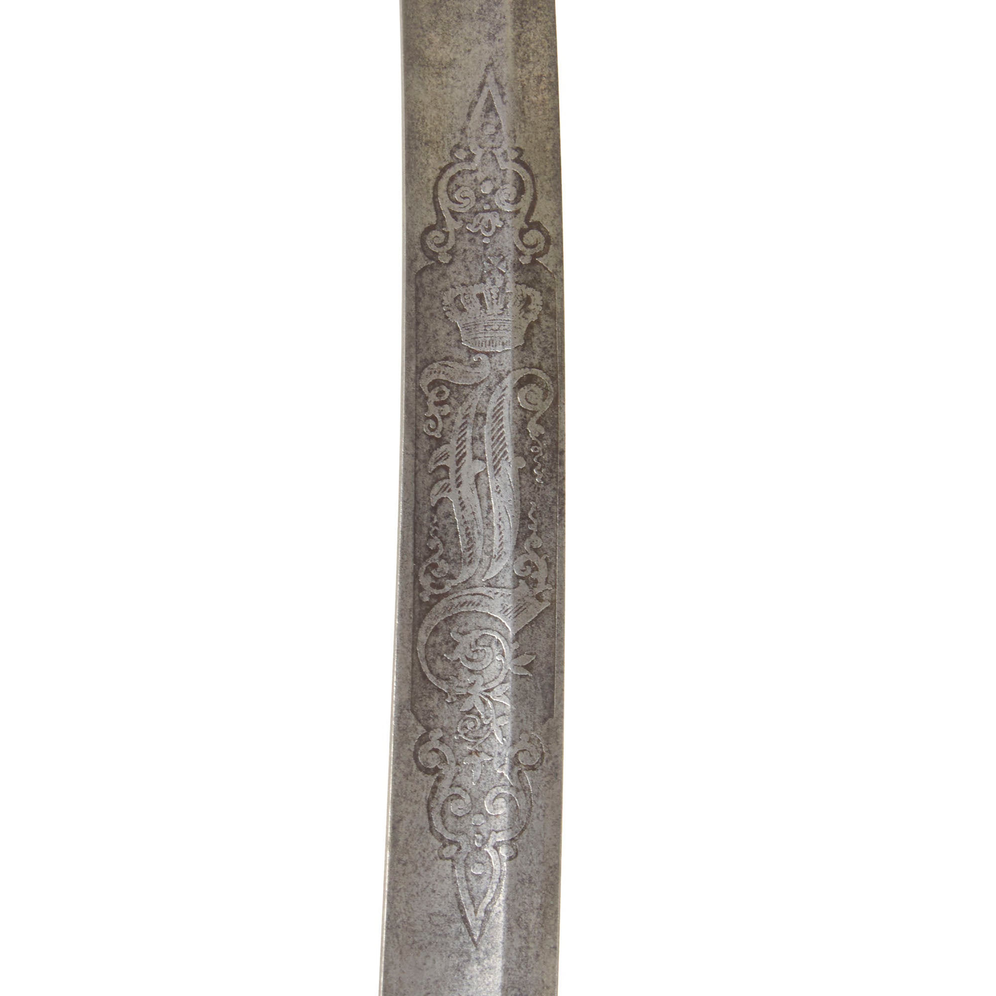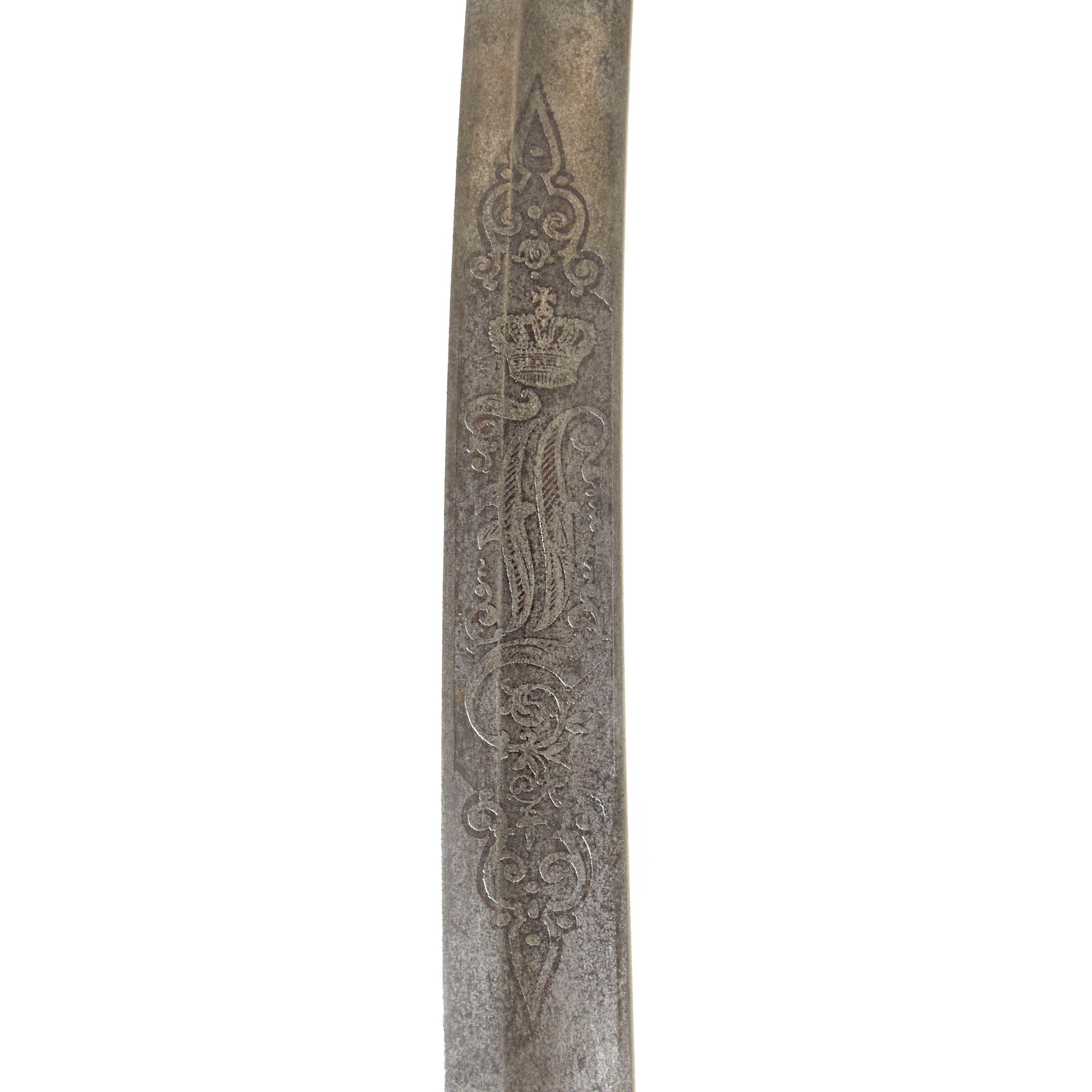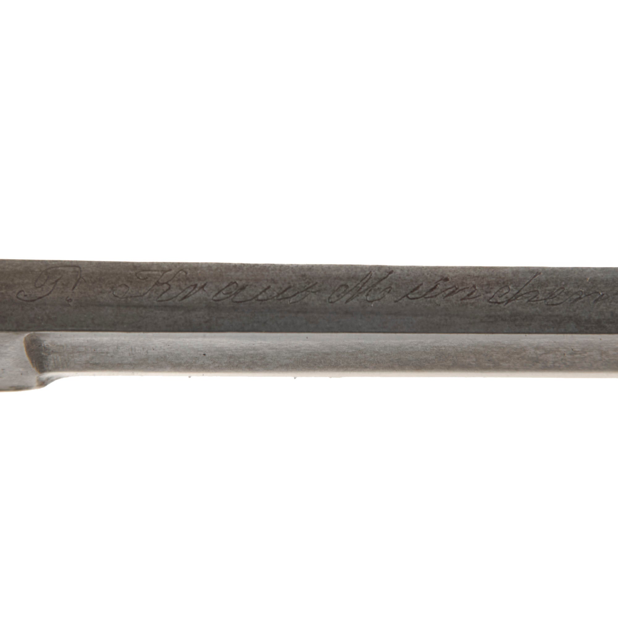 The spine of this example is etched with the retailer of the sword, “F. Kraus München”, for the maker. The ricasso is stamped with a beehive logo, which if often attributed to Samuel Hoppe, a renowned 19th-century sword cutler based in Solingen, Germany. The sword is etched on both sides with the Royal Cypher of King Ludwig II, which is a Crown over the mirrored letters “L”.
