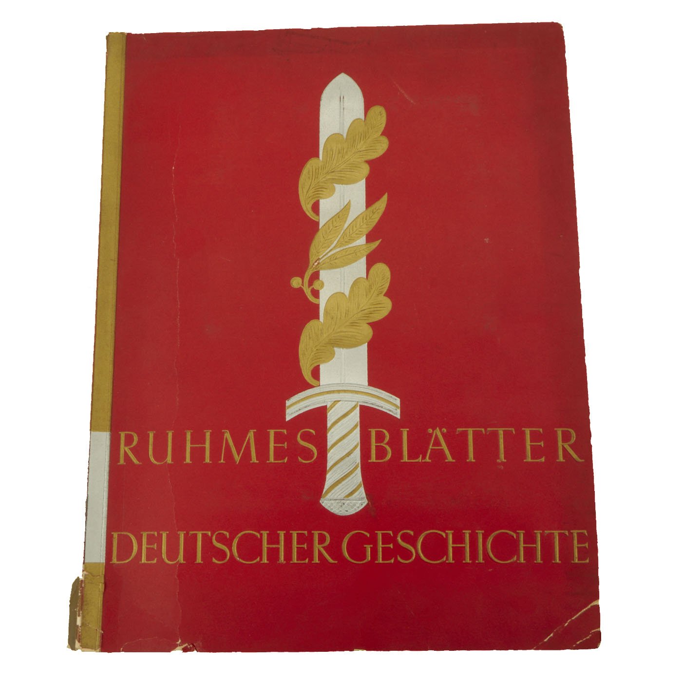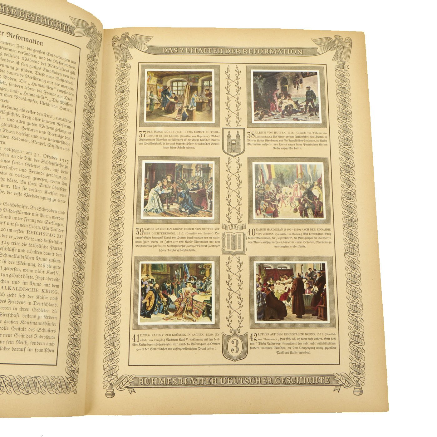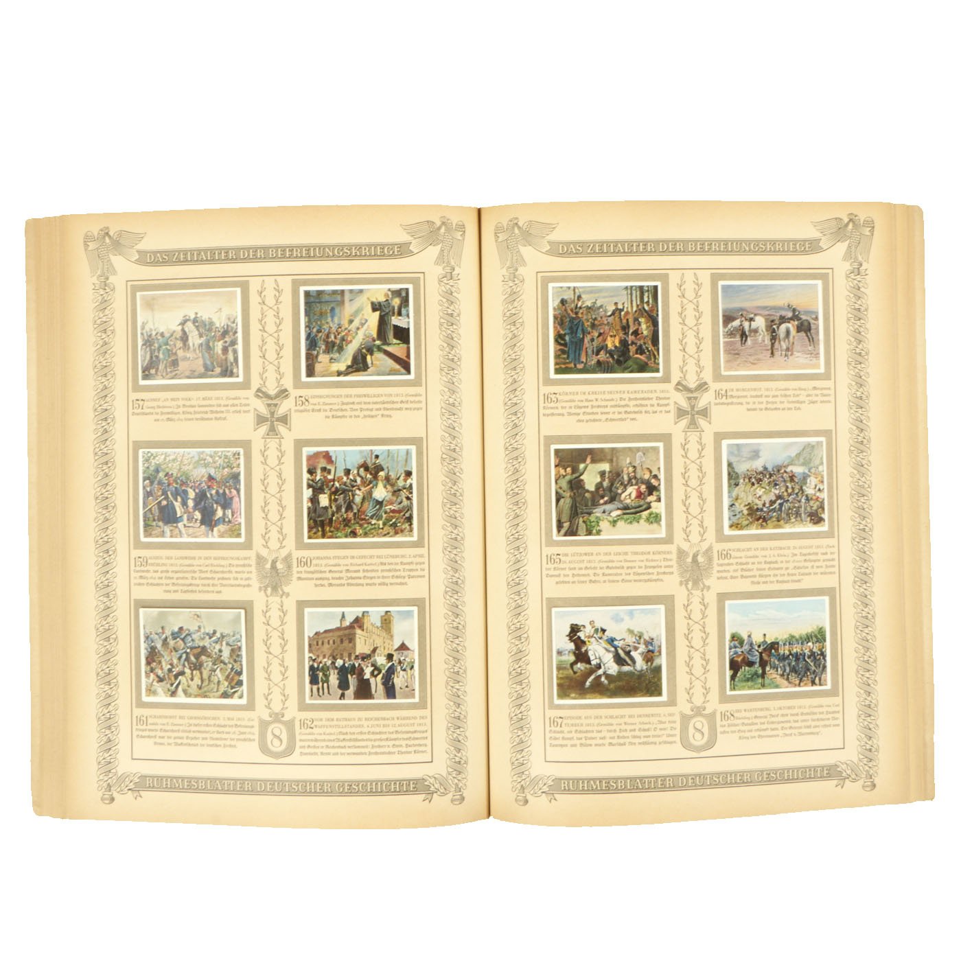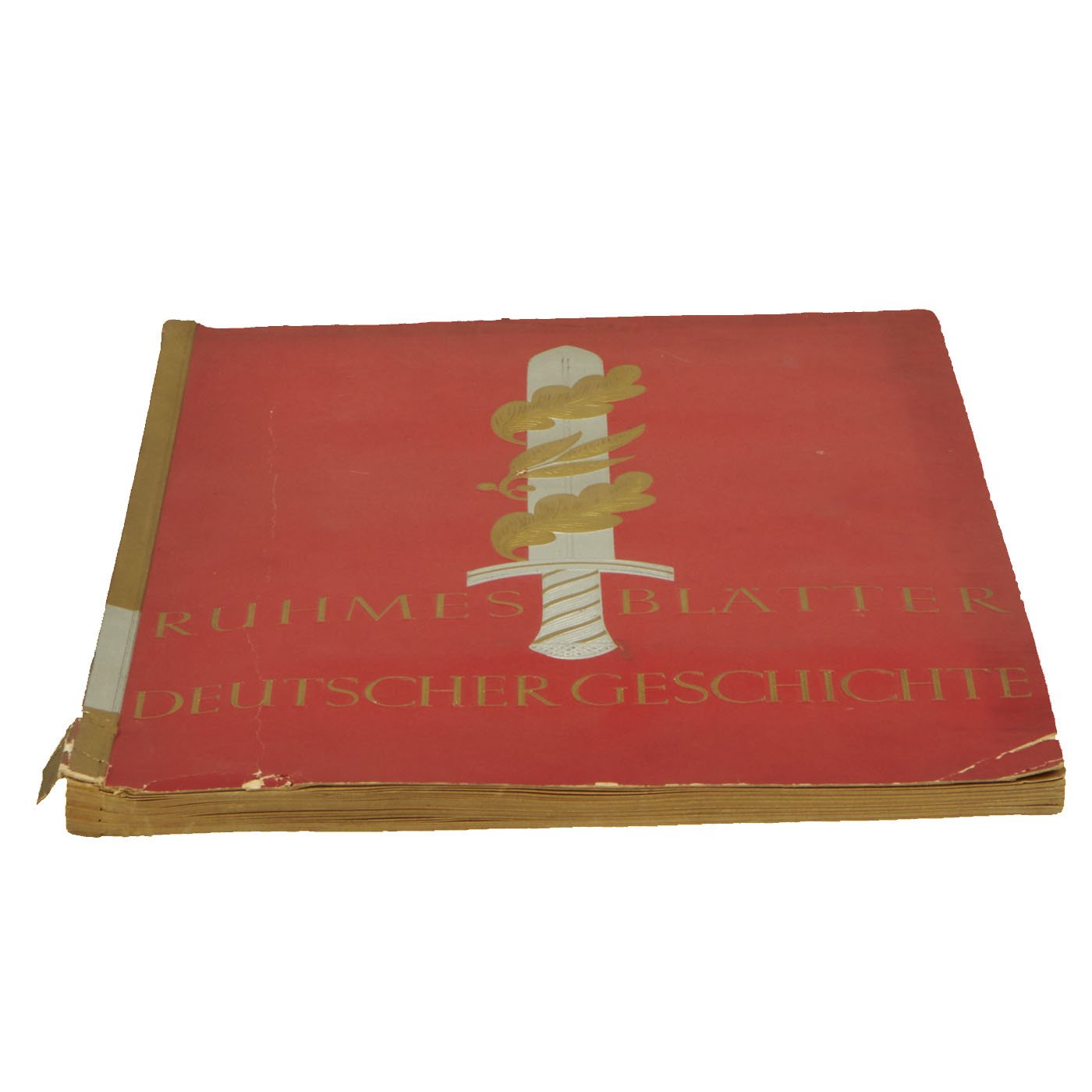Ruhmesblatter Deutscher Geschichte - German Cigarette Card Album - Soft cover album of German cigarette cards titled RUHMESBLATTER DEUTSCHER GESCHICHTE. Published by Waldorf-Astoria and contains 252 color cigarette cards. Moderate wear/nicks to edge of wraps.
