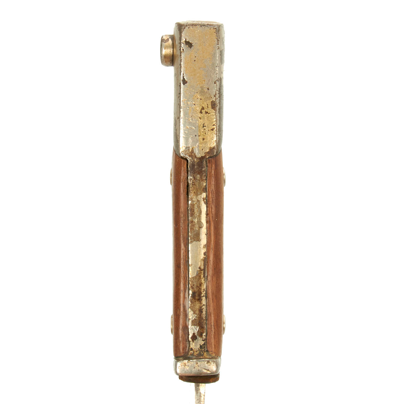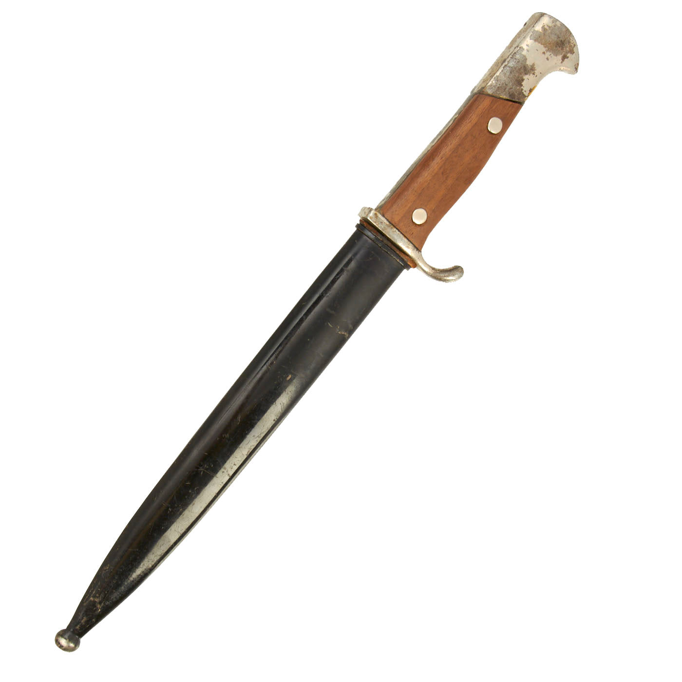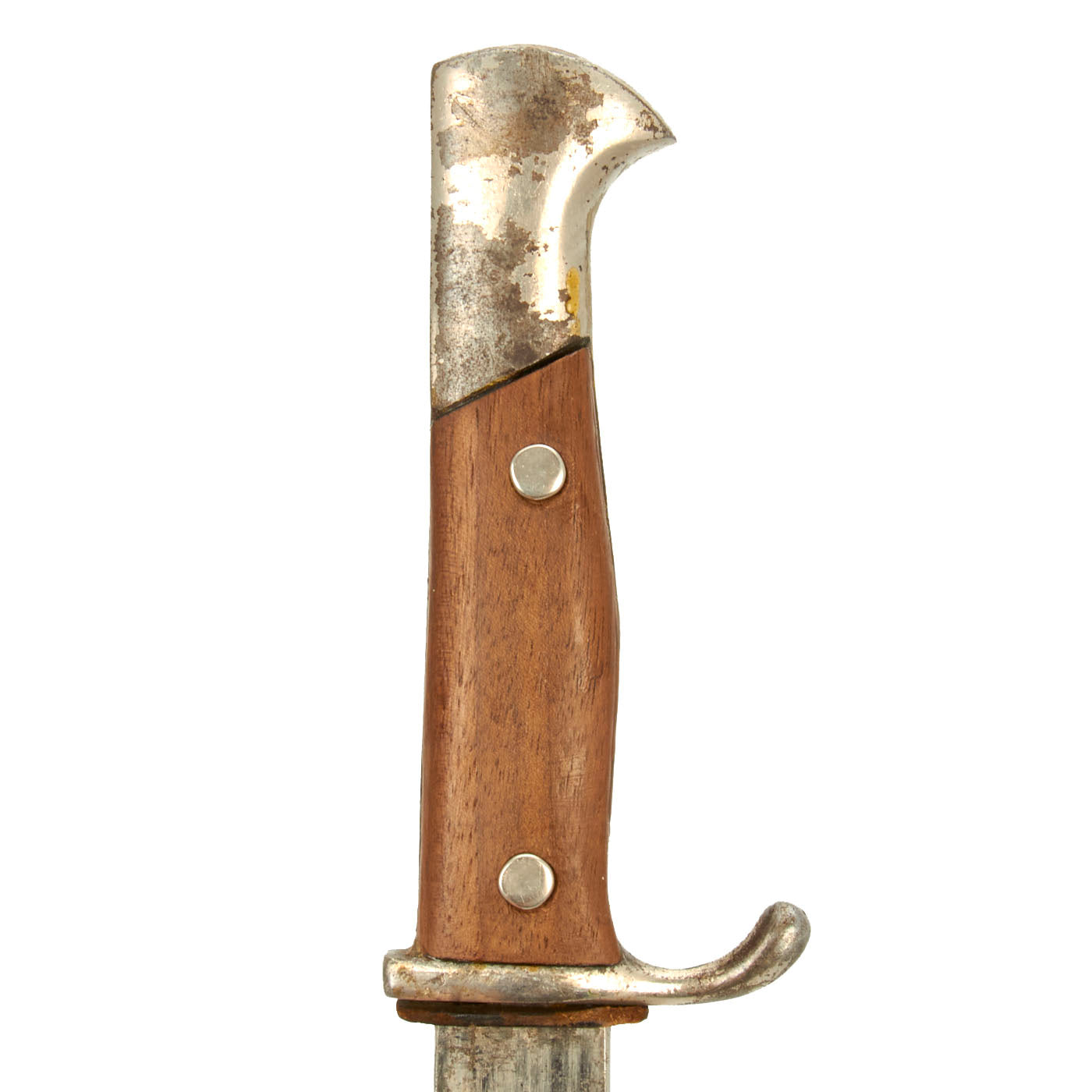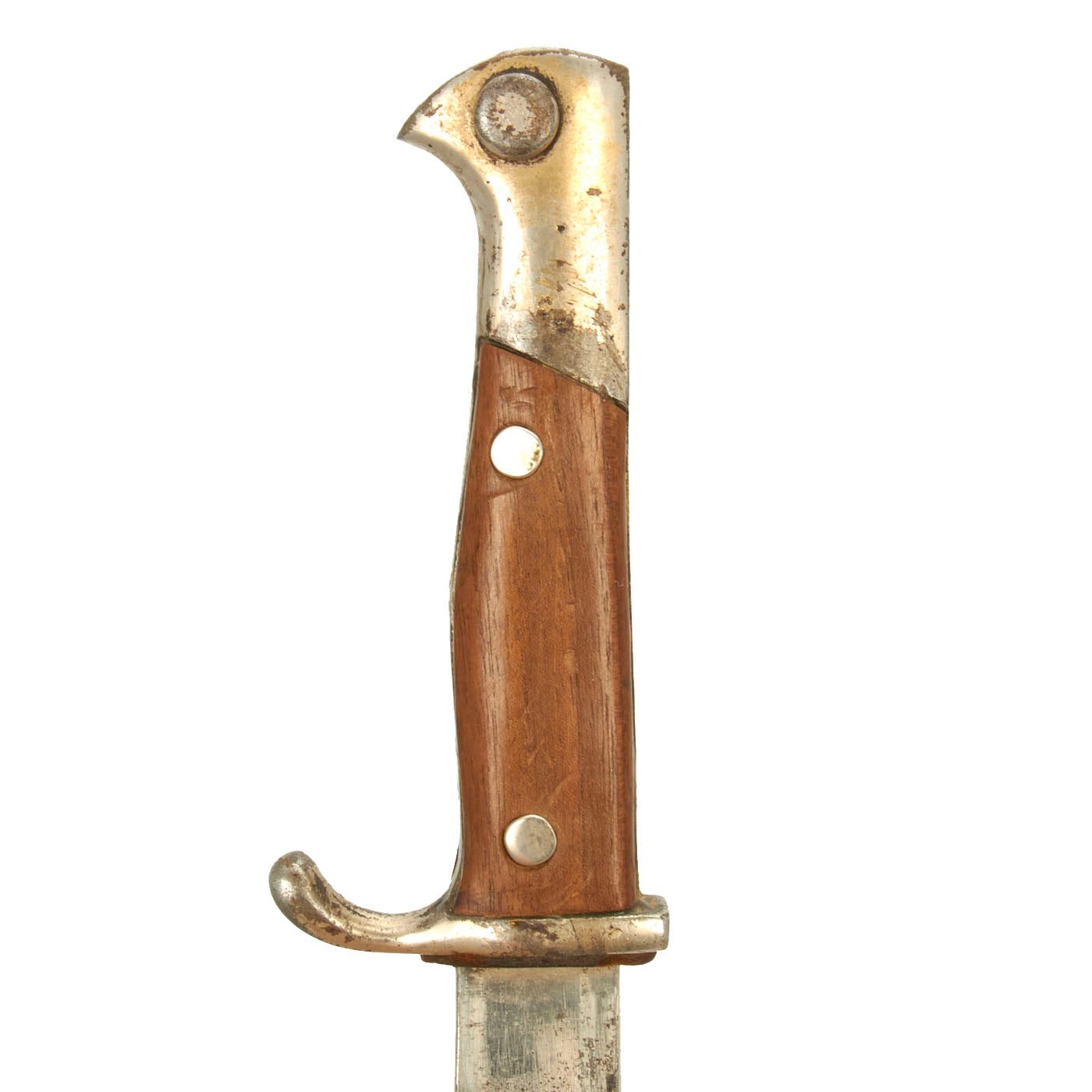 Original Item: Only One Available. The K-98 dress bayonet was a dress version of the combat style, and was worn by enlisted and NCO personnel for dress and parade occasions. The bayonets were finished with a high-quality nickel plating, often with stag or bakelite grip plates and black painted scabbard. The choice of blade length was left to the purchaser, either the nickel-plated short (20cm) or long (25cm) version. There was usually a red or green colored felt insert in the rifle slot and the bayonet was suspended from a black or brown leather frog. Some had a functional bayonet latch, while it was ornamental on some.