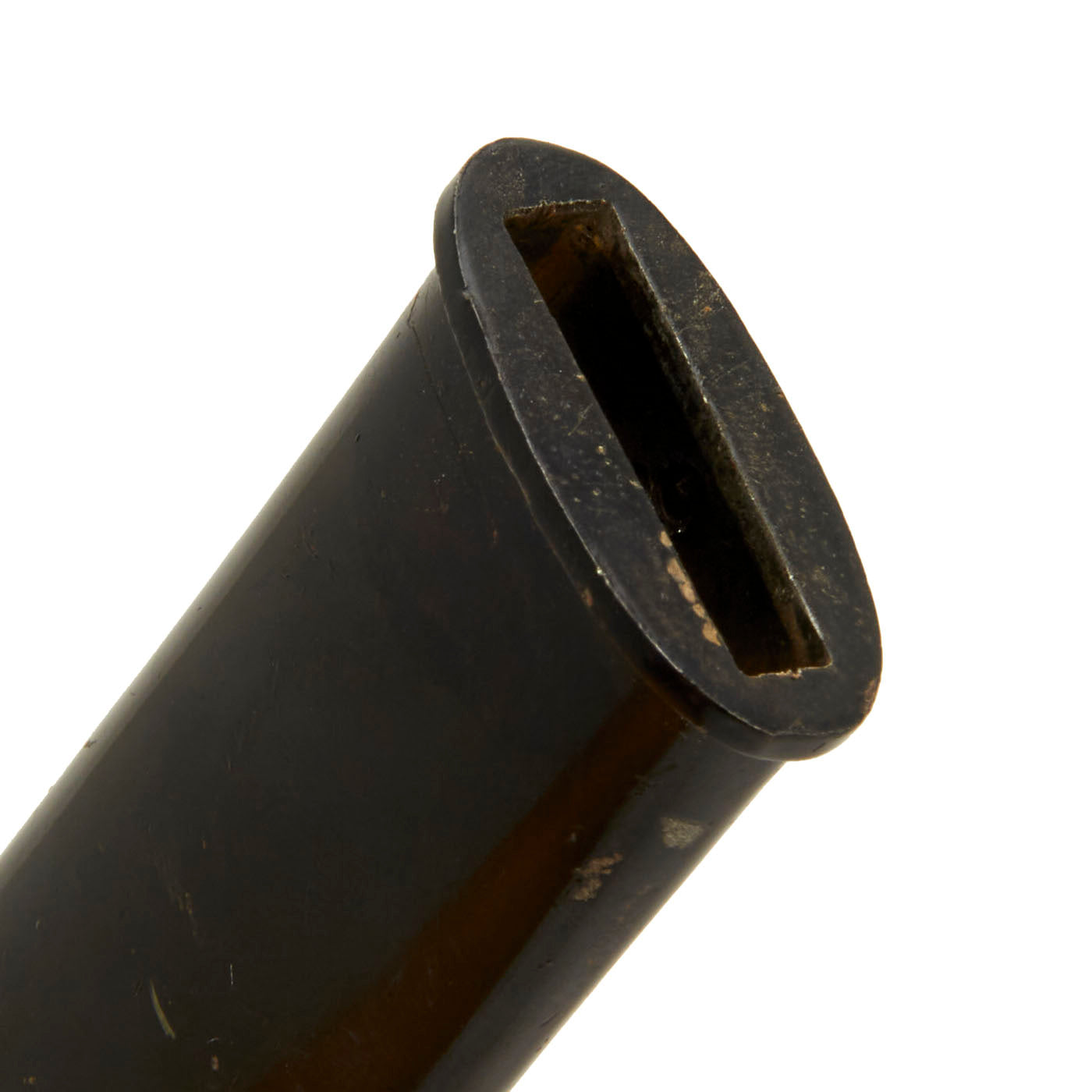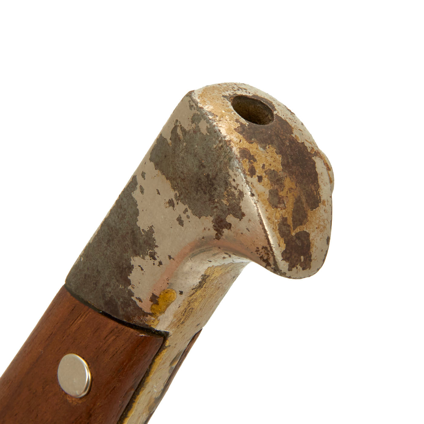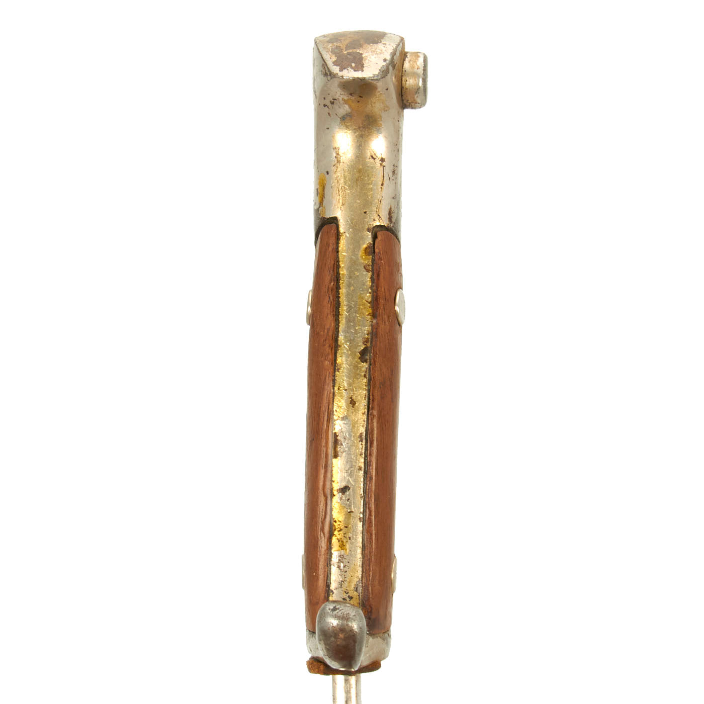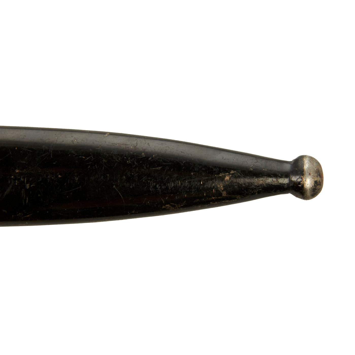 The blade on this example is nickel-plated, as were all dress bayonets, but it was sharpened at some point and used, so the plating is worn or missing in areas. There is some light oxidation where the plating has worn away. The original leather blade buffer is still present in the cross guard. The scabbard is straight throughout and has black enamel paint. This paint is still in good condition with just a couple of scratches, and the usual crazing and checking from age.