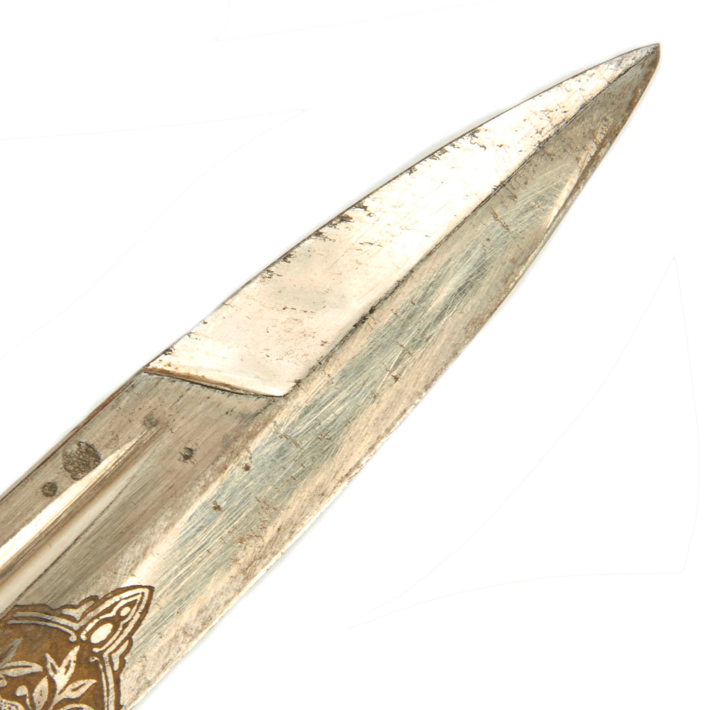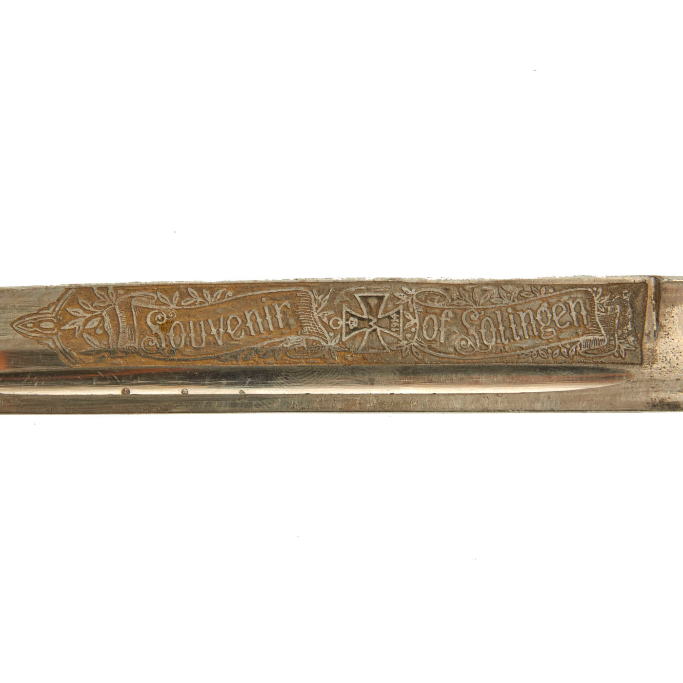 This example was made as a Souvenir during or just at the end of WWI, as indicated by the etched panel, which reads Souvenir of Solingen on two banners. Between these is an Iron Cross 1914 design, and the panel has a very nice laurel leaf border. It has has a nice iron hilt, though about half of the nickel plating has flaked away. It has a mortise button, but it is just for display, and is not functional at all. The grip plates are wood, retained by polished rivets.