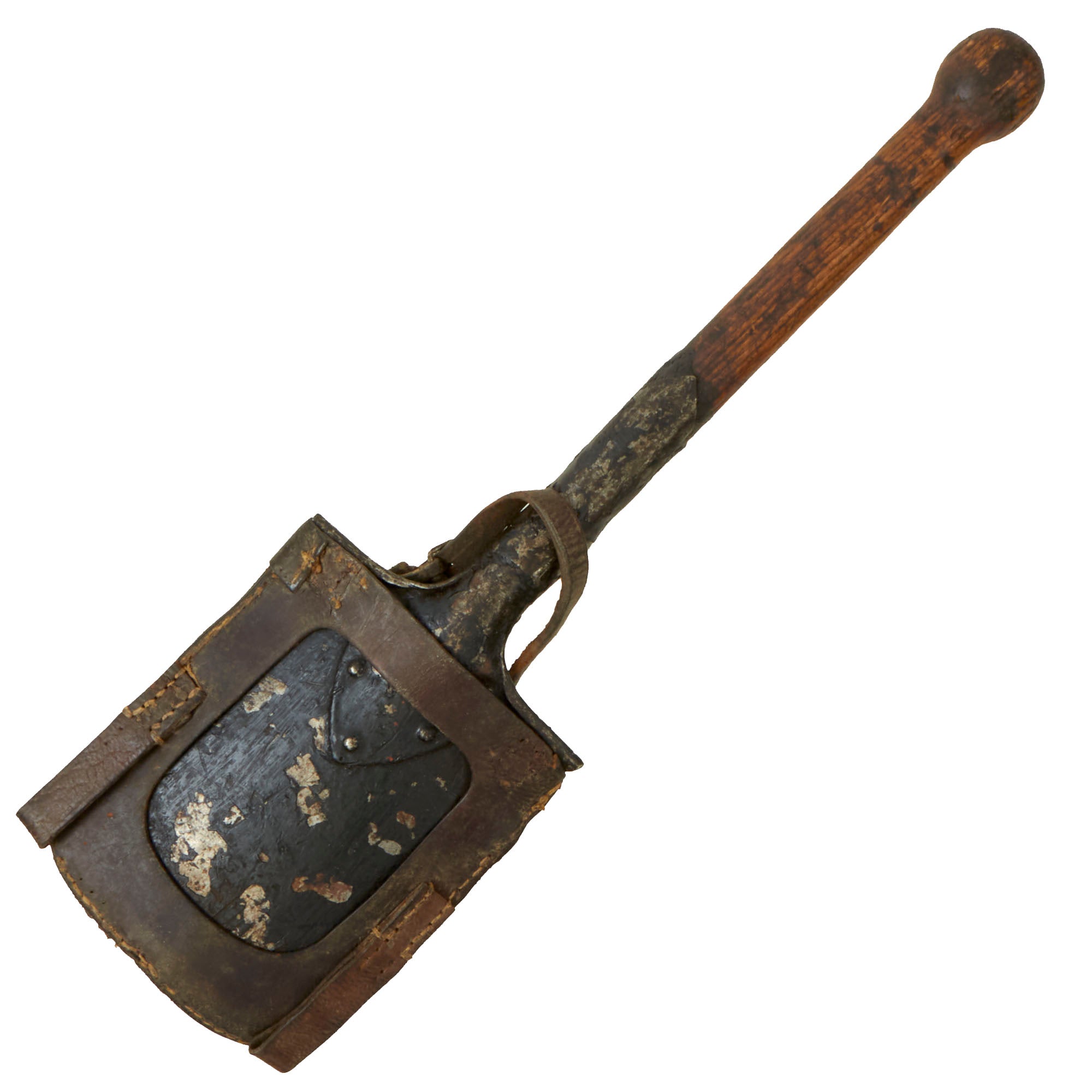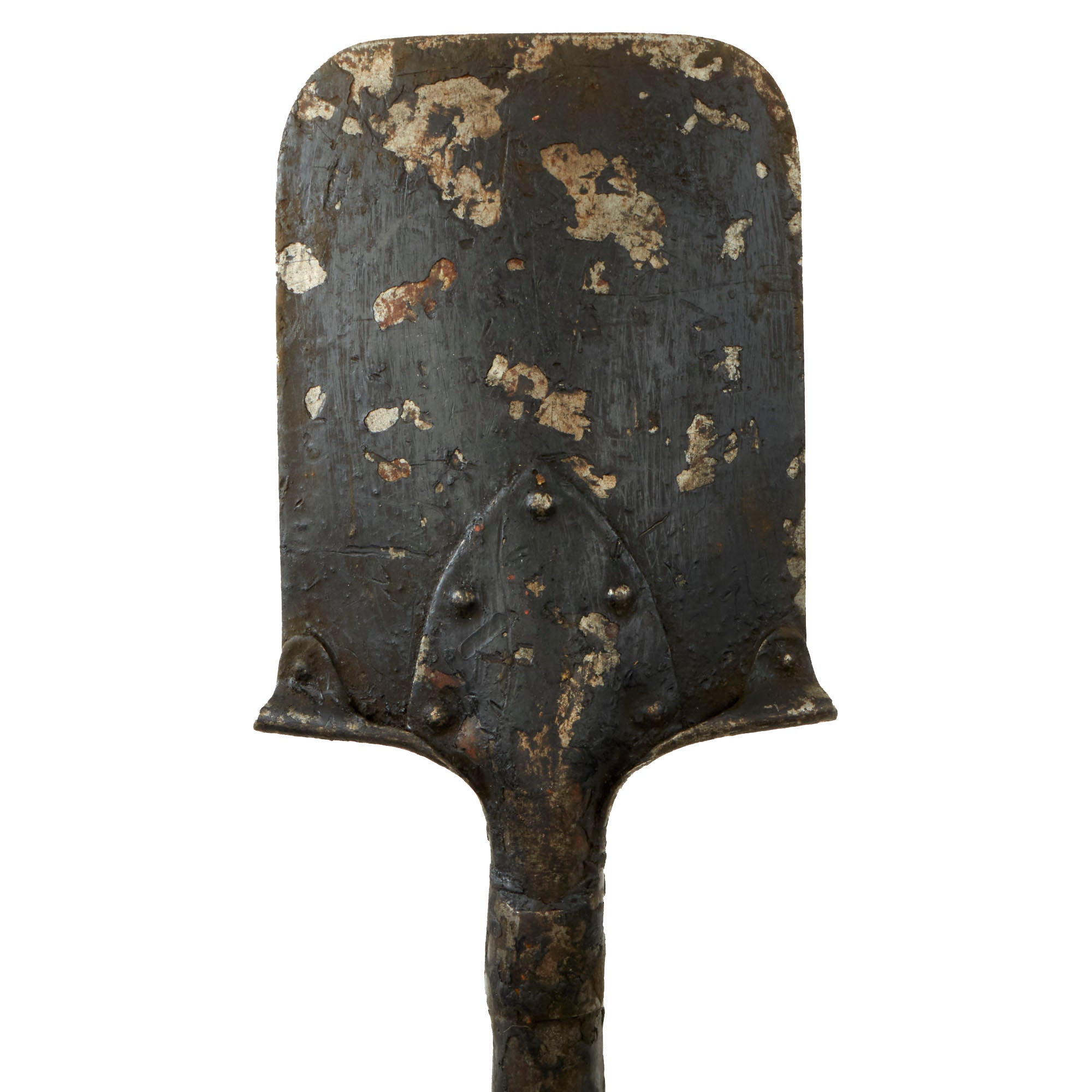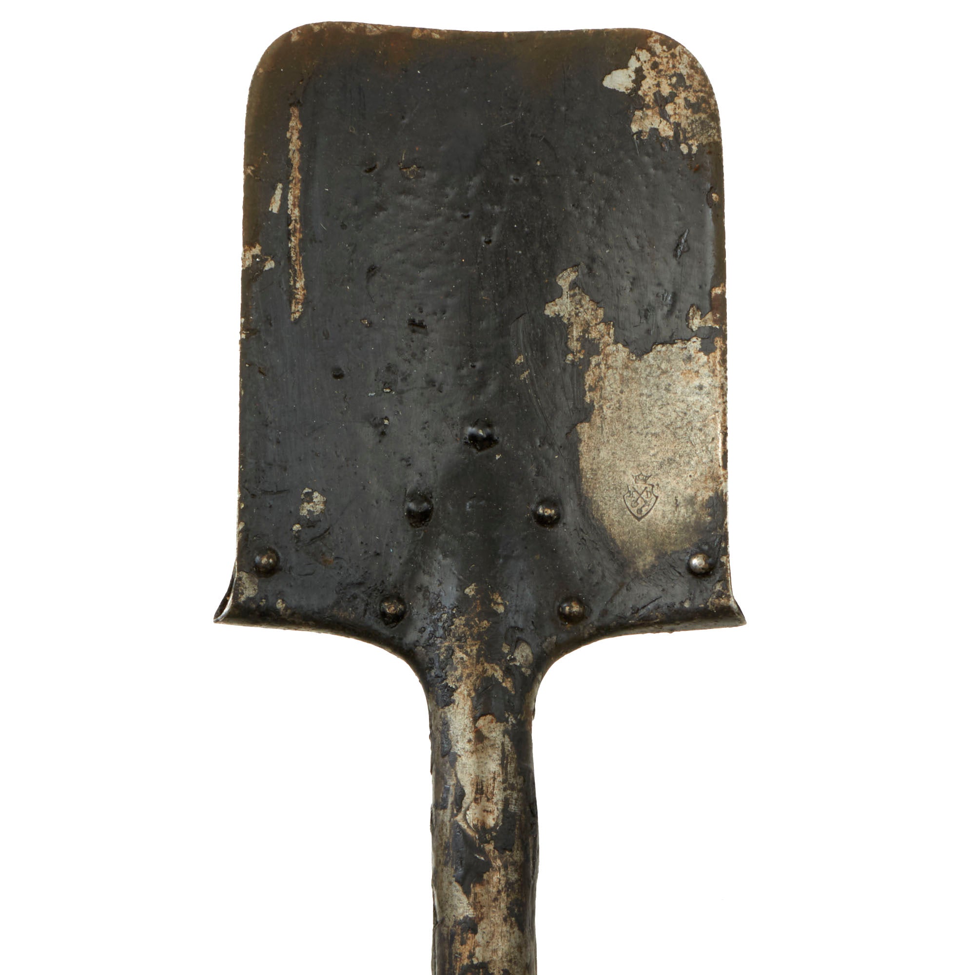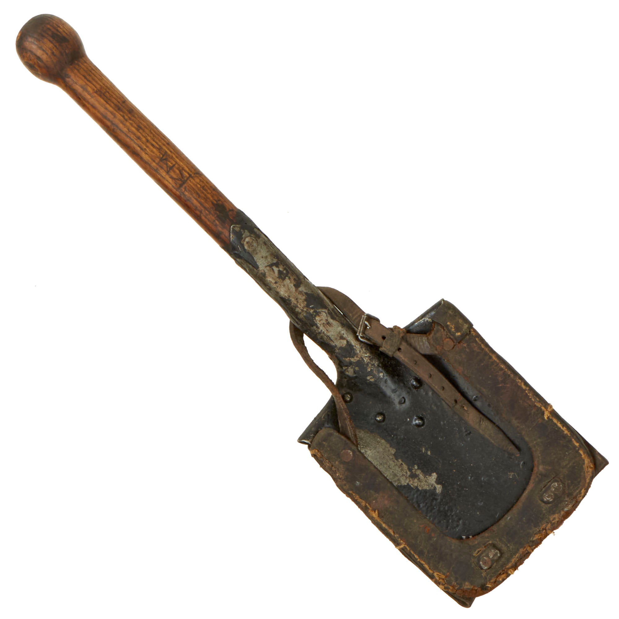 Original Item: Only One Available. This is a very nice service used German WWI Era Kleines Schanzzeug (Short Entrenching Tool) Shovel, which is a design that originally came about in the 1880s, but was still being made relatively unchanged in size and shape during the WWII Period. The main differences between the early and later produced examples were markings as well as construction methods. All utilized a short wooden handle riveted to a rectangular shovel head, but by WWII the two halves of the shovel head were welded together, not held together by rivets such as this example.