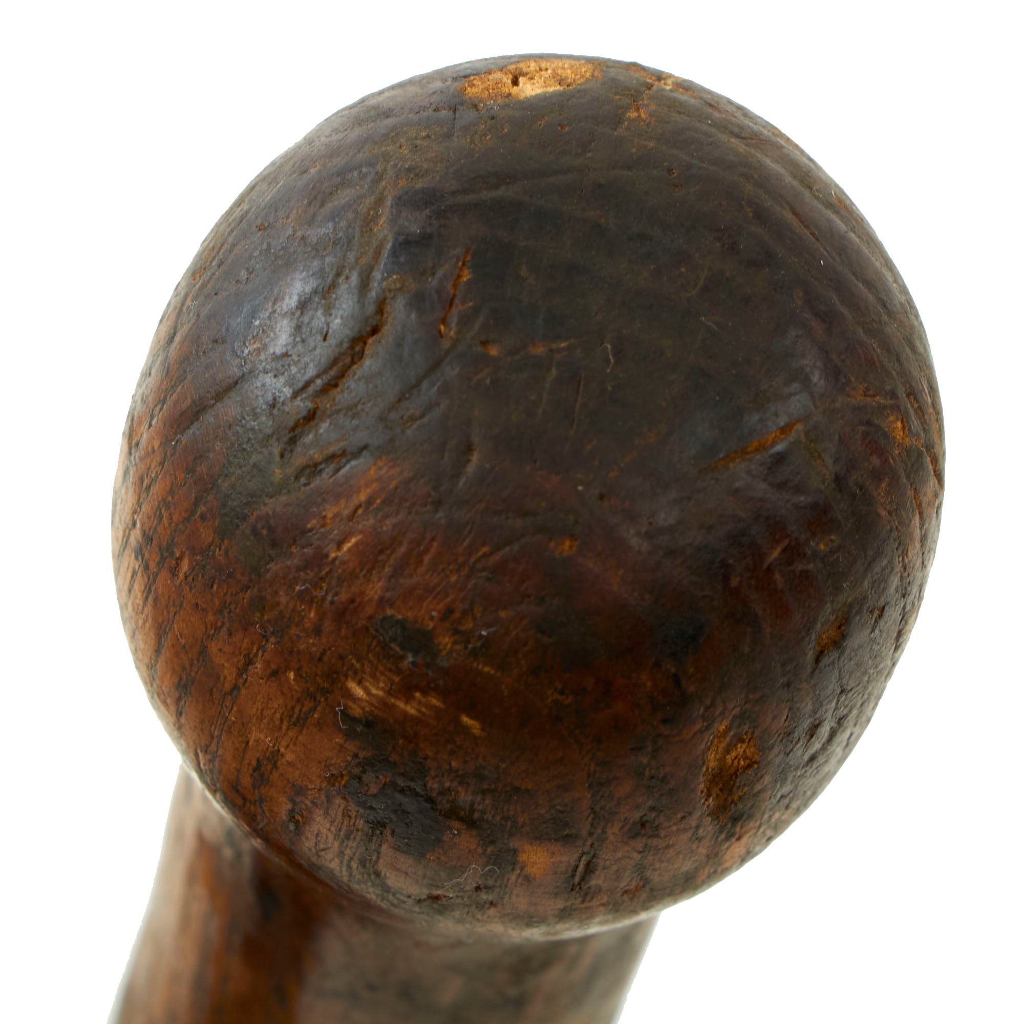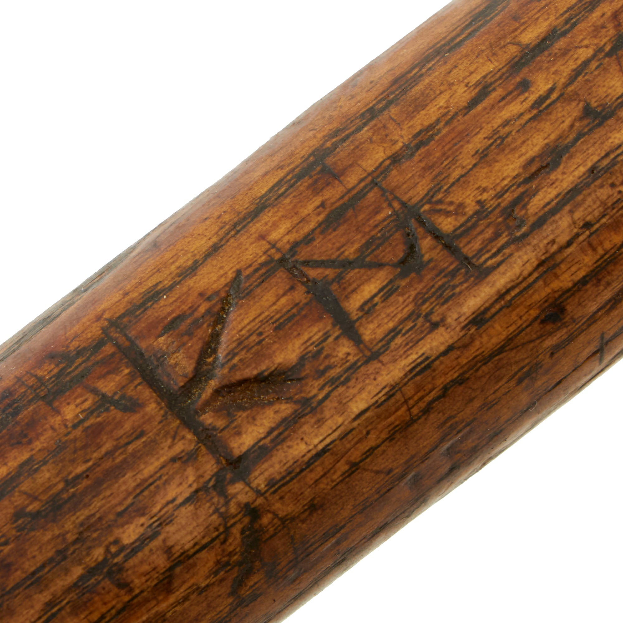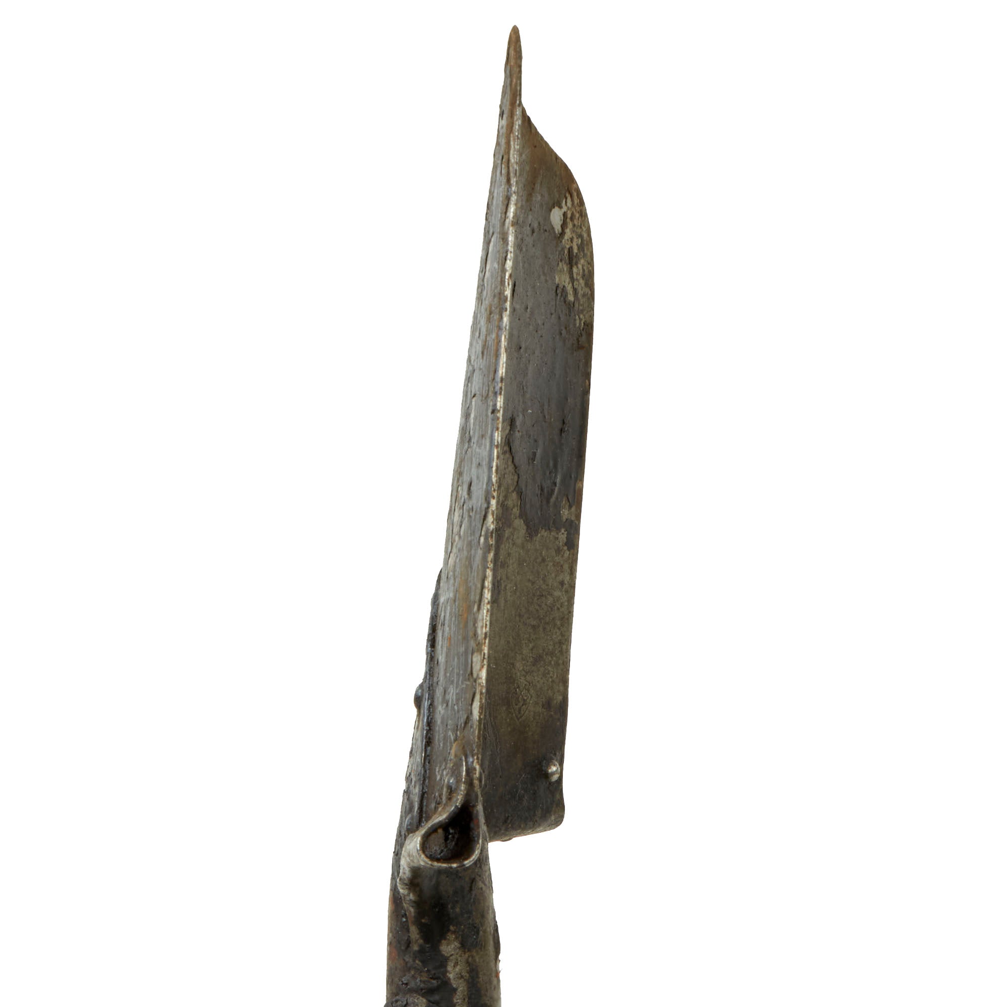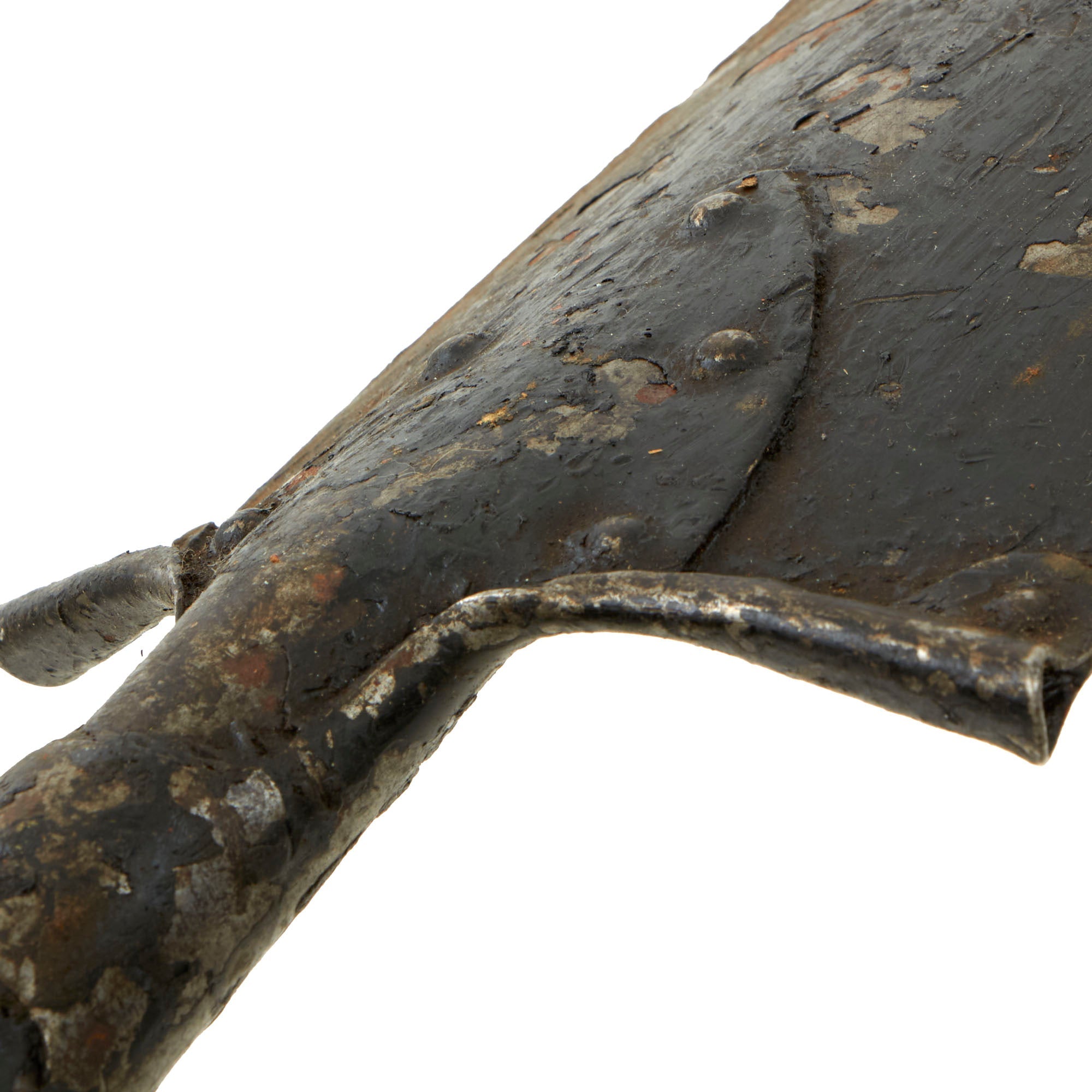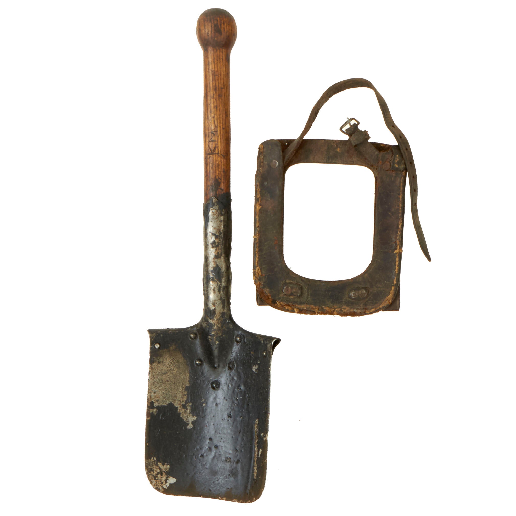 Original Item: Only One Available. This is a very nice service used German WWI Era Kleines Schanzzeug (Short Entrenching Tool) Shovel, which is a design that originally came about in the 1880s, but was still being made relatively unchanged in size and shape during the WWII Period. The main differences between the early and later produced examples were markings as well as construction methods. All utilized a short wooden handle riveted to a rectangular shovel head, but by WWII the two halves of the shovel head were welded together, not held together by rivets such as this example.