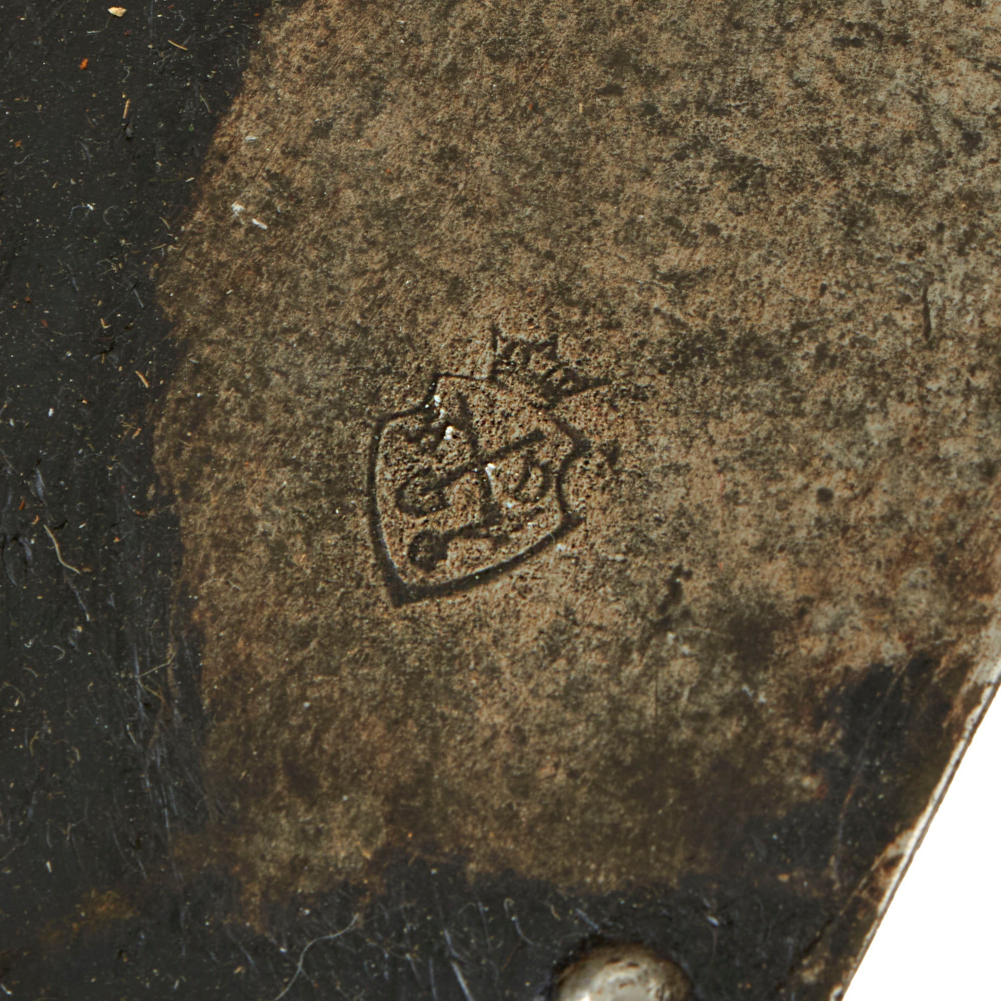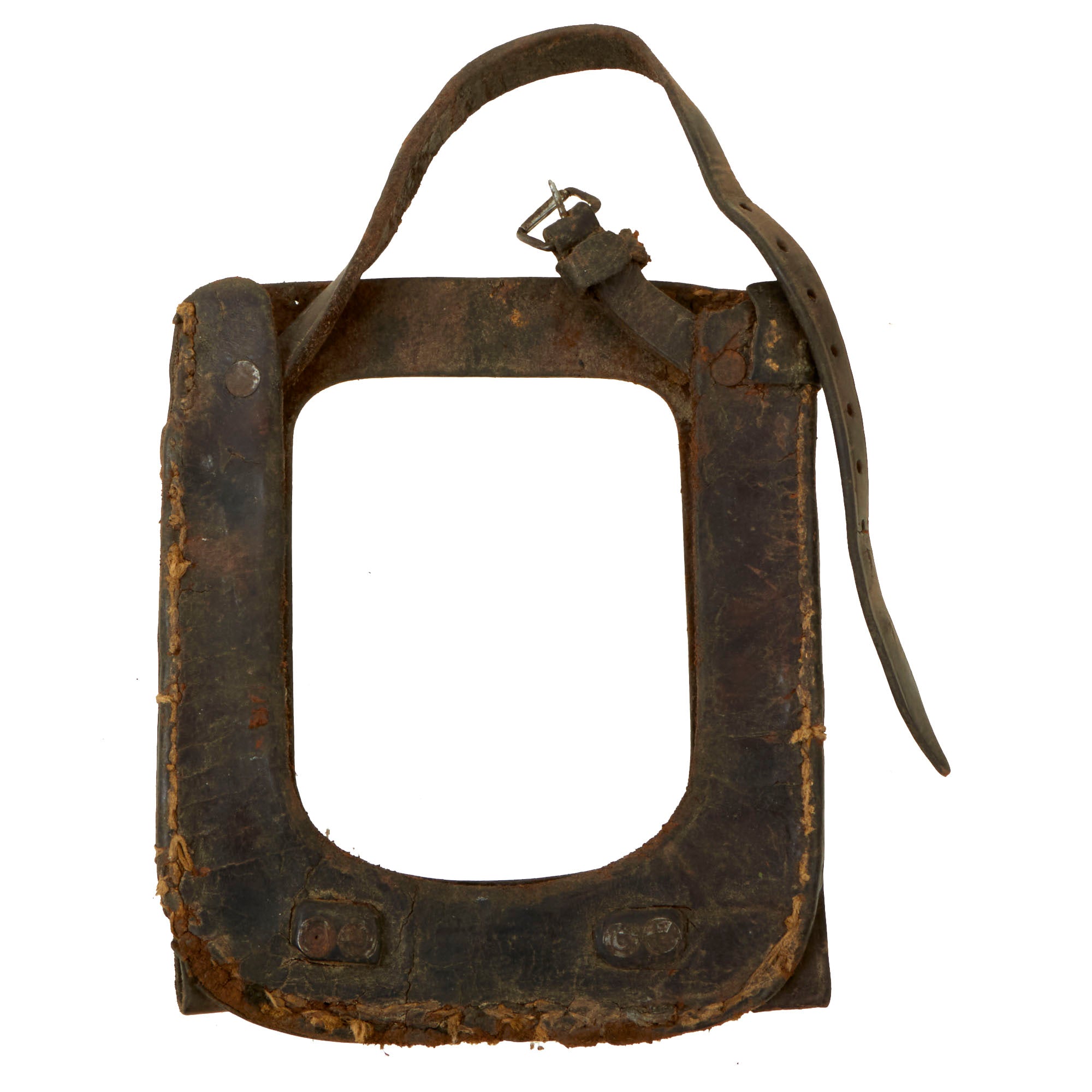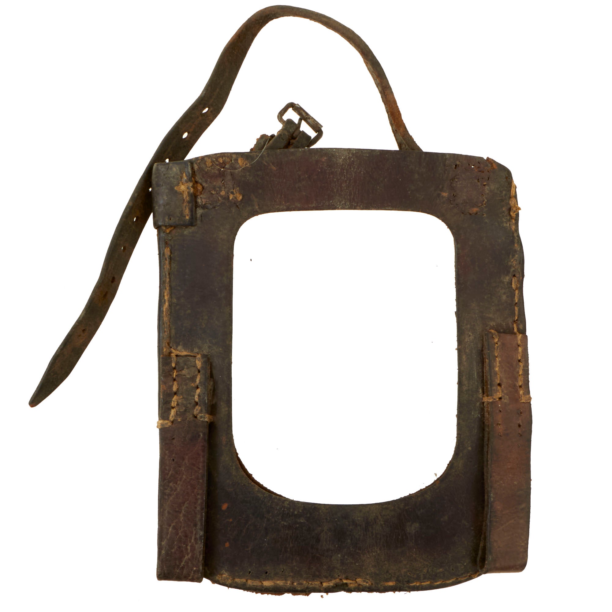 For use in WWII it was paired with a brown leather shovel carrier that was designed to attach to the belt. This looks to have seen extensive use, as well as field modifications and repairs. The original belt loops on the bottom tore off, and were replaced by two that did not extend as far down. There are also signs of other parts being removed or replaced. Really some fantastic history to this carrier! We checked all over the leather for markings, but unfortunately it is too work for any to have survived.