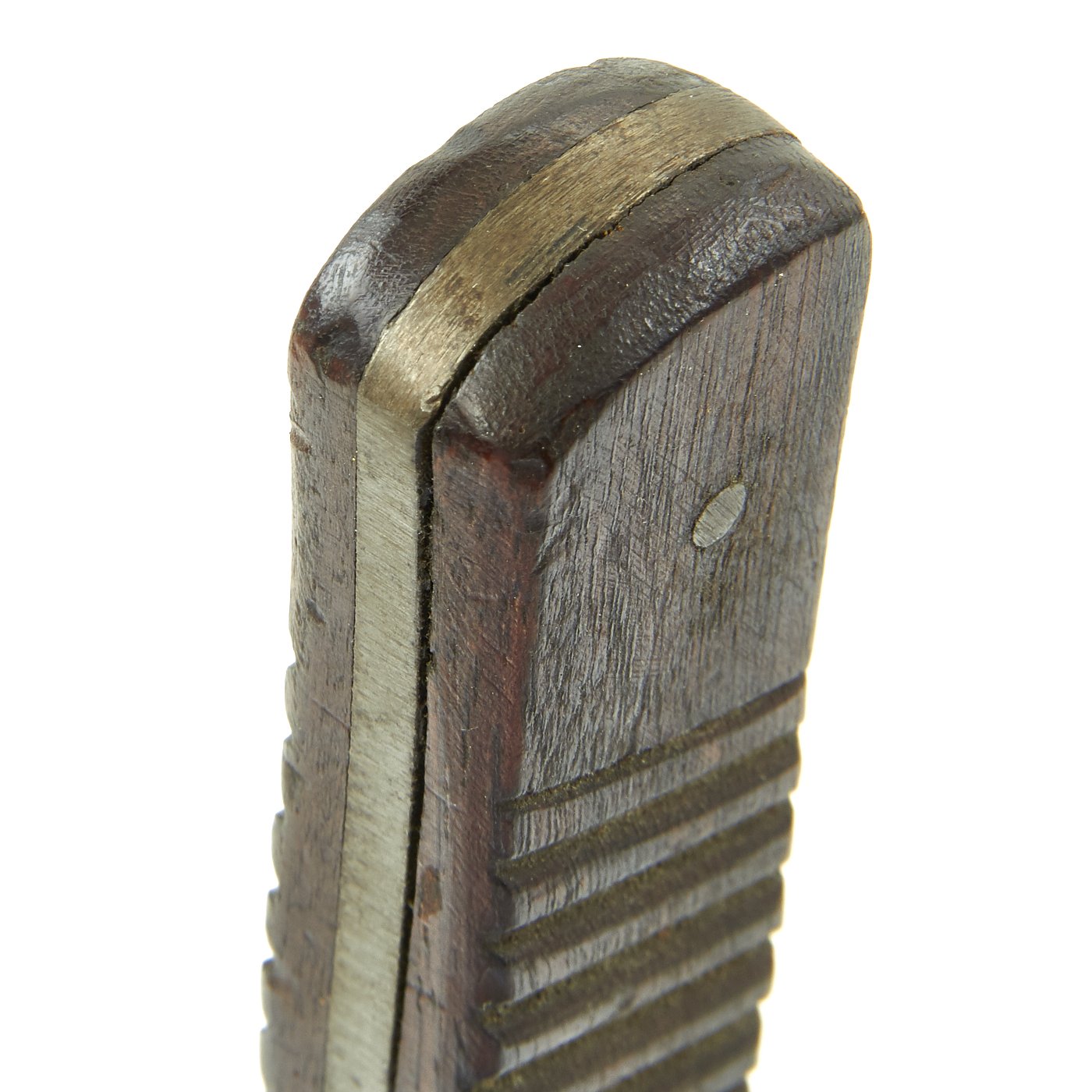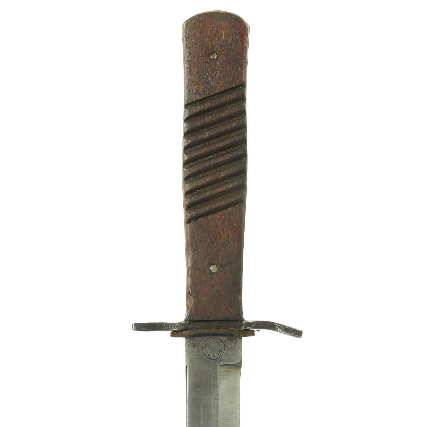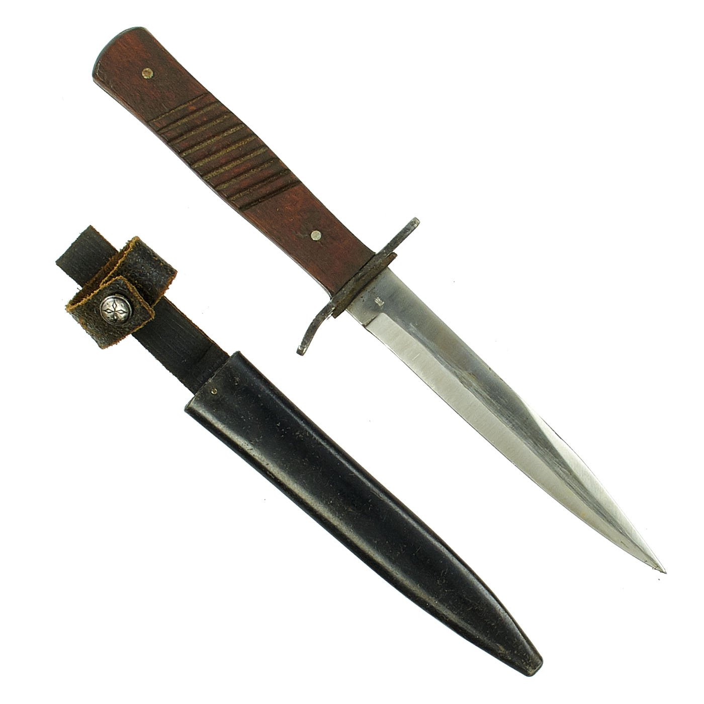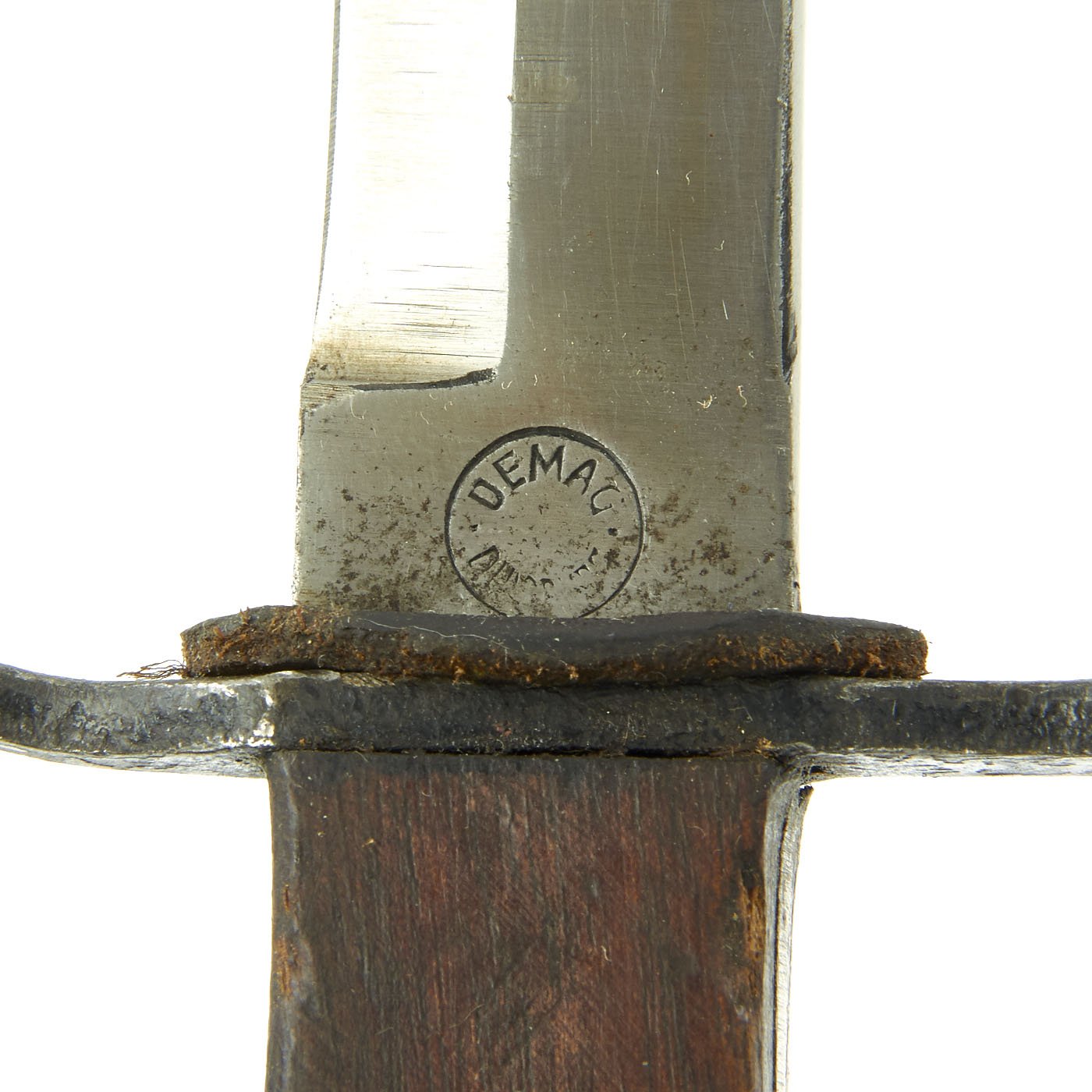 Original Item: Only One Available. This is an excellent example of an original trench fighting knife with scabbard, as used by the Germans in WWI. The design features a full tang with an all wood ribbed hilt secured by two pins. The knife has a double edged dagger blade of 5 3/4", with the top edge only extending half way down the spine. It is marked DEMAG / DUISBURG in a circle in front of the steel cross guard on the blade ricasso. This knife was produced by Deutsche Maschinefabrik A-G (DEMAG) of Duisburg as a private purchase item. The opposite side as a proof mark from one of the Kingdoms / States of Imperial Germany.