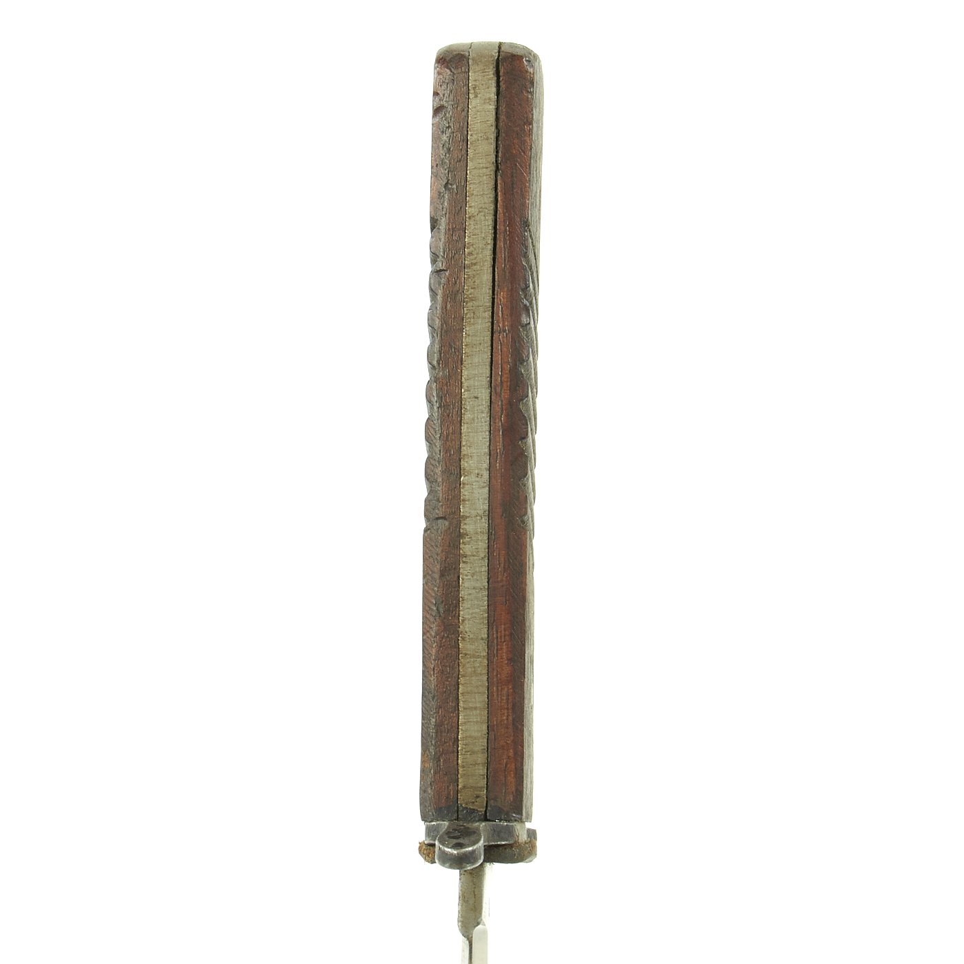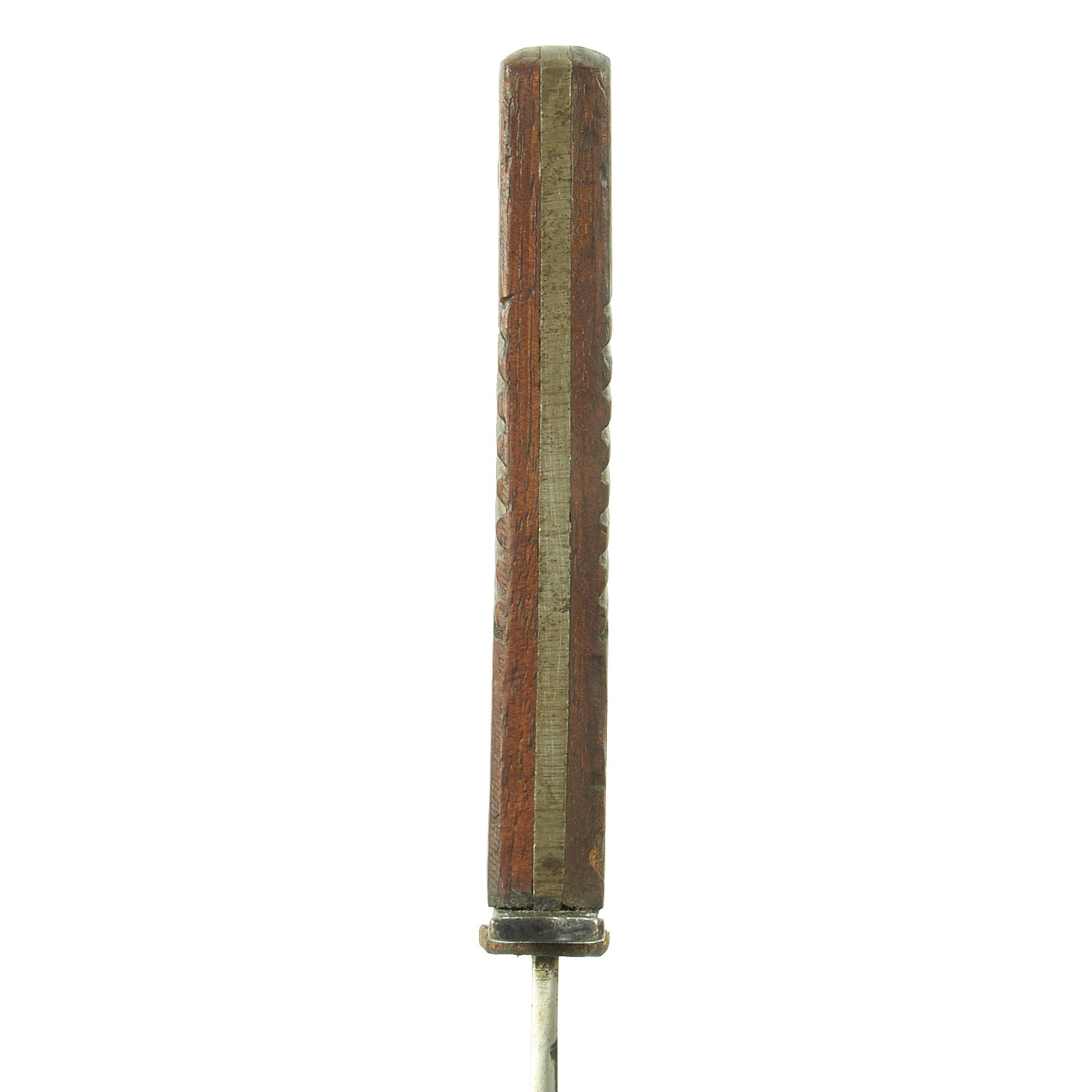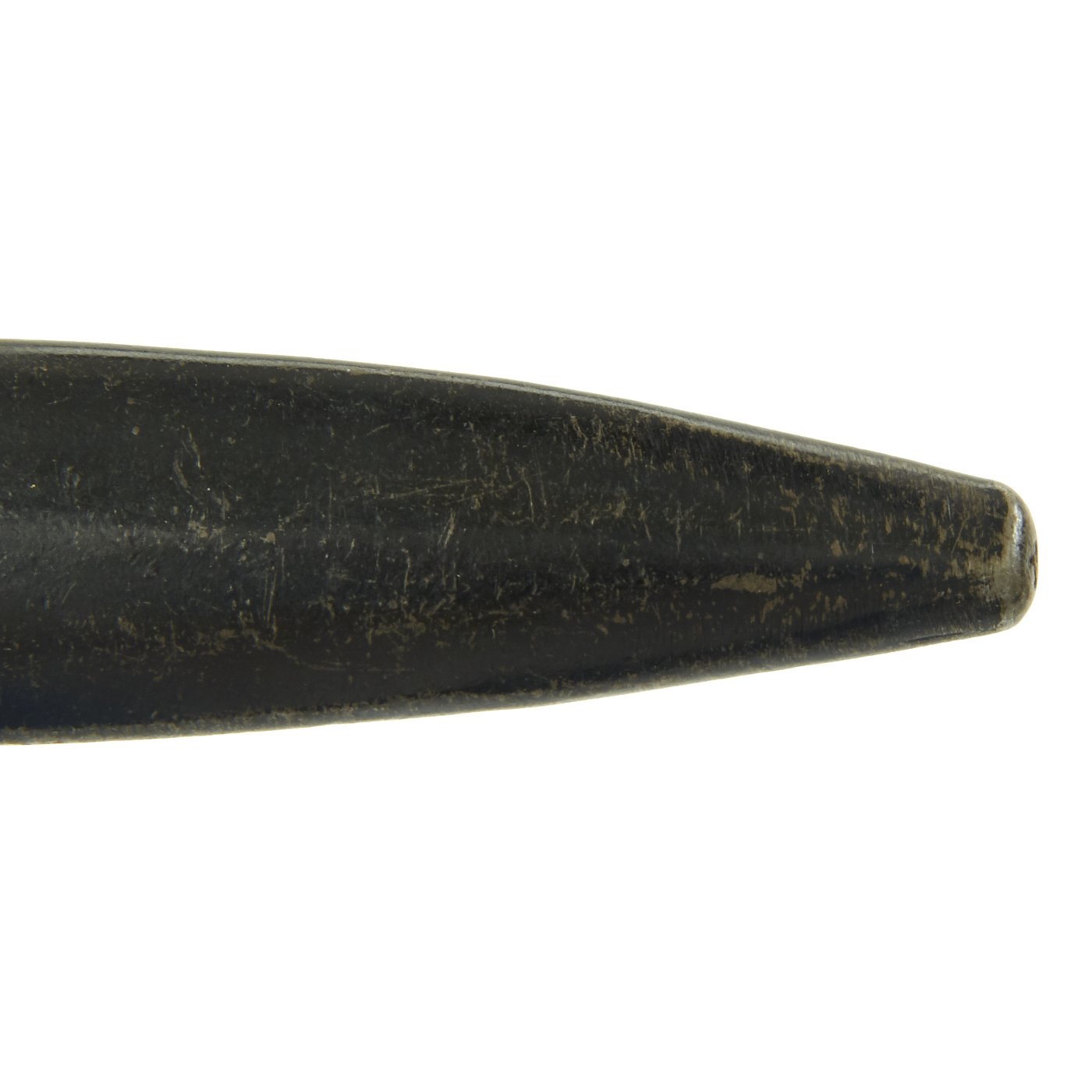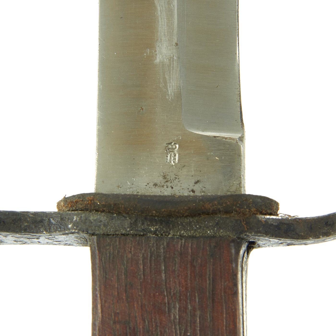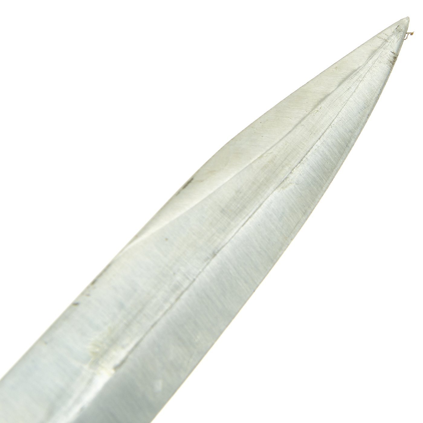 The condition of the blade is excellent, almost unissued. The original factory grind is still present, with a lovely shape and sharp blade, and the markings are still crisp. There is even still the original leather blade buffer next to the cross guard. The grip has a few dents, but overall does not appear to have been used much, if at all.