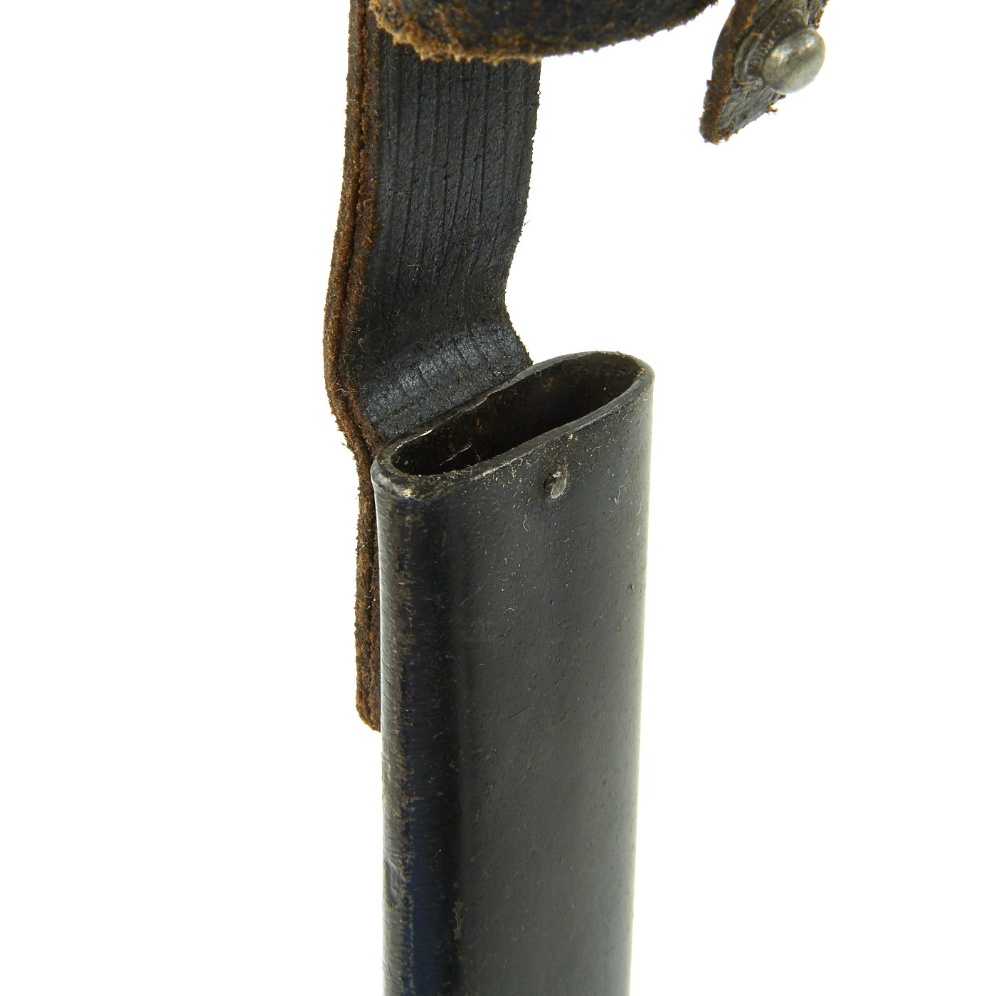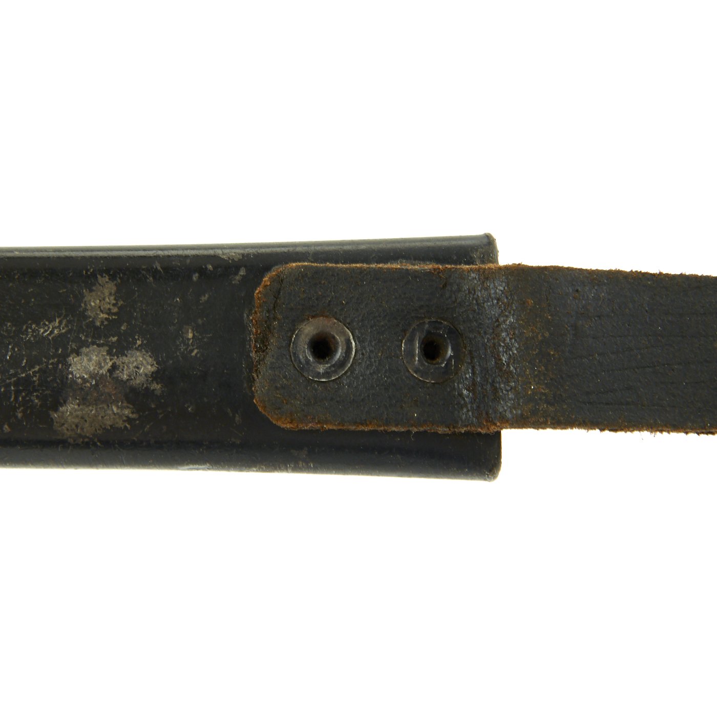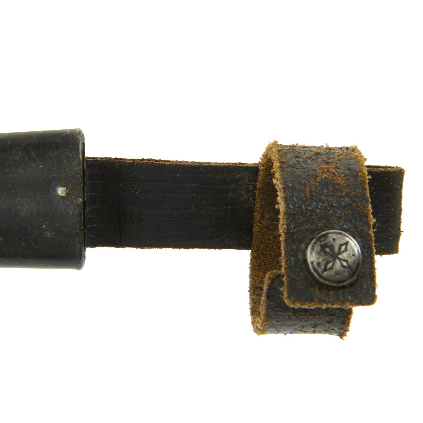 The knife comes in an genuine rolled steel World War One scabbard with leather belt loop and strap with ornate button closure. The original black finish is almost completely intact, and is very nice.