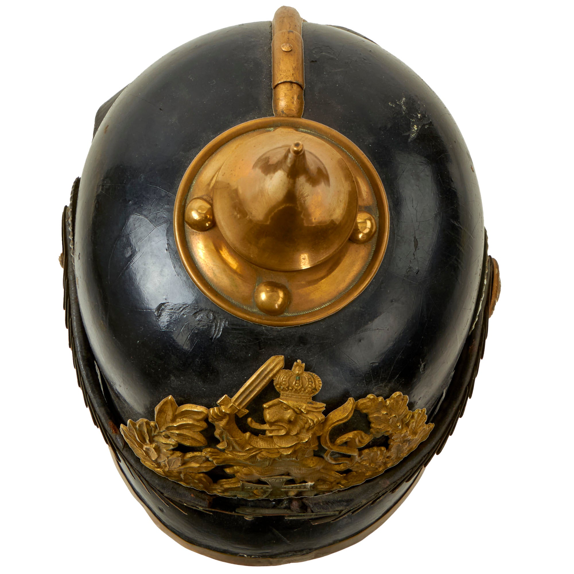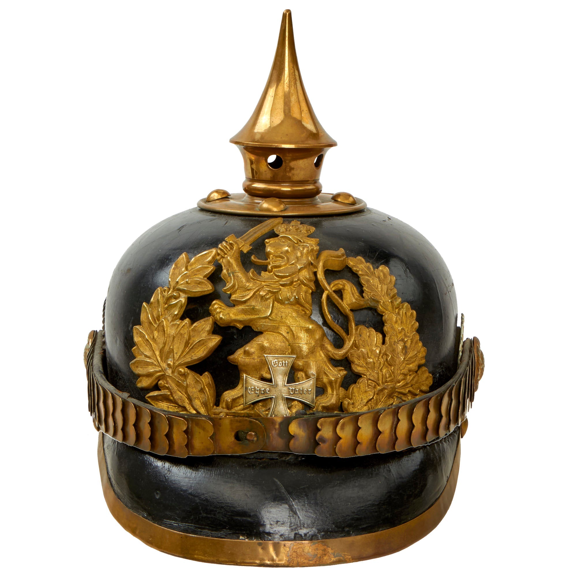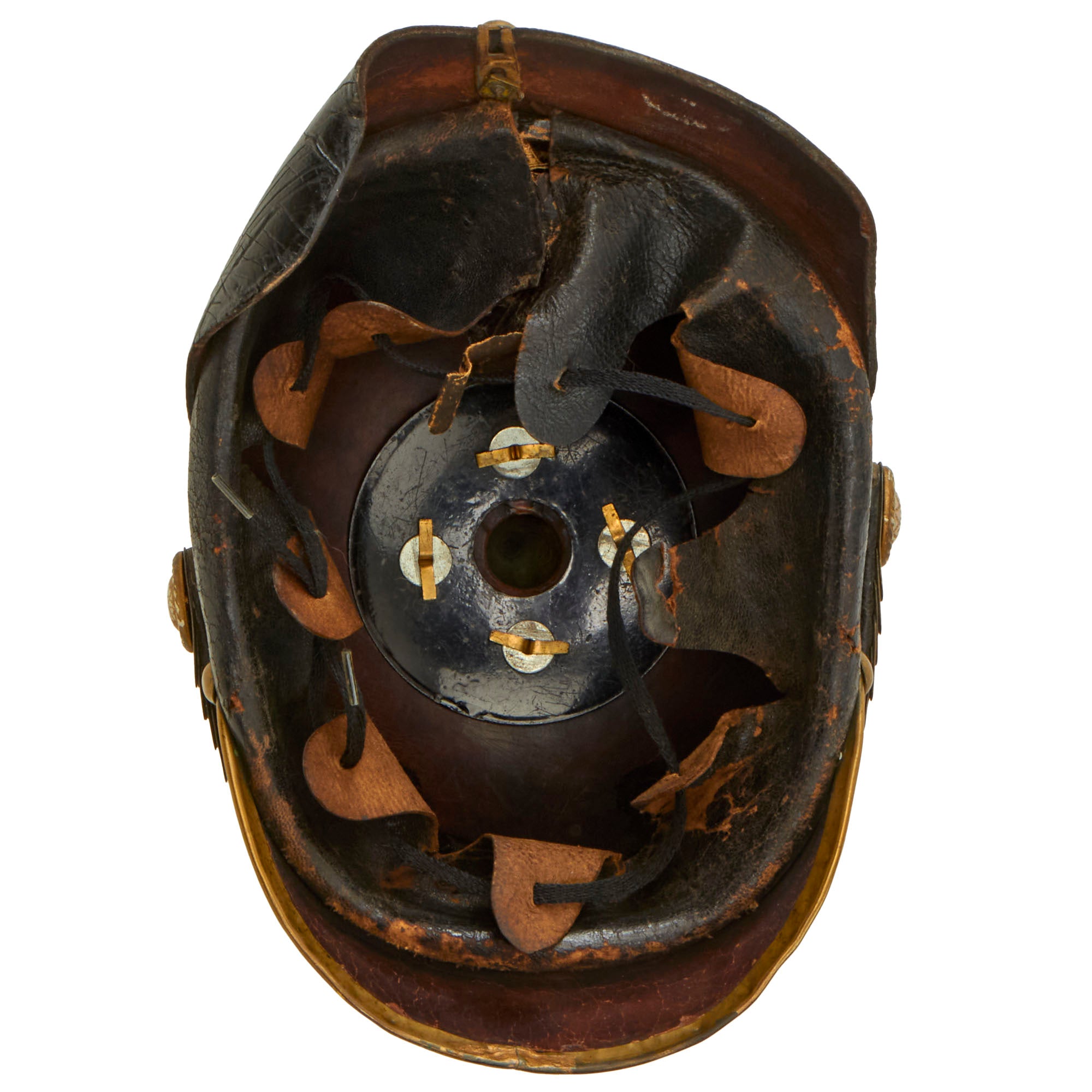 This helmet features a brass frontplate (wappen), and the crown of this leather helmet displays a vented enlisted removable spike mounted on a brass baseplate. There is also the small adjustable vent on the spine that supports the rear skirt, only seen on the enlisted helmets.