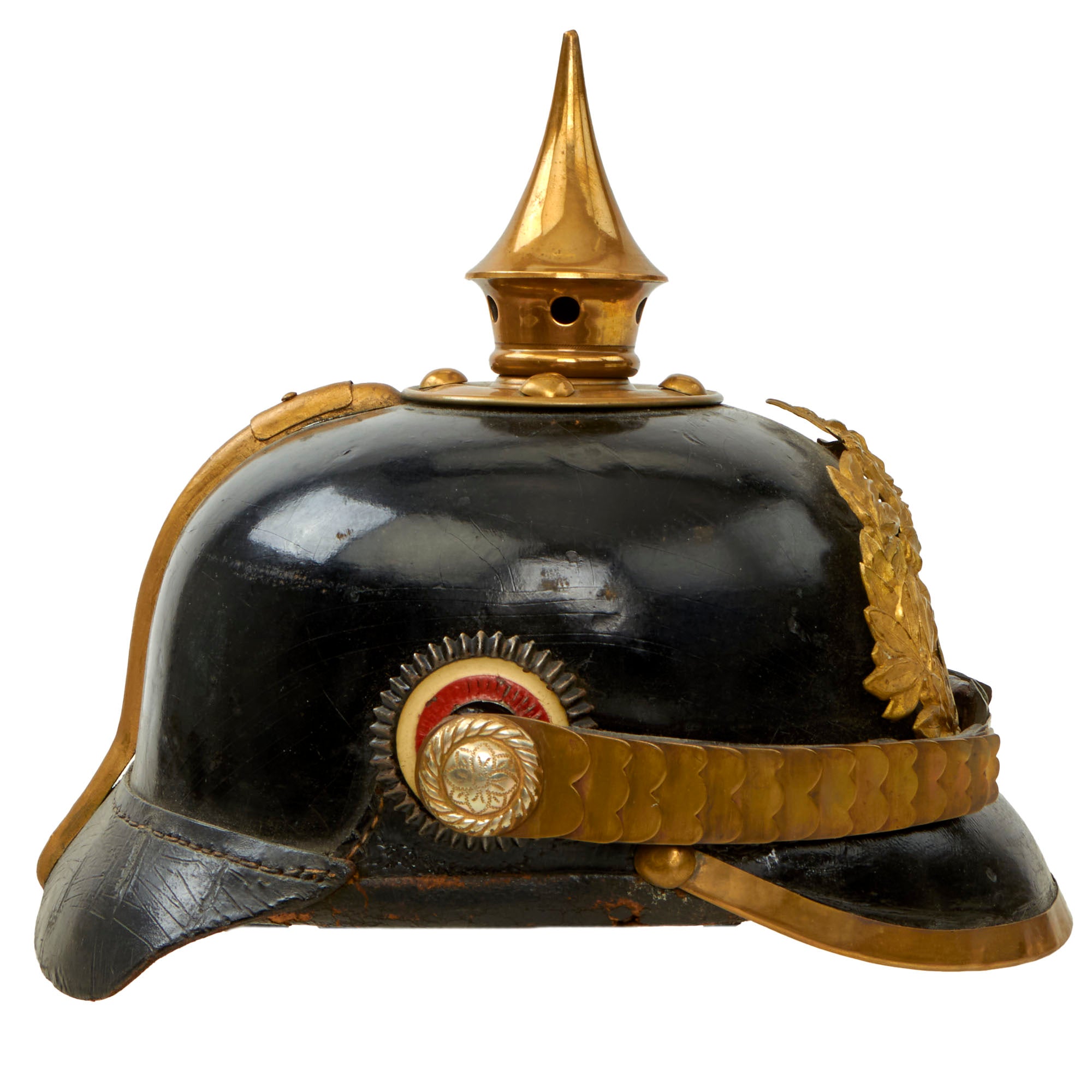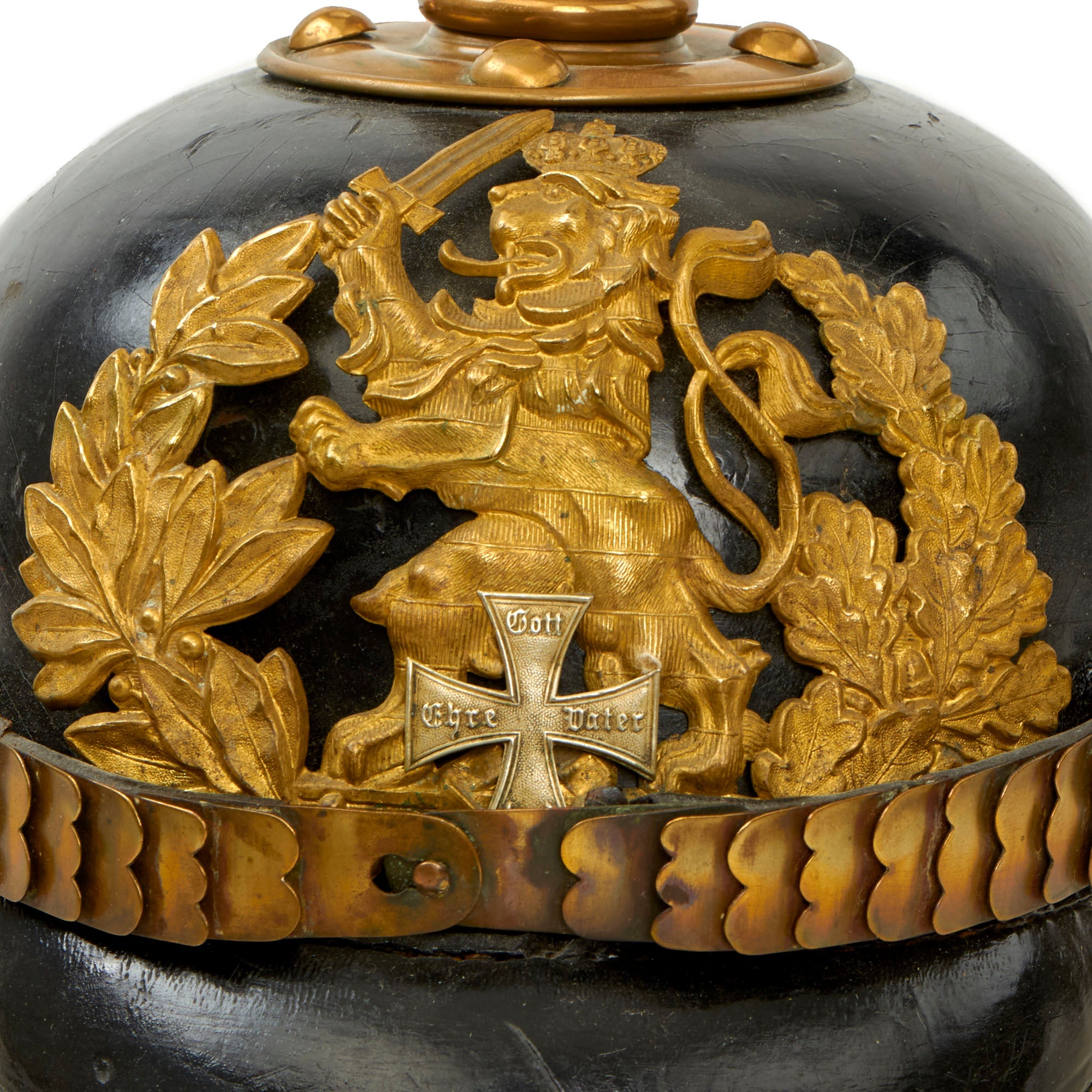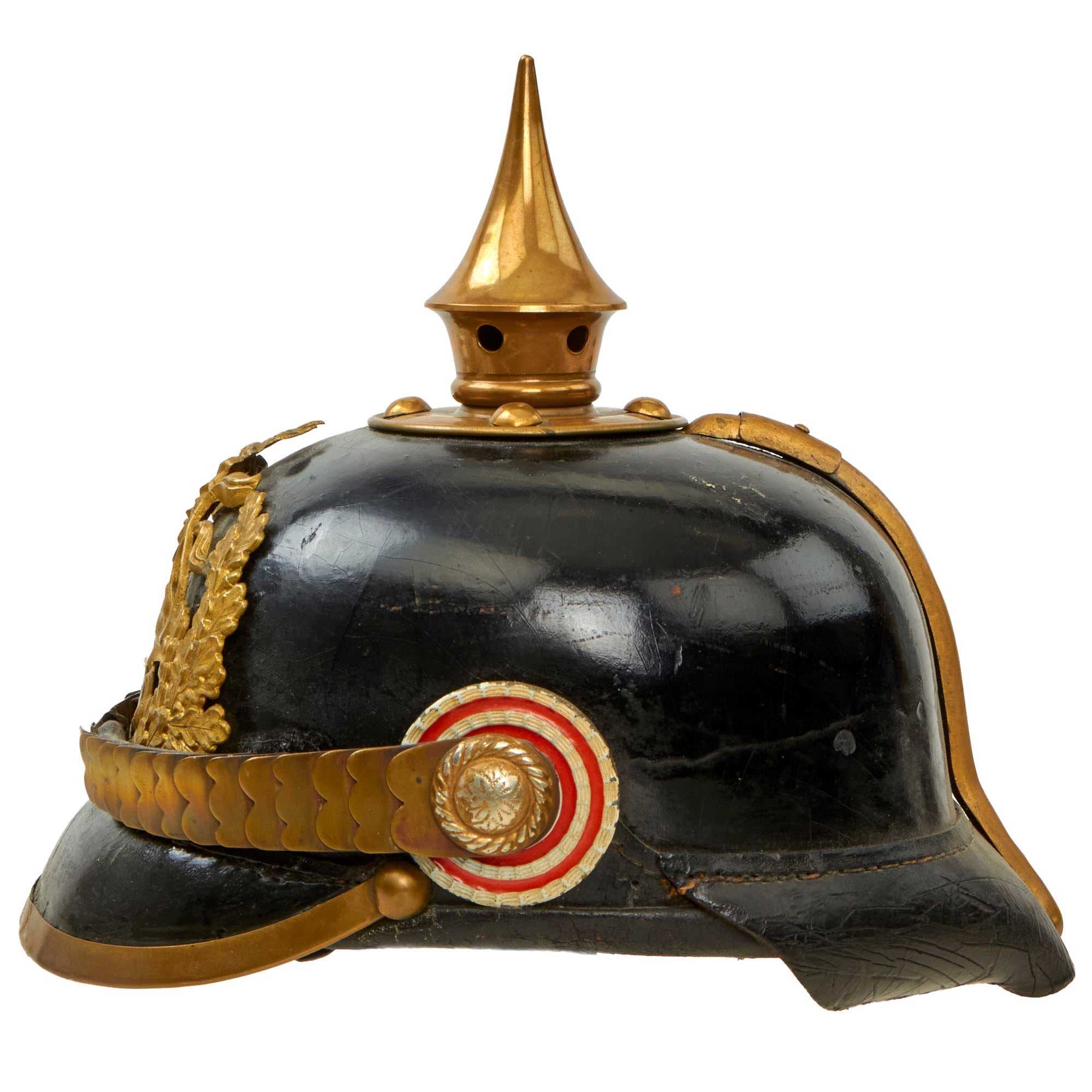 This helmet features a brass frontplate (wappen), and the crown of this leather helmet displays a vented enlisted removable spike mounted on a brass baseplate. There is also the small adjustable vent on the spine that supports the rear skirt, only seen on the enlisted helmets.