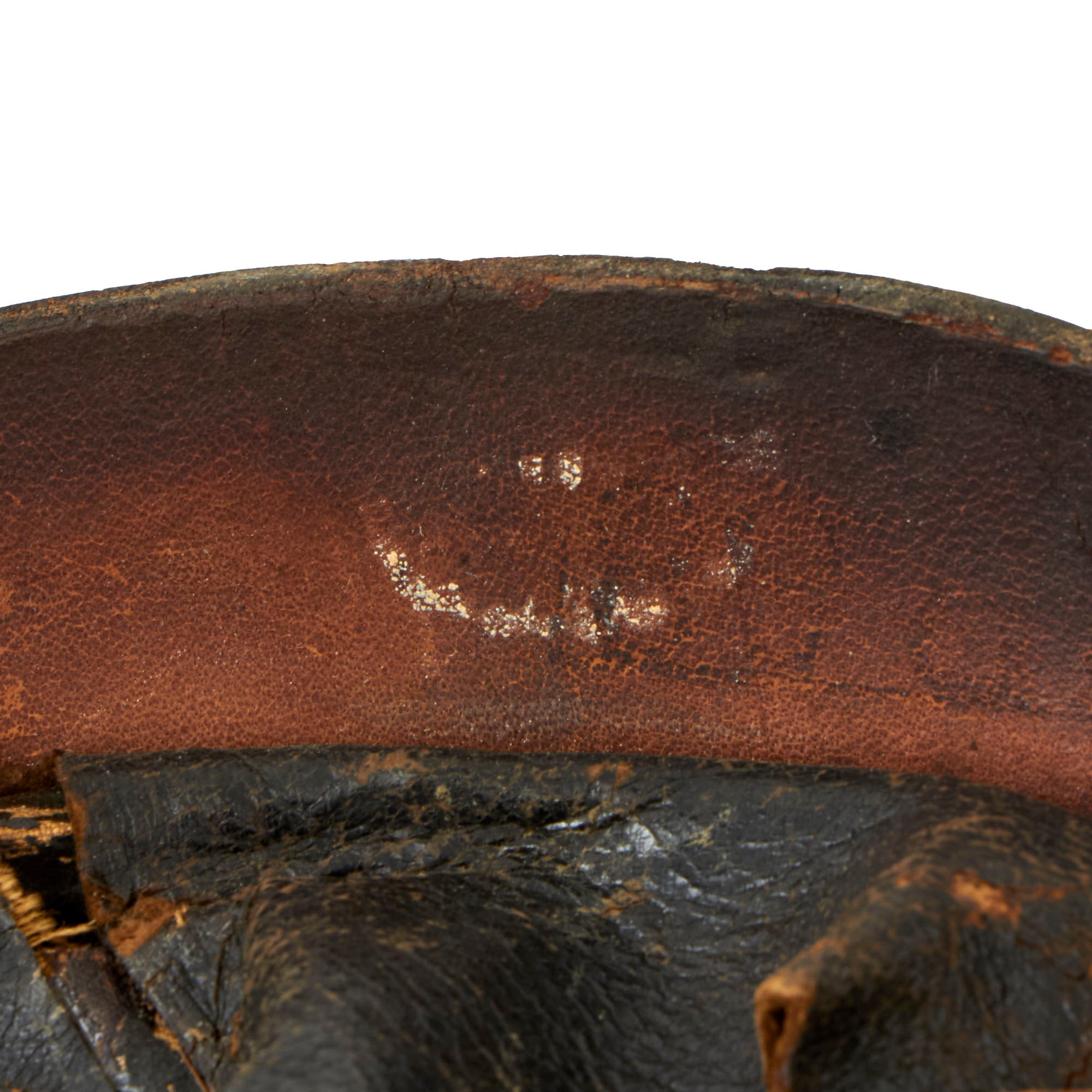 The interior features a nice original leather liner, which shows only light use. All fingers are intact, though there are minor repairs and the top string is a replacement. We could not find any legible markings.