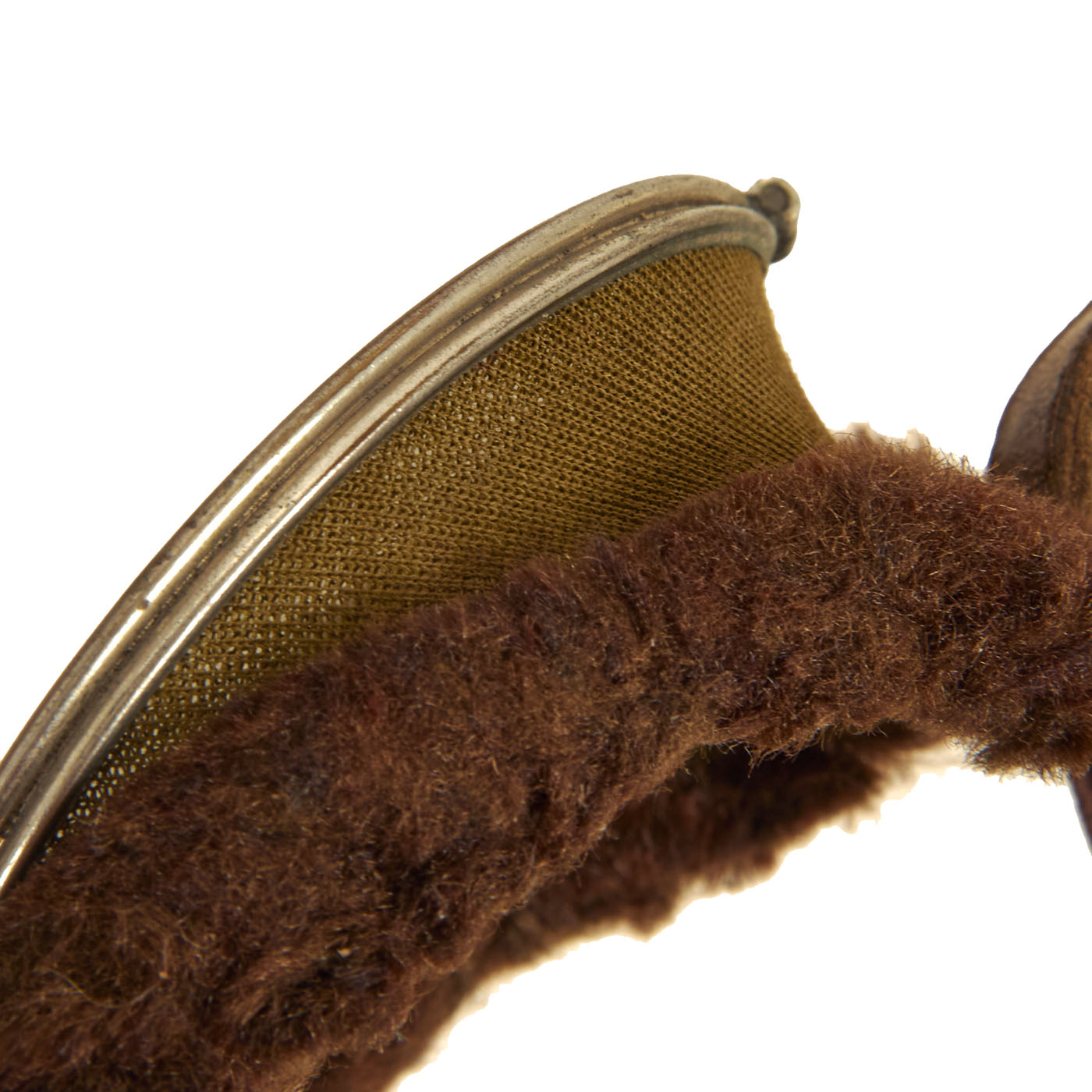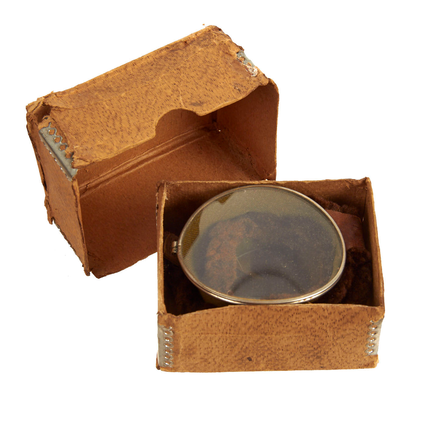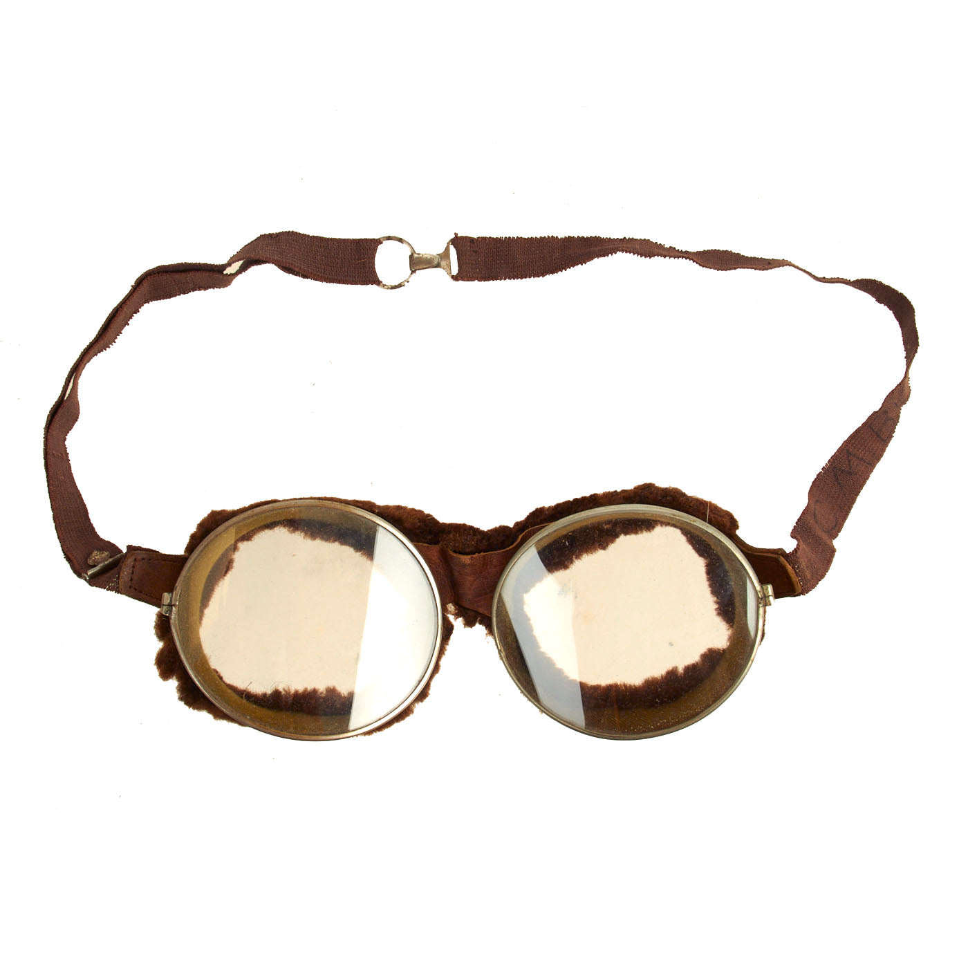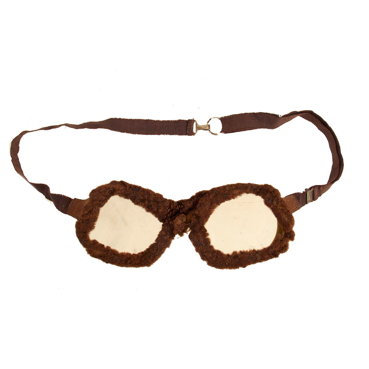 This is a lovely example of Imperial German flight goggles padded for comfort and warmth at the higher altitudes. The goggles show minor use or wear and appear to be complete. The elastic straps are undamaged but no longer retain their elasticity, which is common on items this old. The clear lenses are undamaged and the leather pieces are still soft and malleable. The original pressed paper box is in great condition and fits the goggles perfectly.