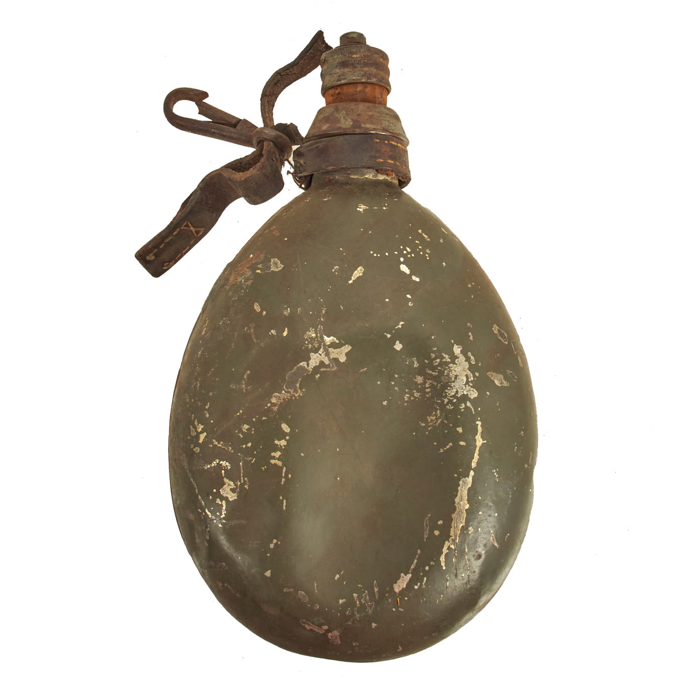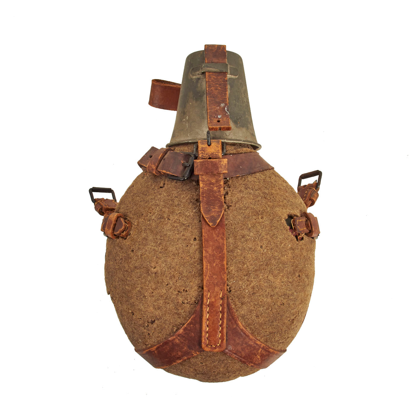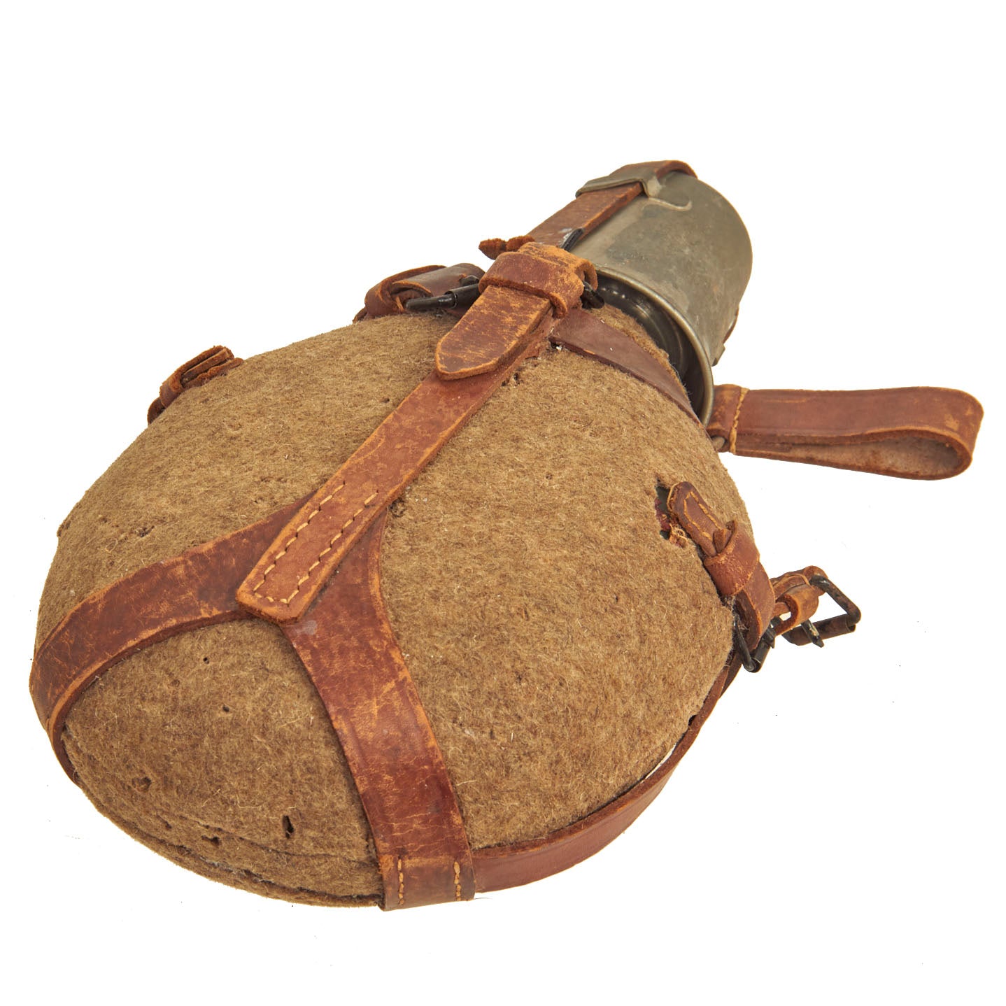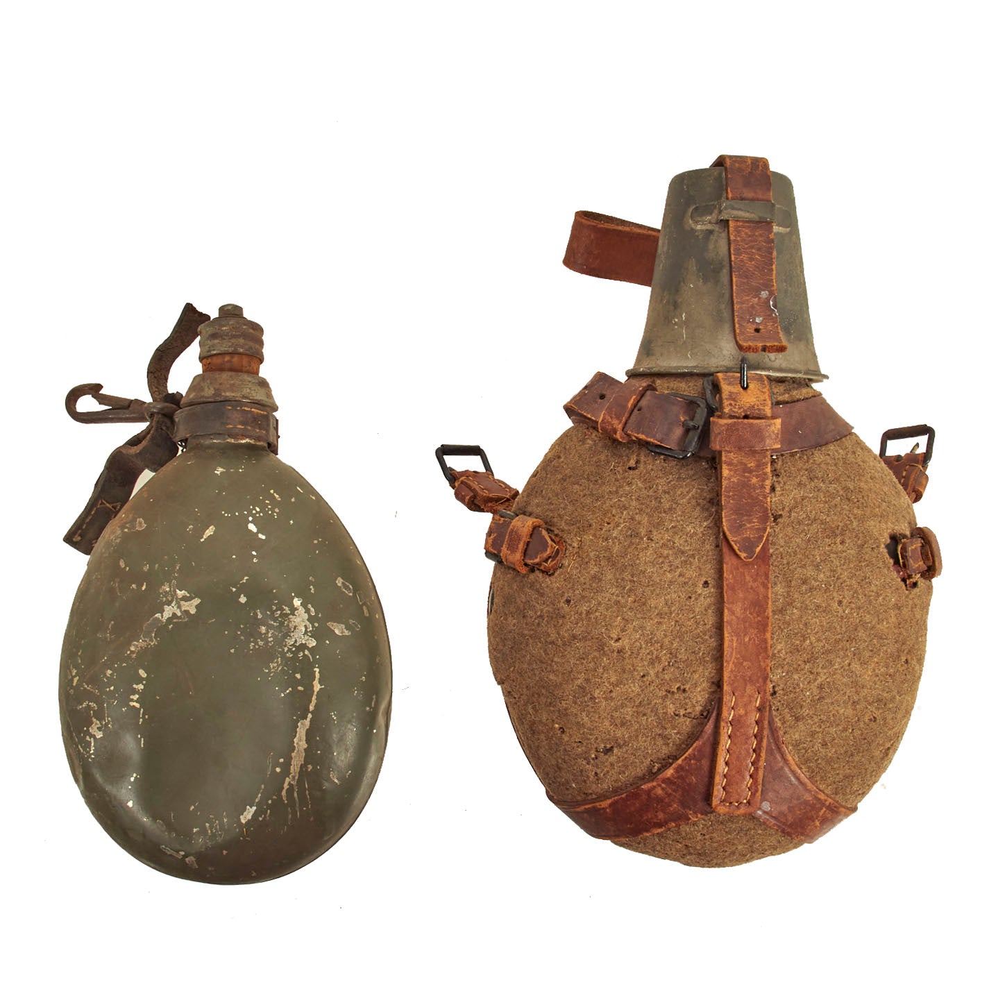 Original Items: Only One Lot of 2 Available. The typical canteens used by the Germans during the war were the M.1893 aluminum canteen with cork, the M.1907 screw-top Feldflasche and the enameled steel M.1915 model Feldflasche with cork stoppers.