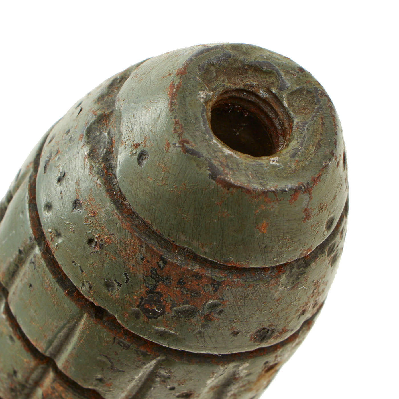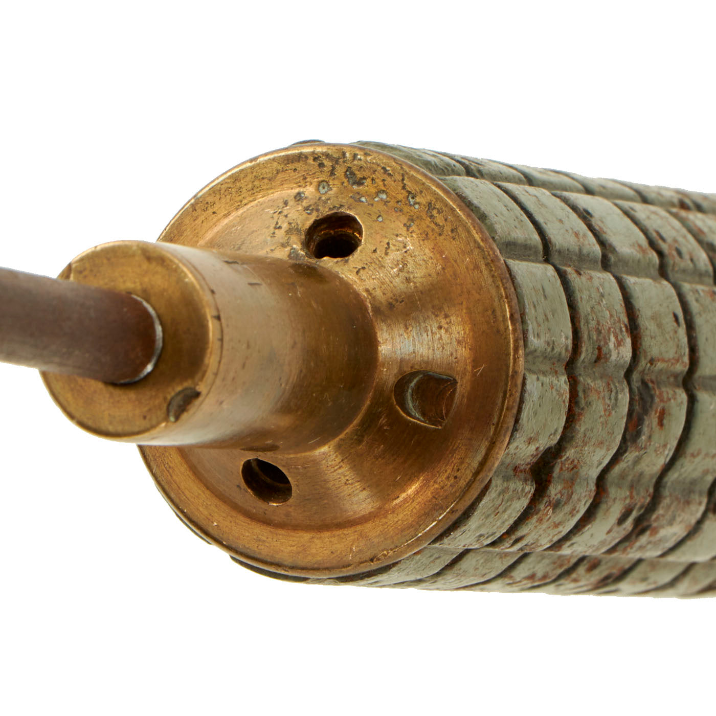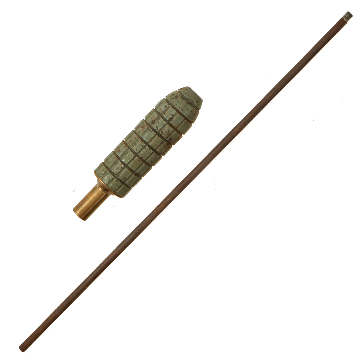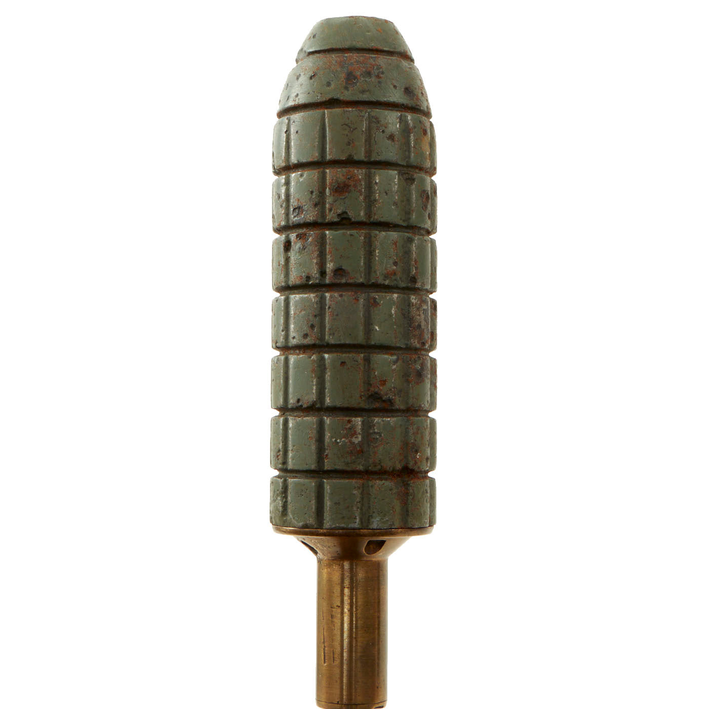 As with most early "rod" type rifle grenades, the original rod was removed from this example long ago. A replica made from solid bar stock, aged to match, has been attached to the bottom of the grenade to complete the look.