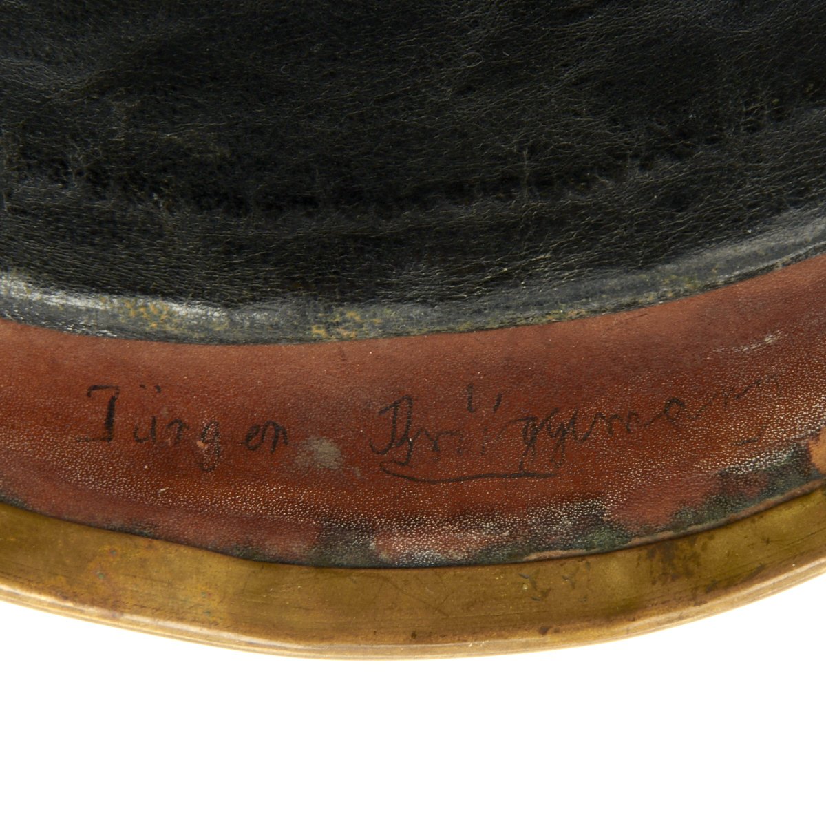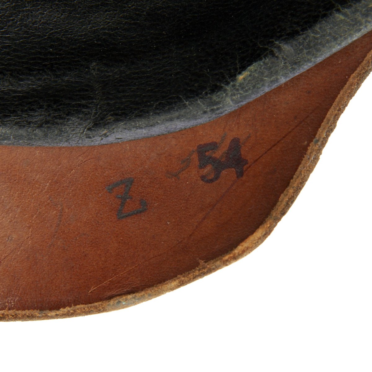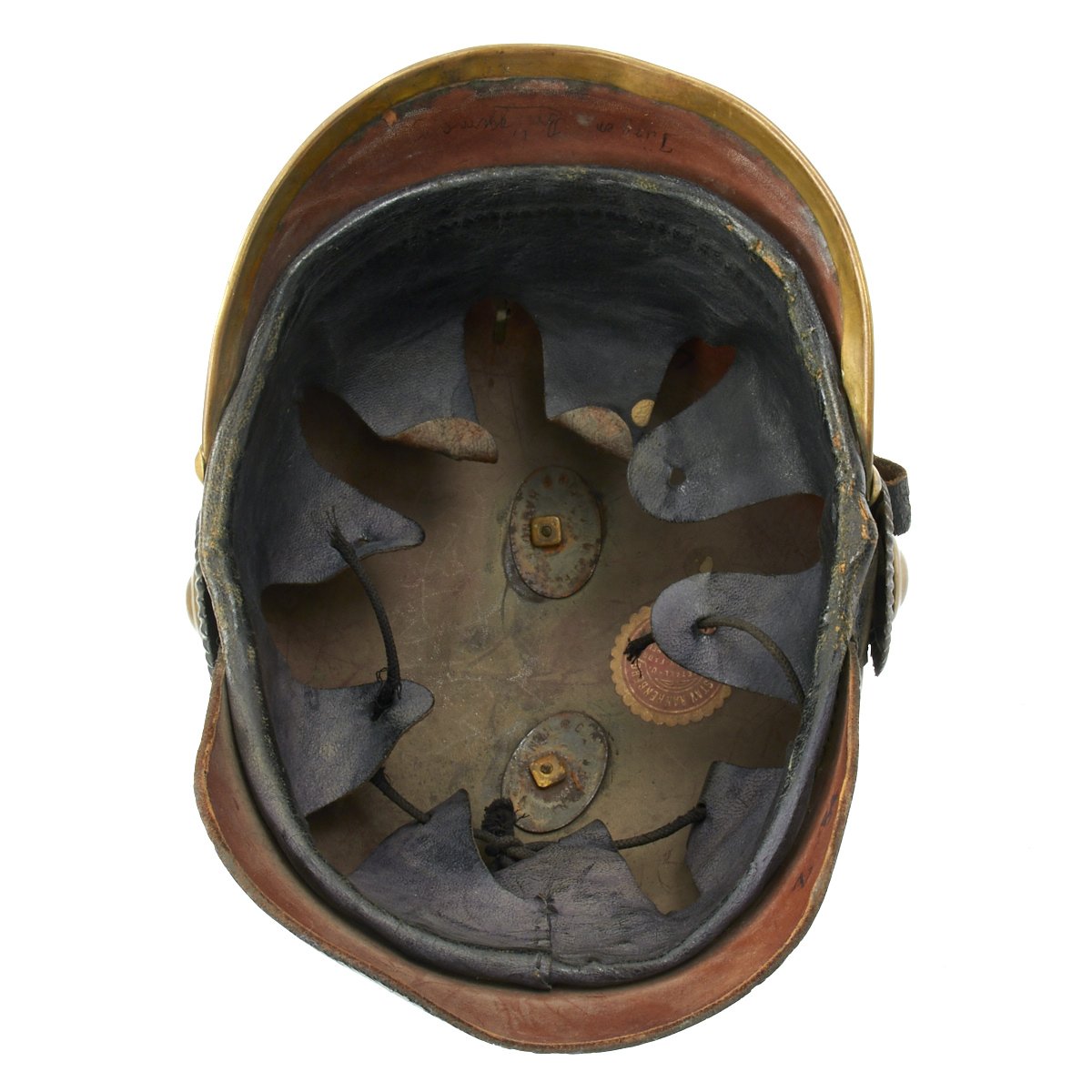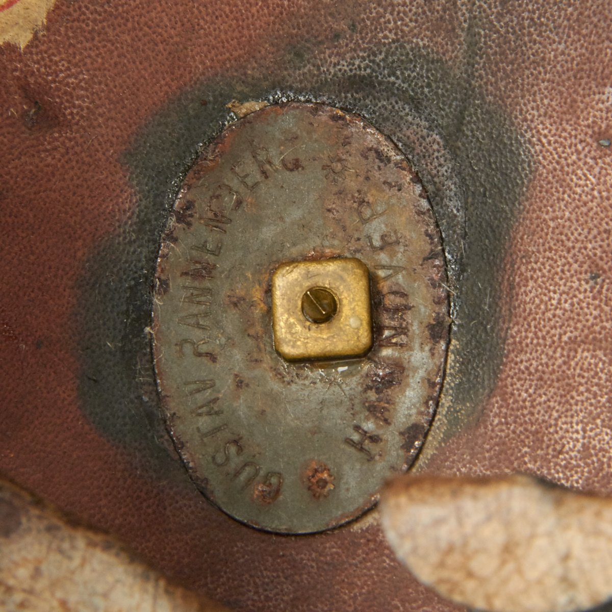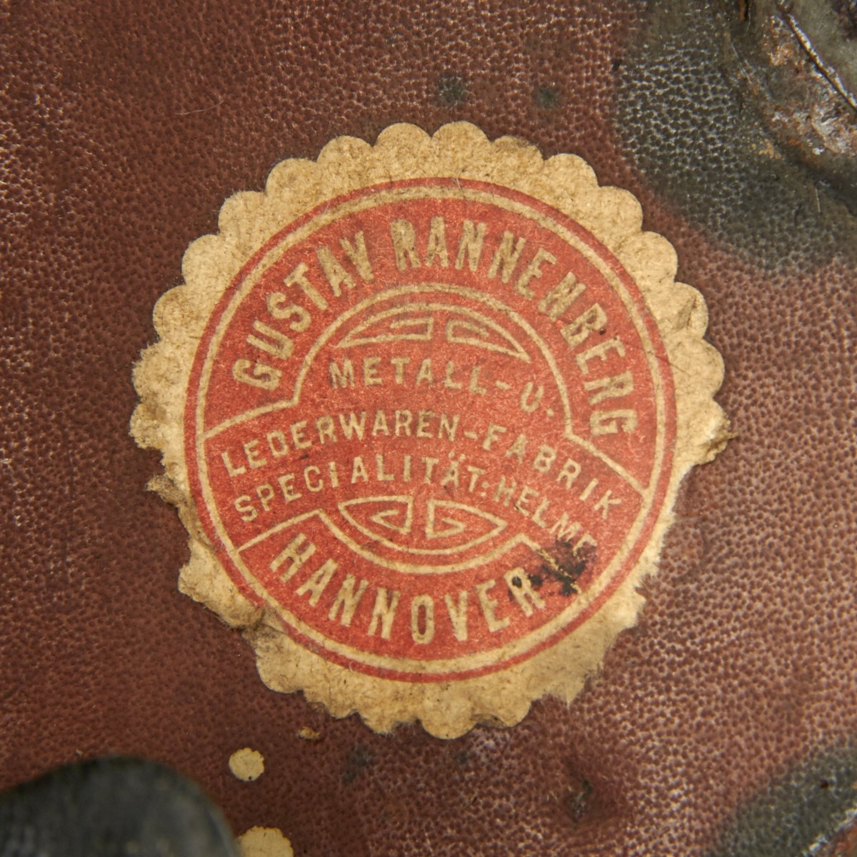 Full leather lining is still intact as is chinstrap and is complete with correct cockades. Circa 1890 to 1900. Condition overall is excellent. Interior crown has original maker label for Gustav Rannenberg of Hannover. The comb anchor is also marked by the same maker. The underside of the front visor is named in ink but difficult to read; it is Jurgen something.