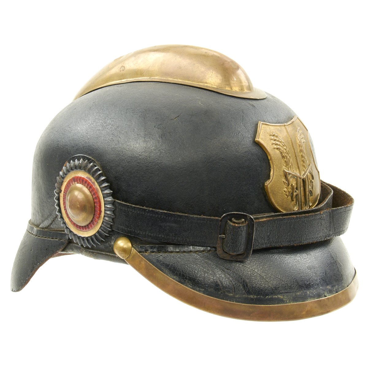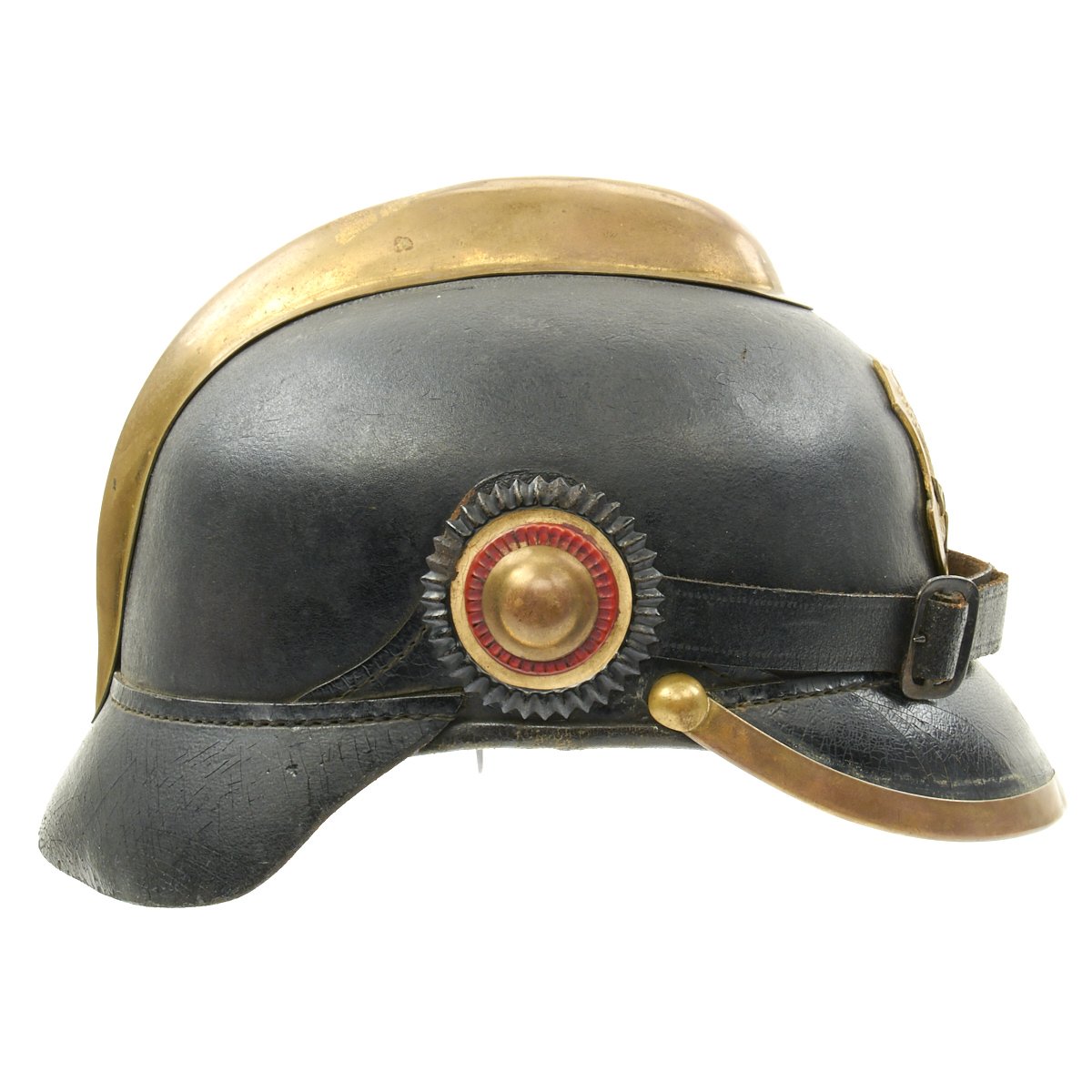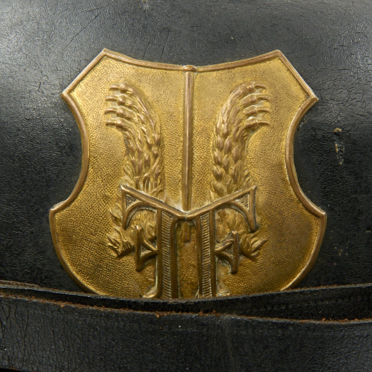 Original Item: Only One Available. Excellent condition, turn of the century pickelhaube leather body with bras front plate, brass central comb, and brass fittings. Central plate has two opposing claws with mirrored FF symbol.