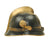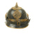 Original Item: One Only. Turn of the century pickelhaube style leather body with brass front and rear peaks with brass trim and fittings. Lion's head side bosses. Front badge reads