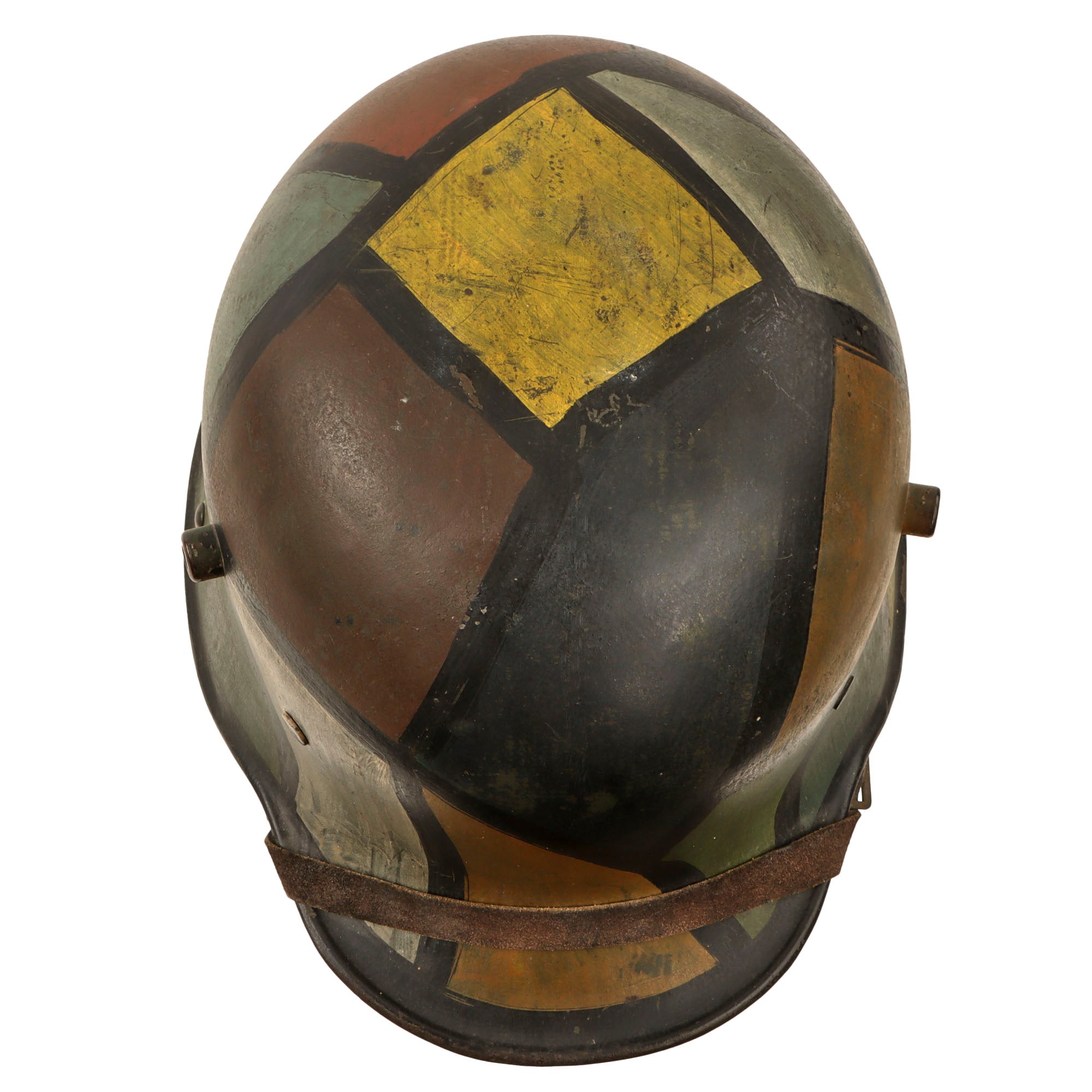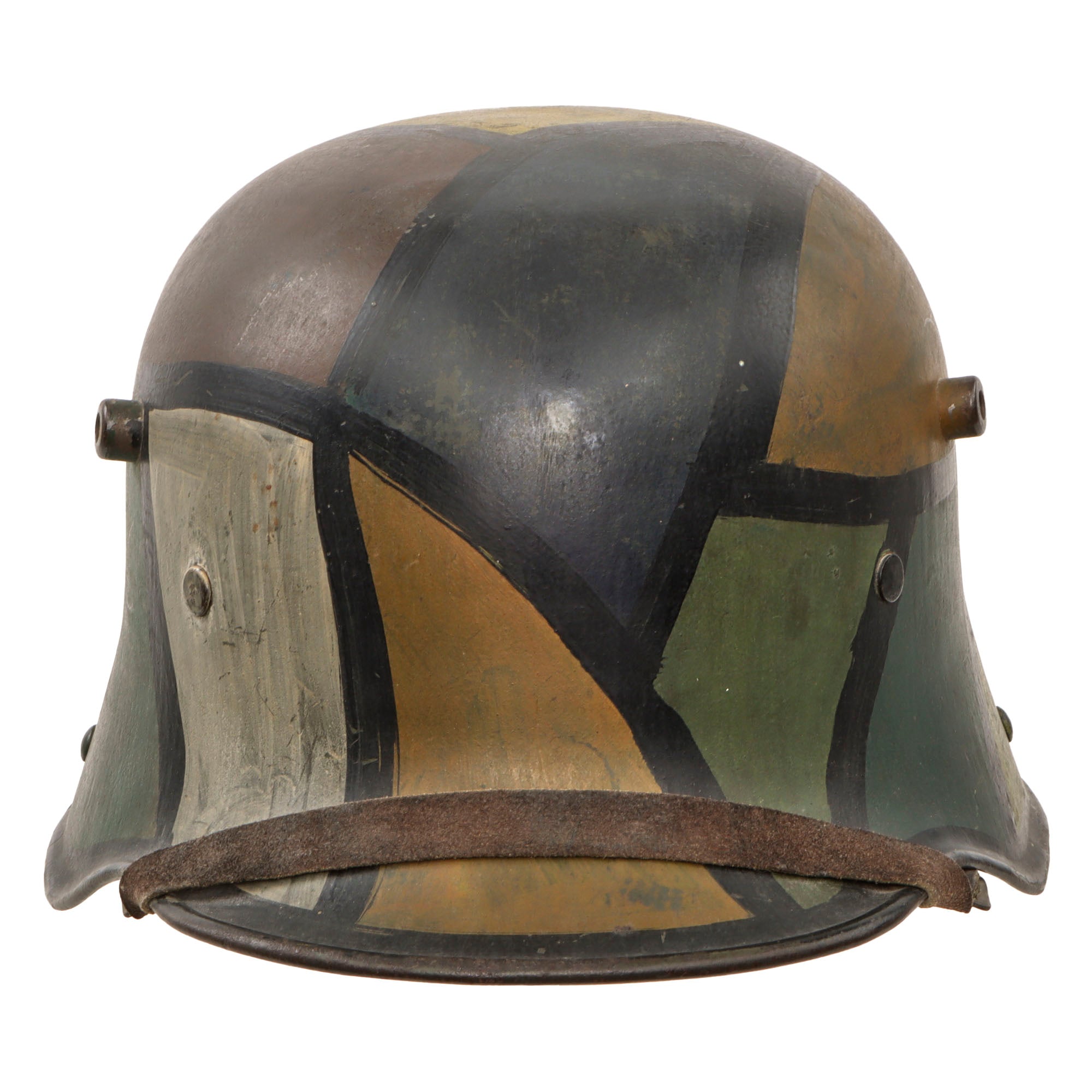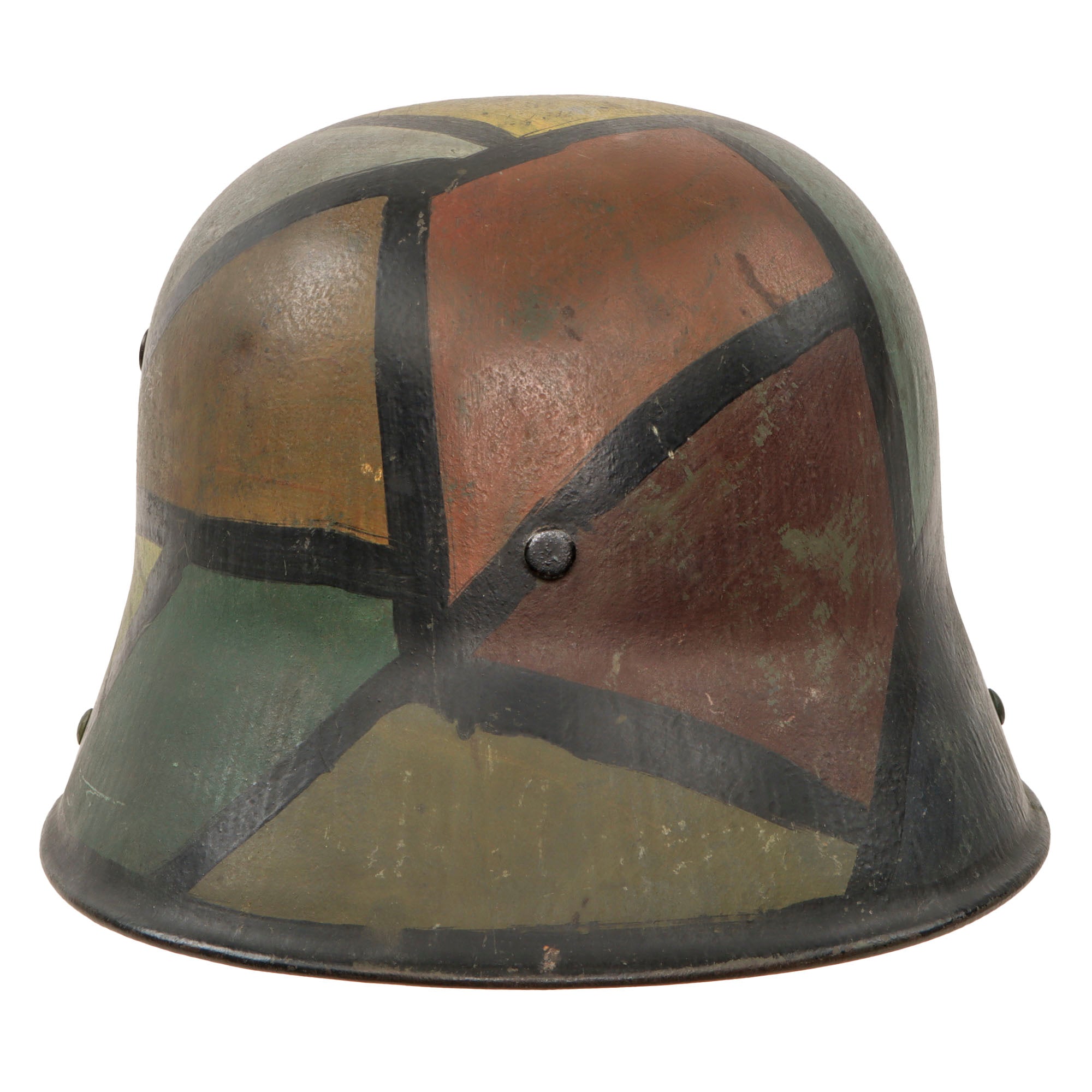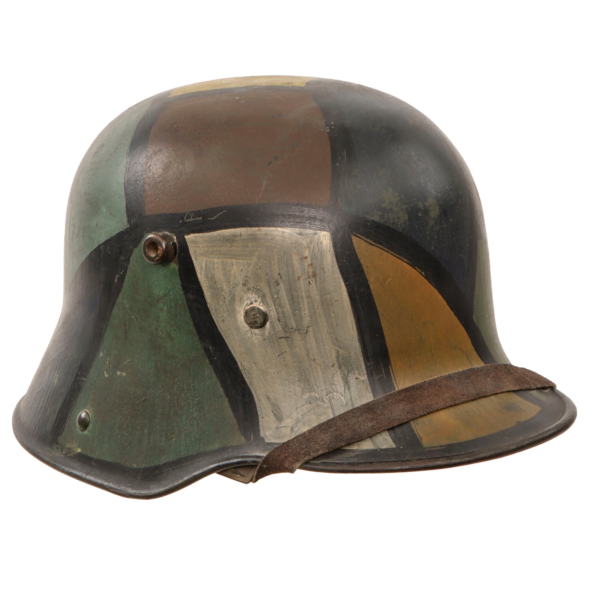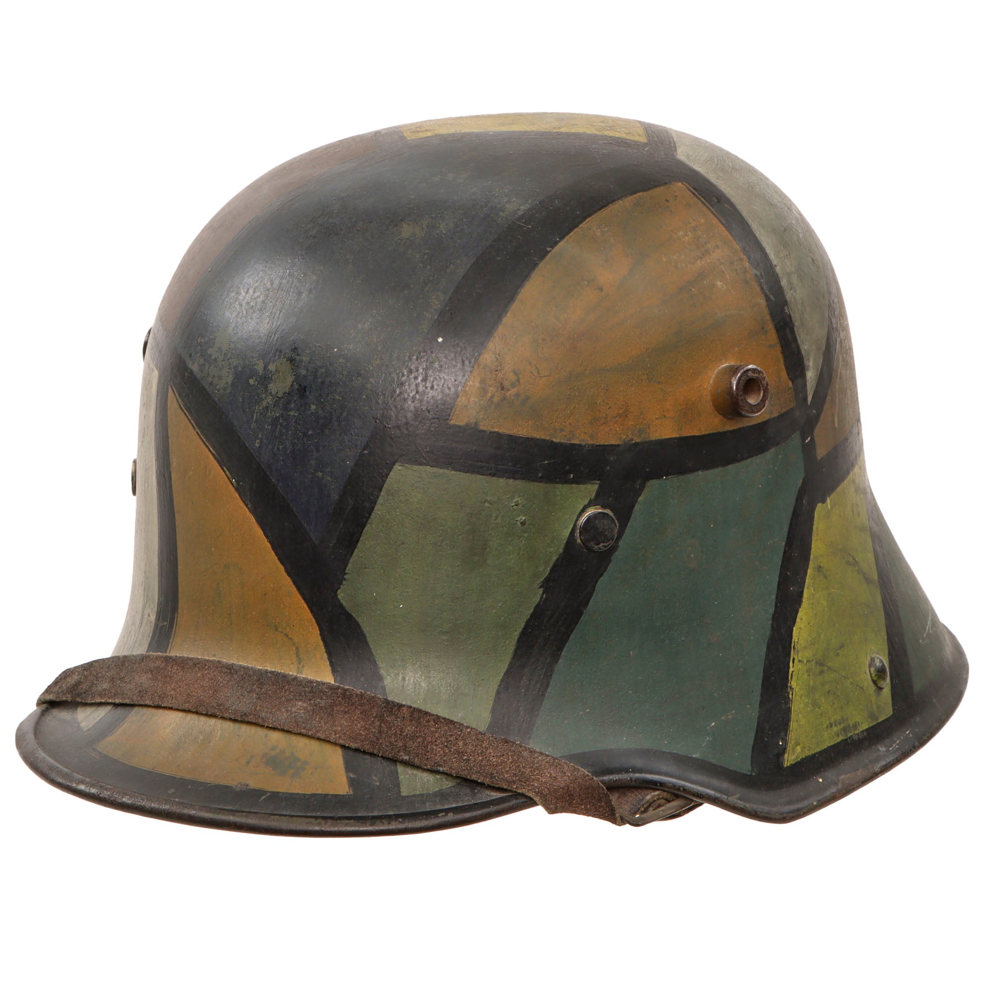 Original Item: Only One Available. This is a very nice example of a totally original WWI German M16 Helmet, with a nice reproduced "paneled" camouflage paint scheme. This was a very popular type of camouflage used on both sides of WWI. It has been reproduced on this helmet with panels of blue, yellow, green, white, brown, and red, with black separating lines. This was likely done by a re-enactor. The stamped, sheet steel construction helmet retains its original three-pad liner with all three retaining the original pillows. The chinstrap stretched taut over the brim appears to be a very good reproduction which has been aged.