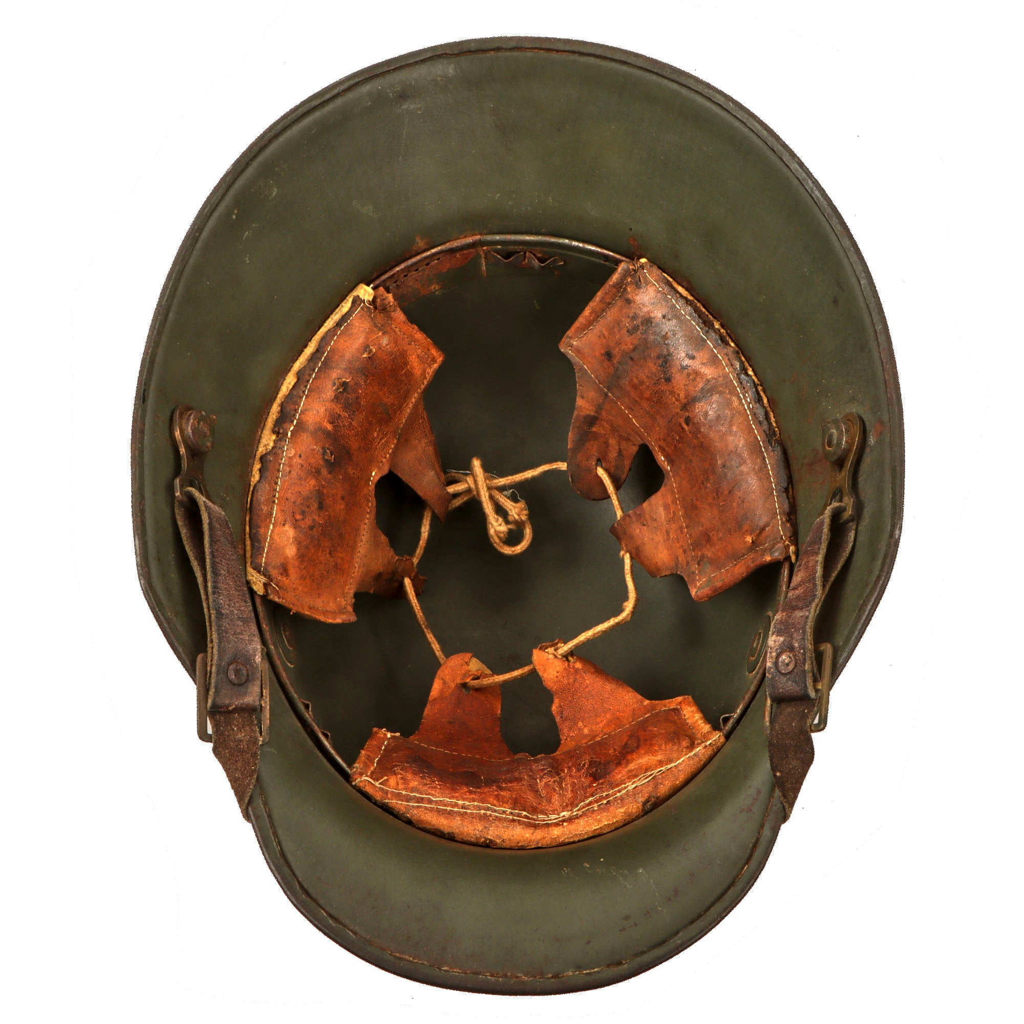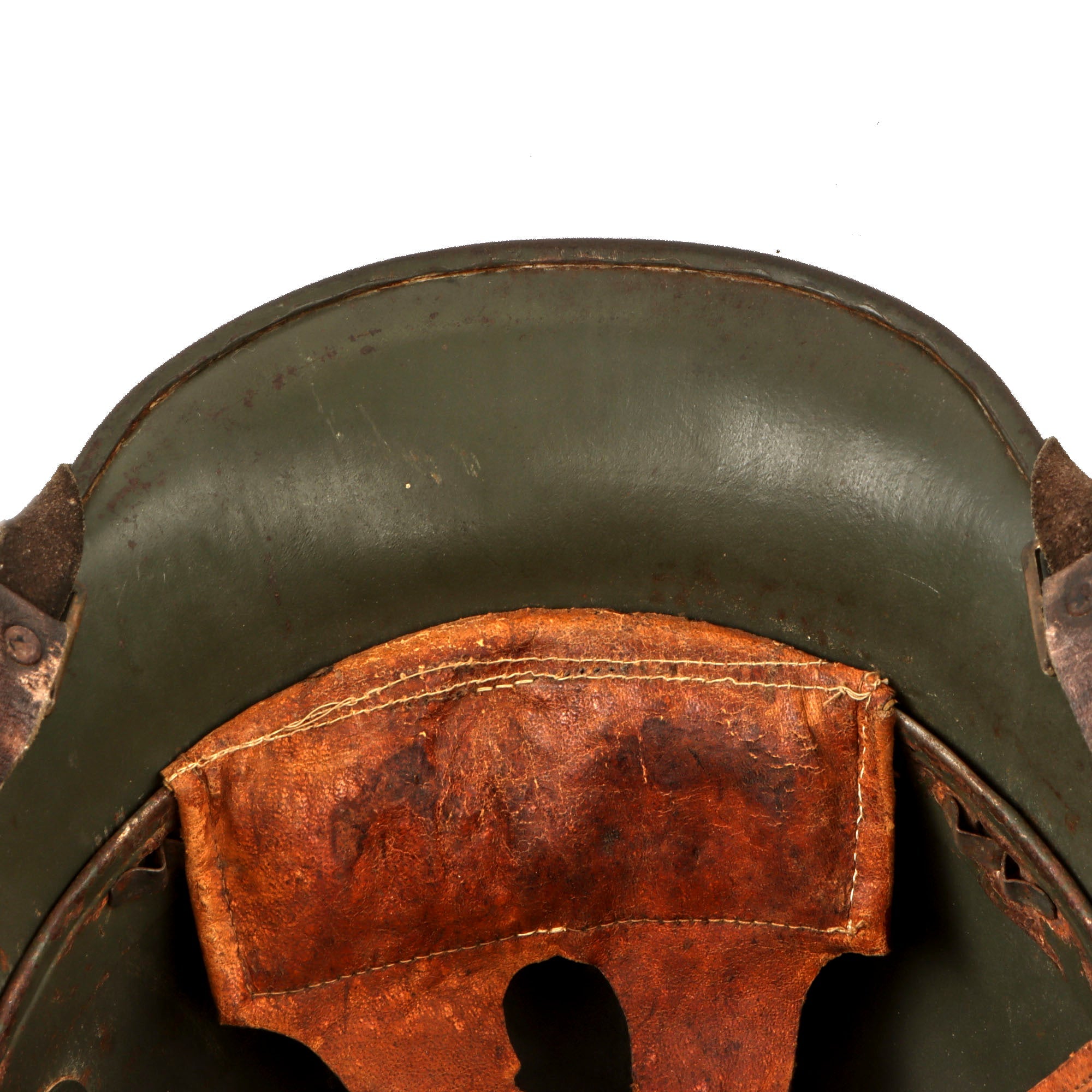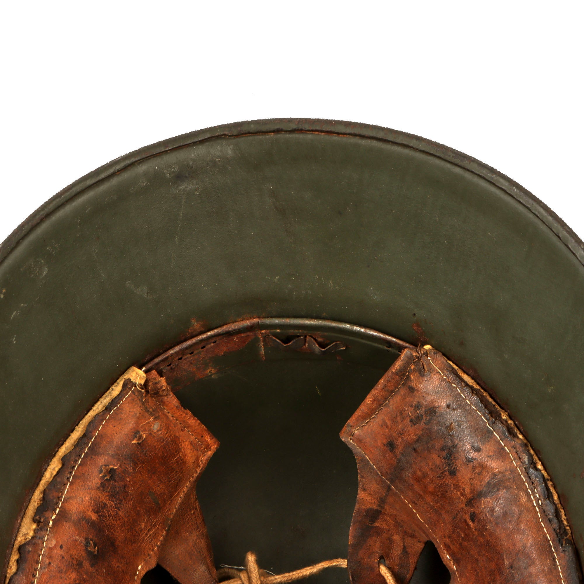 The shell came in different sizes, from 60 to 68, with some size 70s reported. The suspension, or liner, consisted of a headband with three segmented leather pouches, each holding padding materials, and leather or fabric cords could be adjusted to provide a comfortable fit. The one-piece leather chinstrap was attached to the shell by M1891 chinstrap lugs, the same kind used in the Pickelhaube helmet.