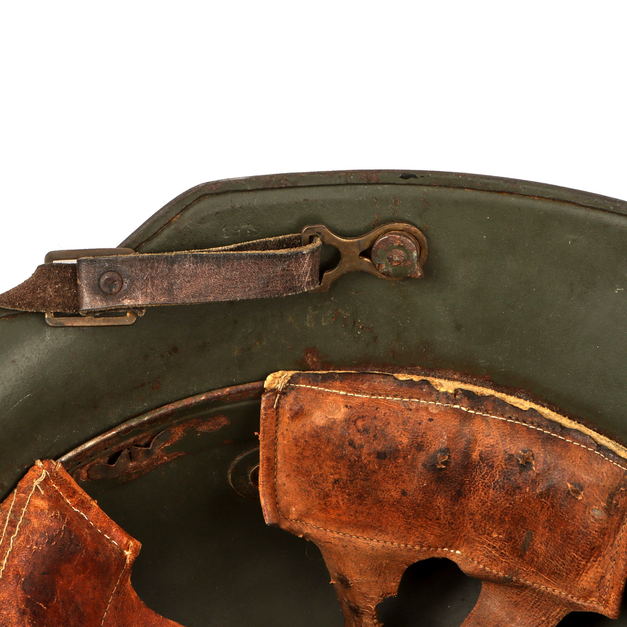 The helmet still has both of the dome headed chinstrap retaining rivets, which hold the interior pickelhaube style chin strap lugs in place, and the end pieces of the chinstrap are still retained on both rivets.. The shell also retains both of the extended ventilation side lugs, which are the correct short version without any step for the larger size 66 shell. This would ensure proper installation of a Stirnpanzer brow plate regardless of shell size.