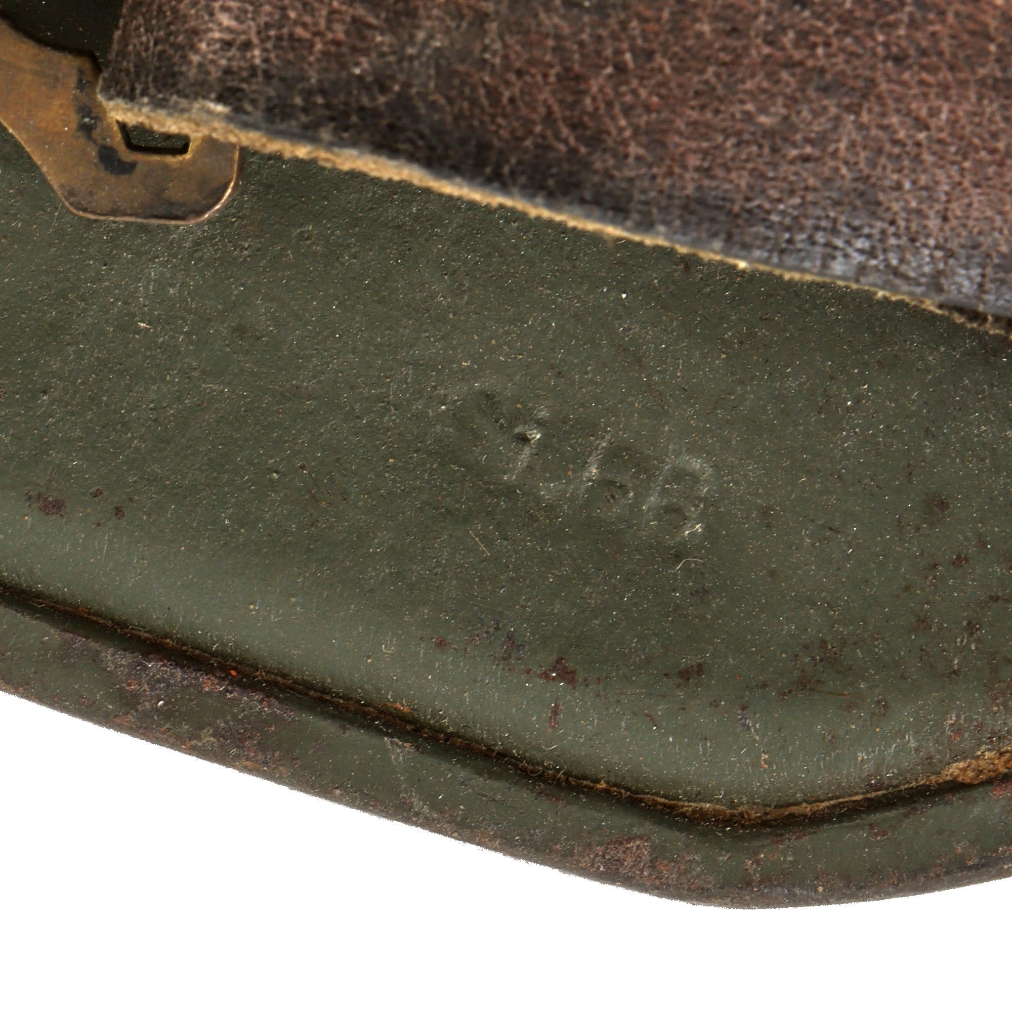 The helmet is stamped next to one of the chinstrap bales Si 66, for the maker Eisenhuette Silesia, Paruschowitz Oberschlesien. This is a relatively uncommon maker to find, as they only produced shells in sizes 62 and 66. Size 66 is a nice large size that can accommodate liners from 58cm to 60cm or US 7 1/4 to 7 1/2. There is a rolling mill mark dome stamp of B i 301, indicating that Bismarckhutte in Oberschlesien made the steel. This is the usual dome stamp for an "Si" marked helmet.