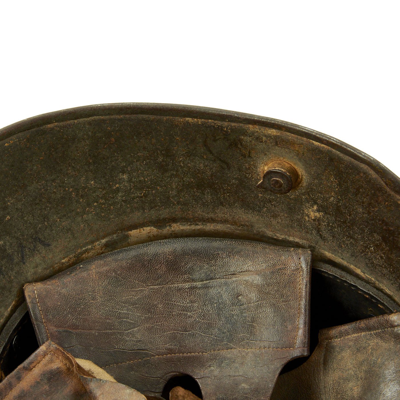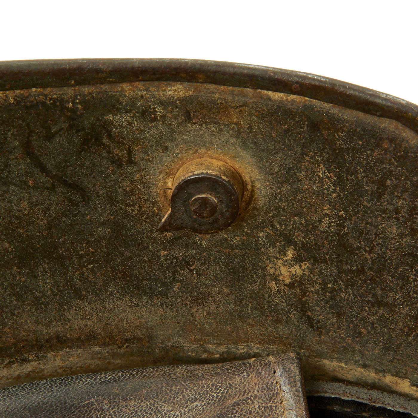 The liner is still intact, and is the early war type with a leather liner band, and three leather panels. The leather is in good shape, but the top string is missing, easily replaced. The original padding is still present in the pockets behind the panels. The helmet retains all three of the liner split pins, with the correct larger rear pin.