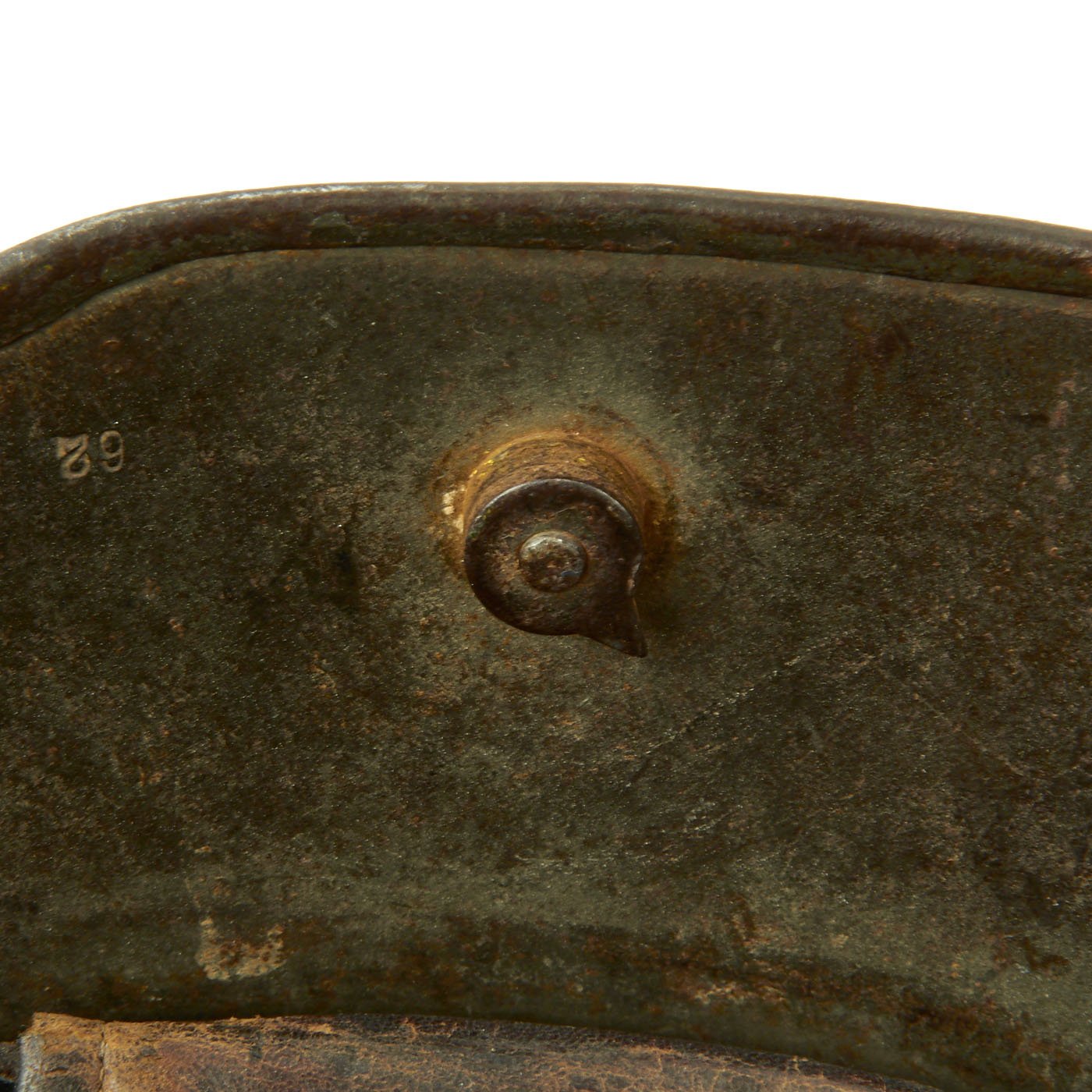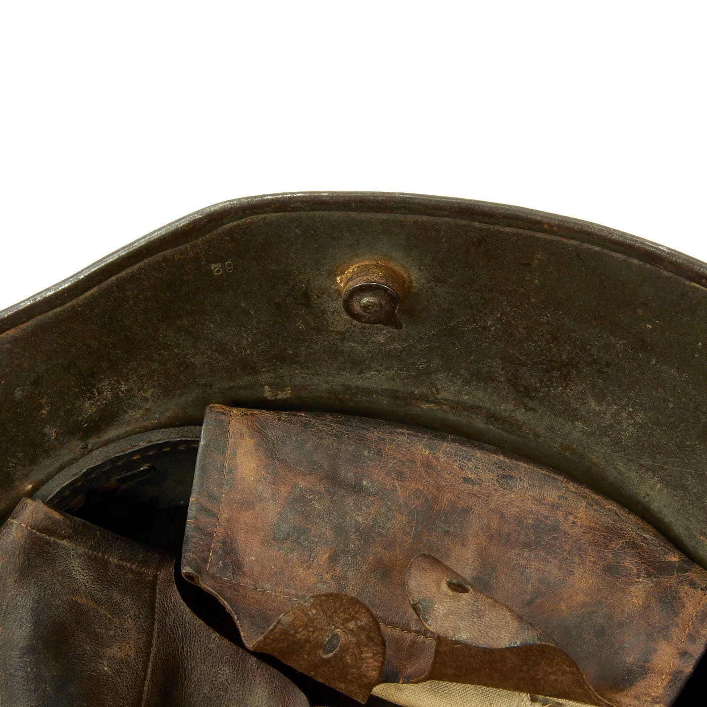 The shell came in different sizes, from 60 to 68, with some size 70s reported. The suspension, or liner, consisted of a headband with three segmented leather pouches, each holding padding materials, and leather or fabric cords could be adjusted to provide a comfortable fit. The one-piece leather chinstrap was attached to the shell by M1891 chinstrap lugs, the same kind used in the Pickelhaube helmet.